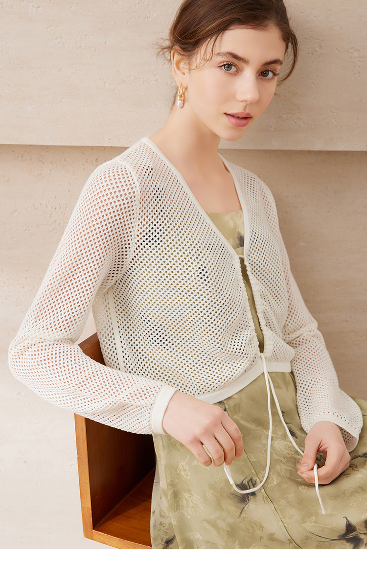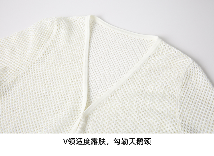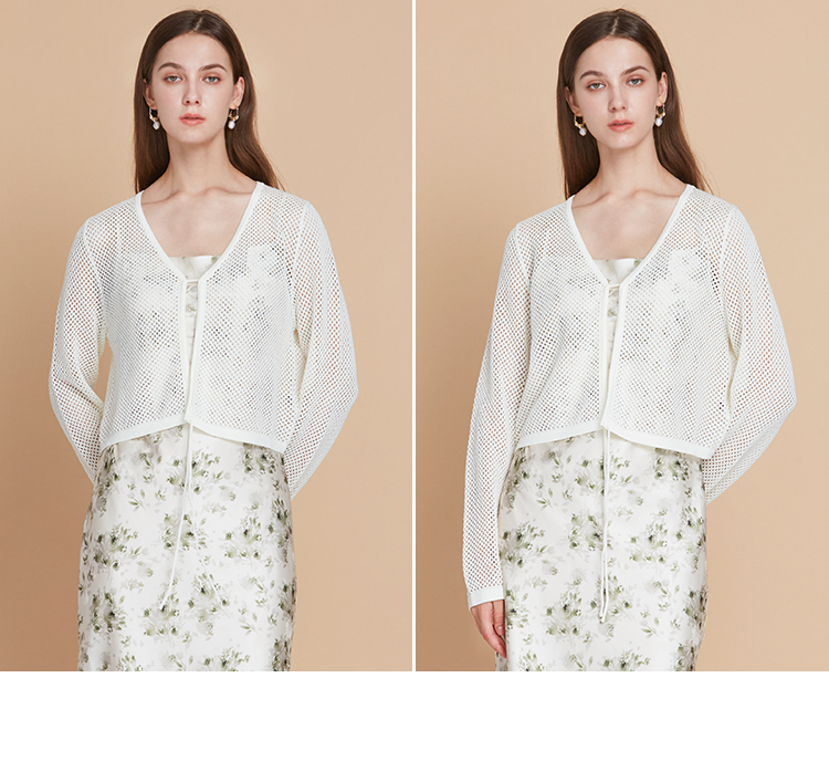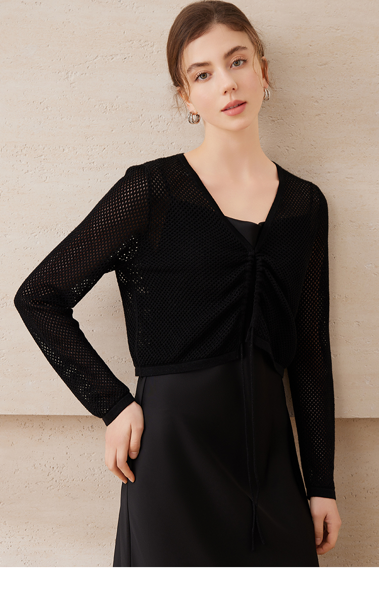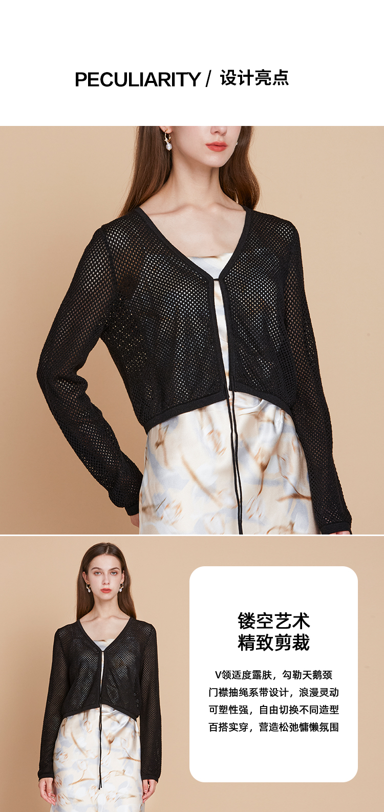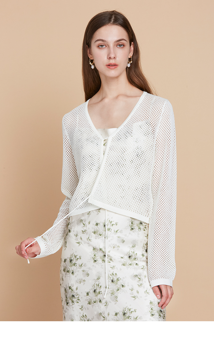 EITIE爱特爱网眼V领显瘦短款长袖针织罩衫纯色百搭2025夏季新款B2501608