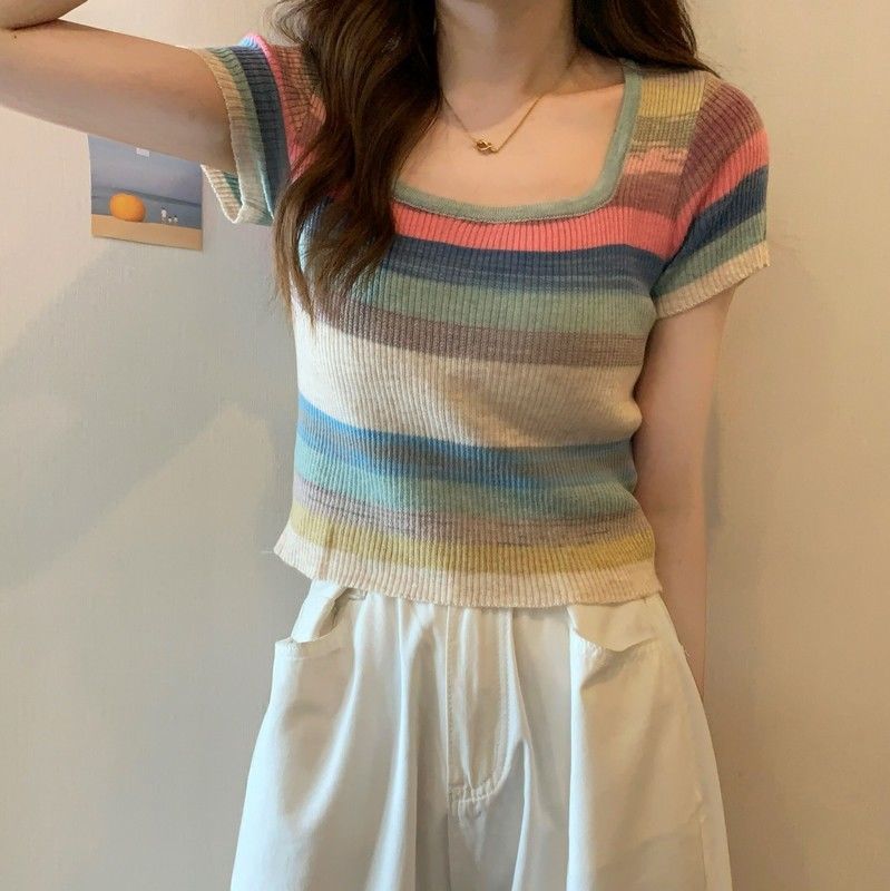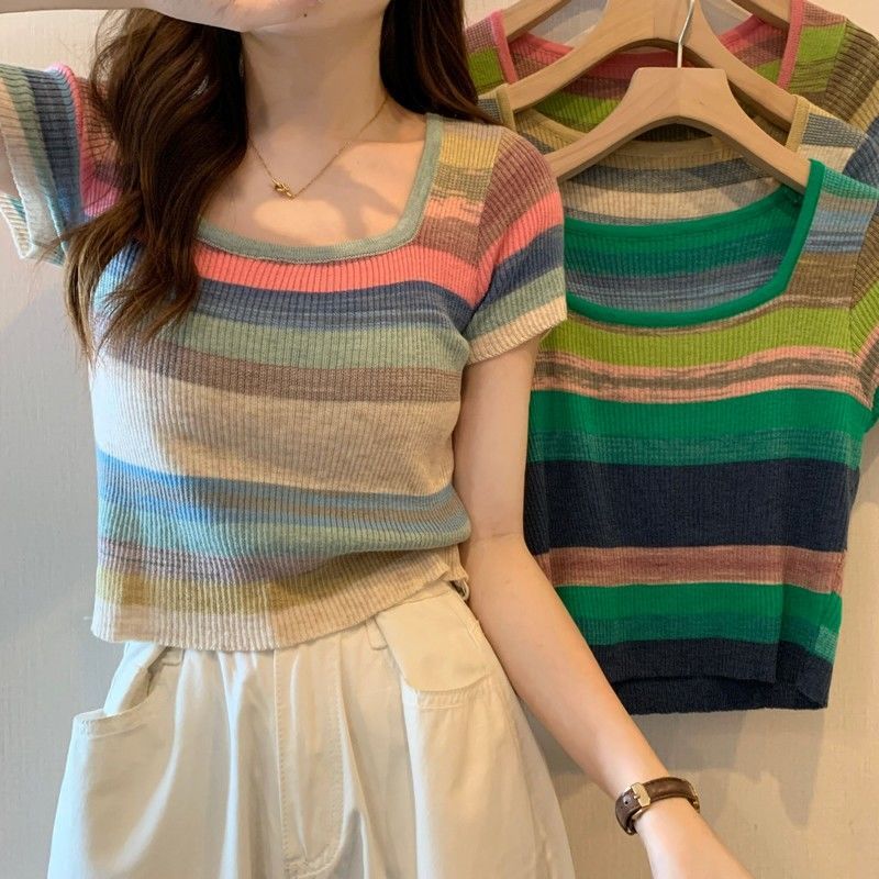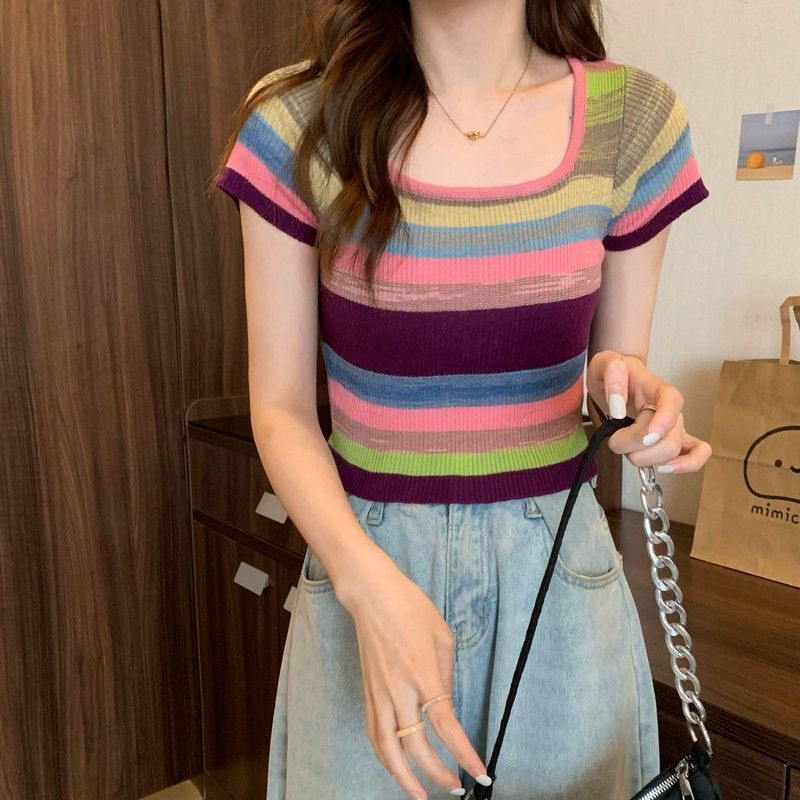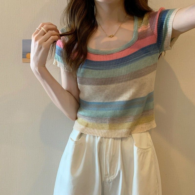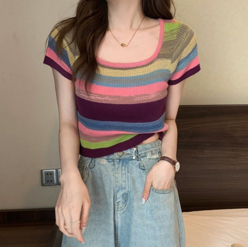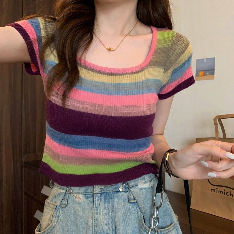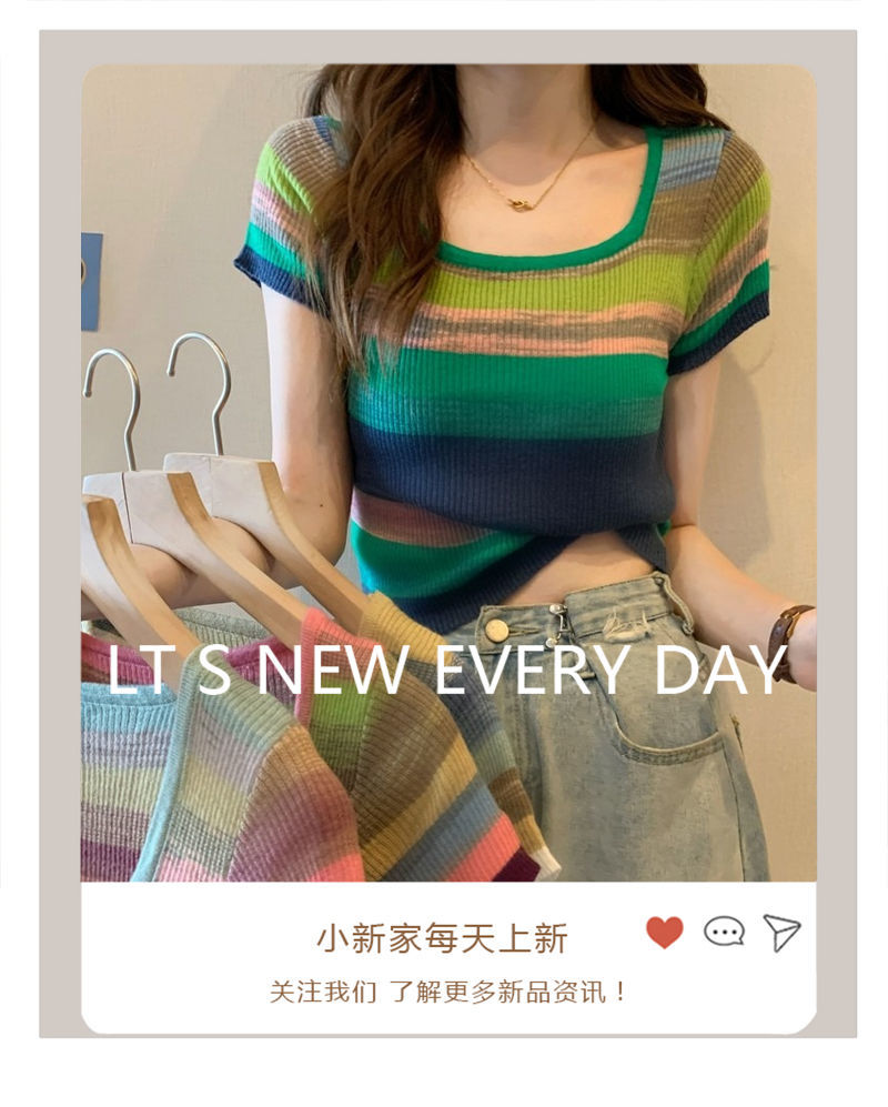 彩虹条纹方领针织短袖T恤女夏薄款设计感短款上衣rbl01