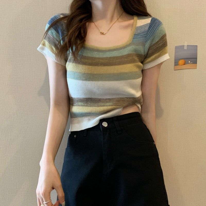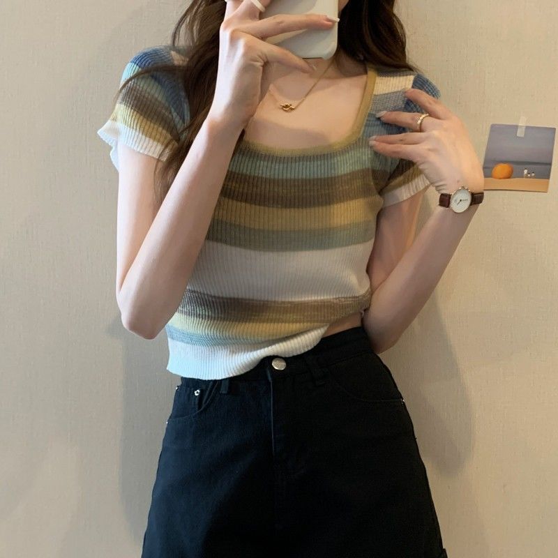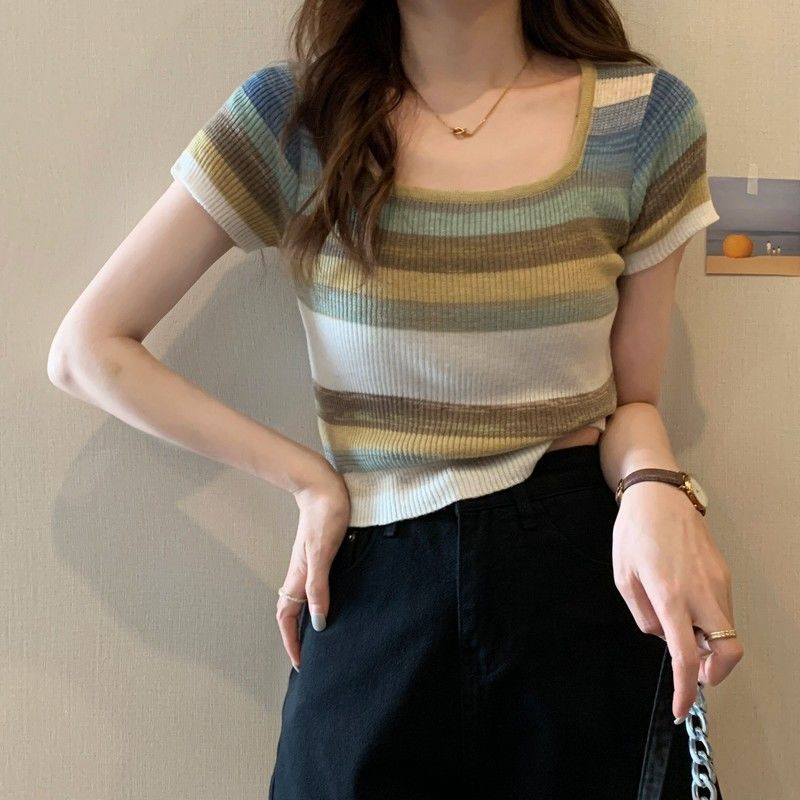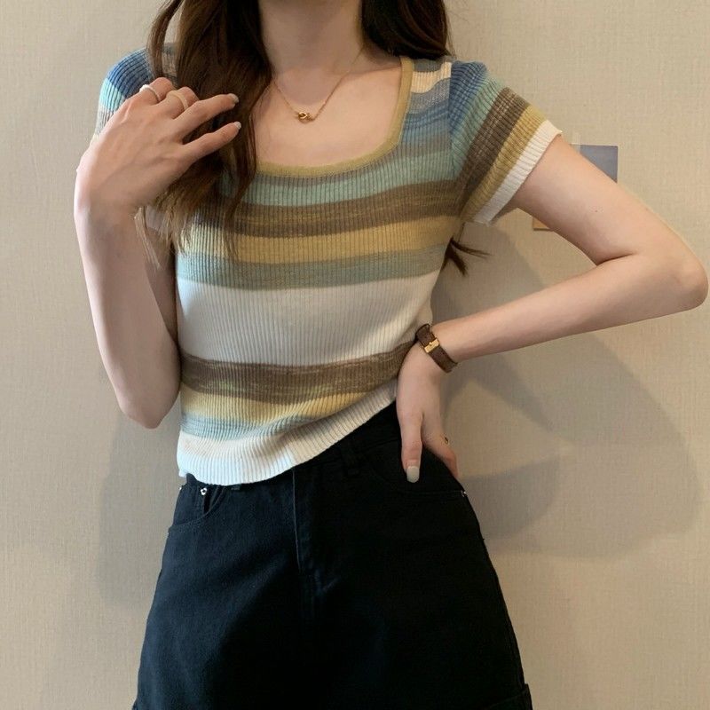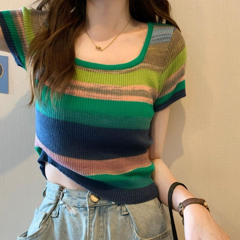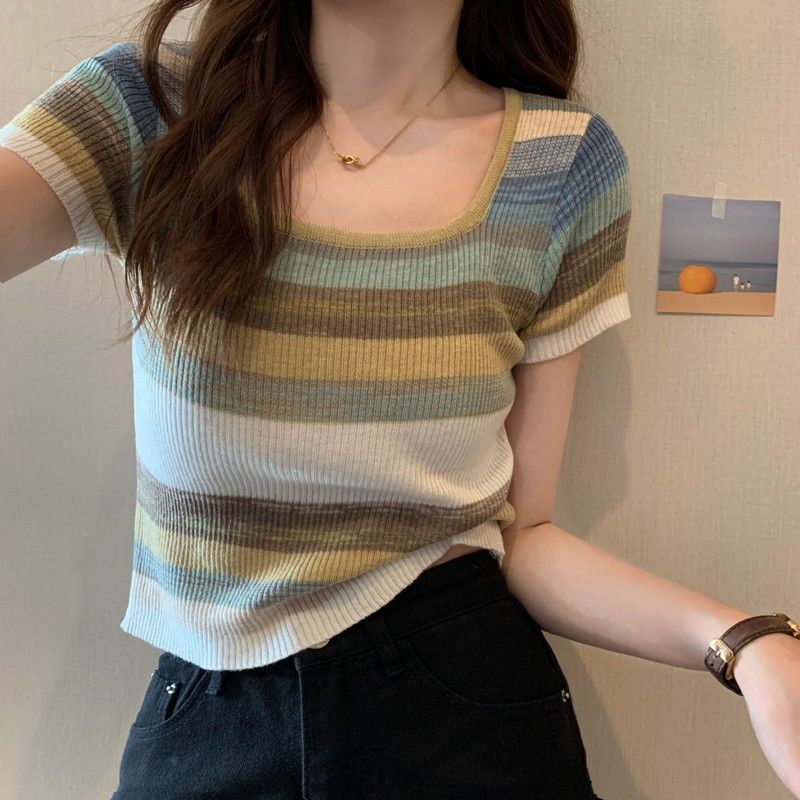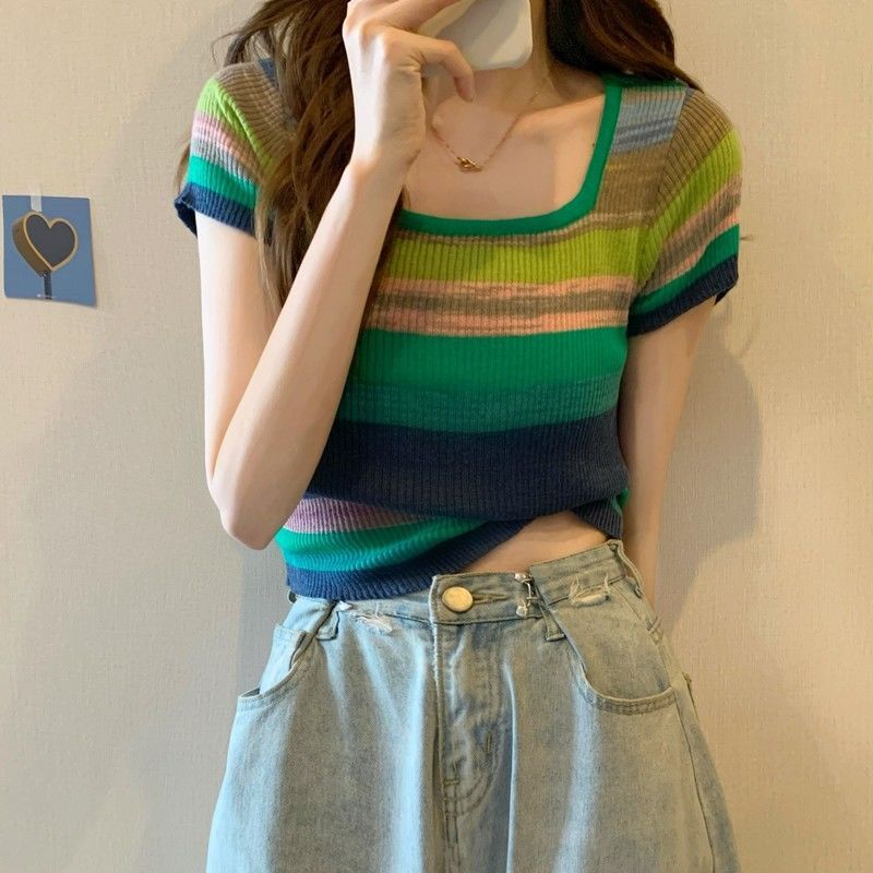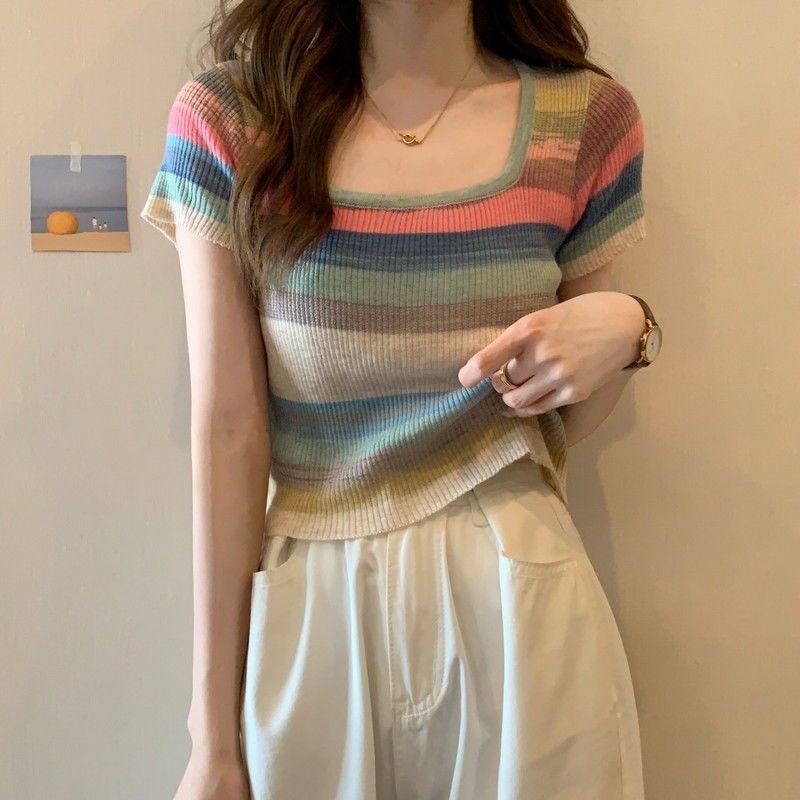 彩虹条纹方领针织短袖T恤女夏薄款设计感短款上衣rbl01