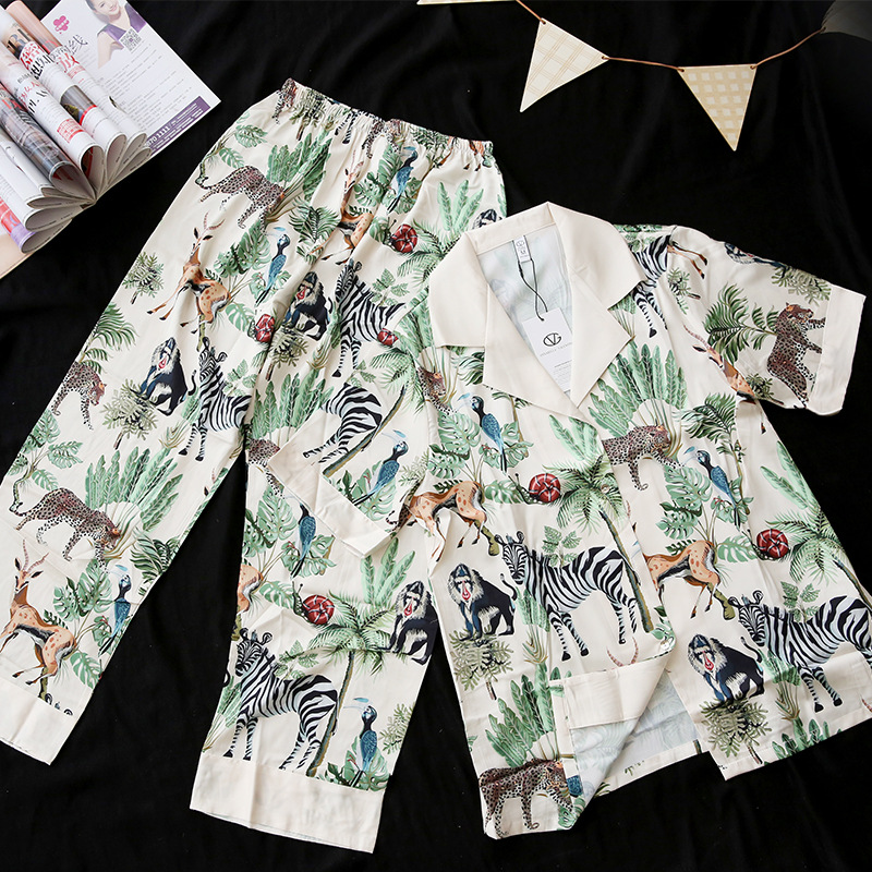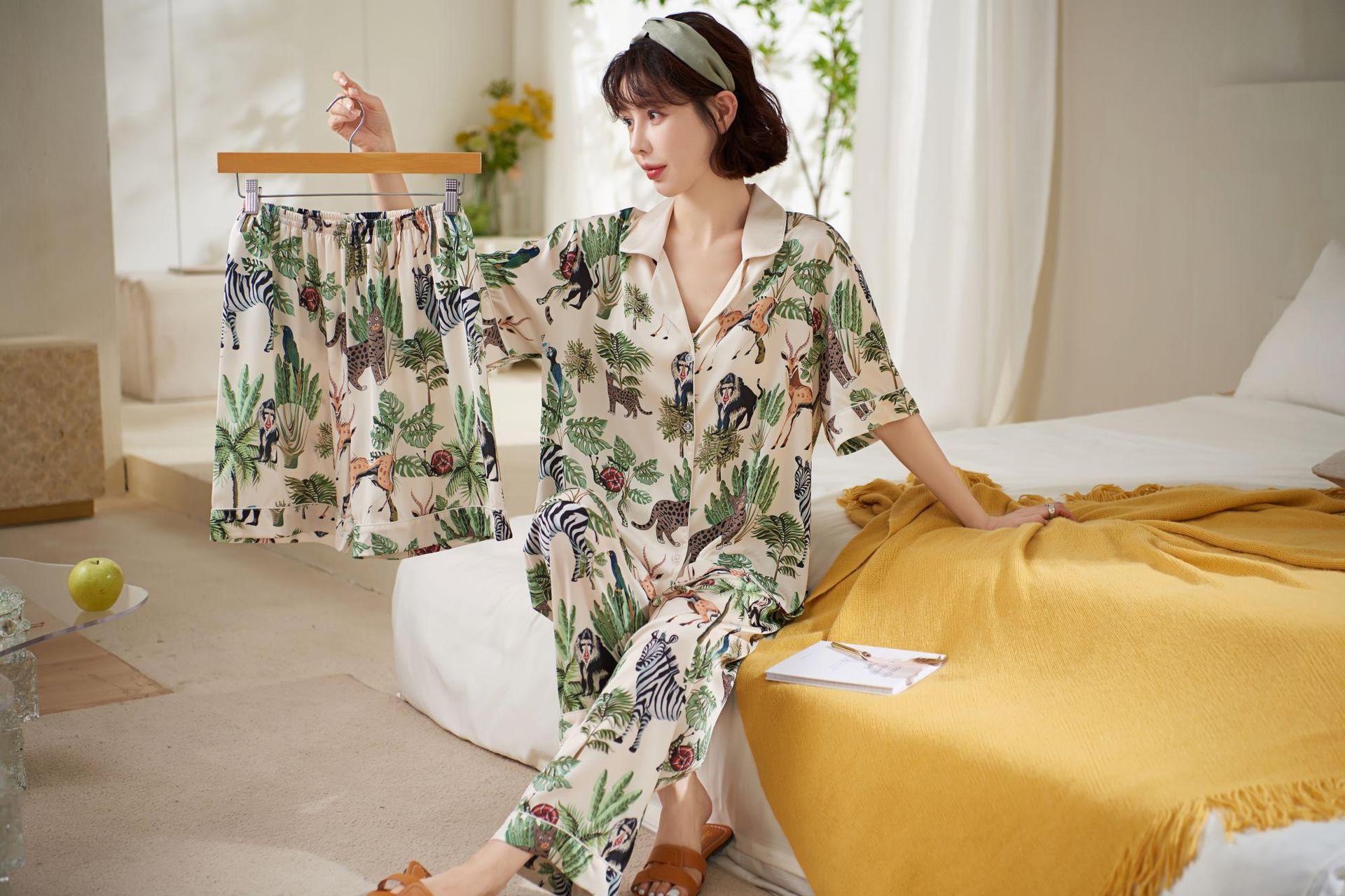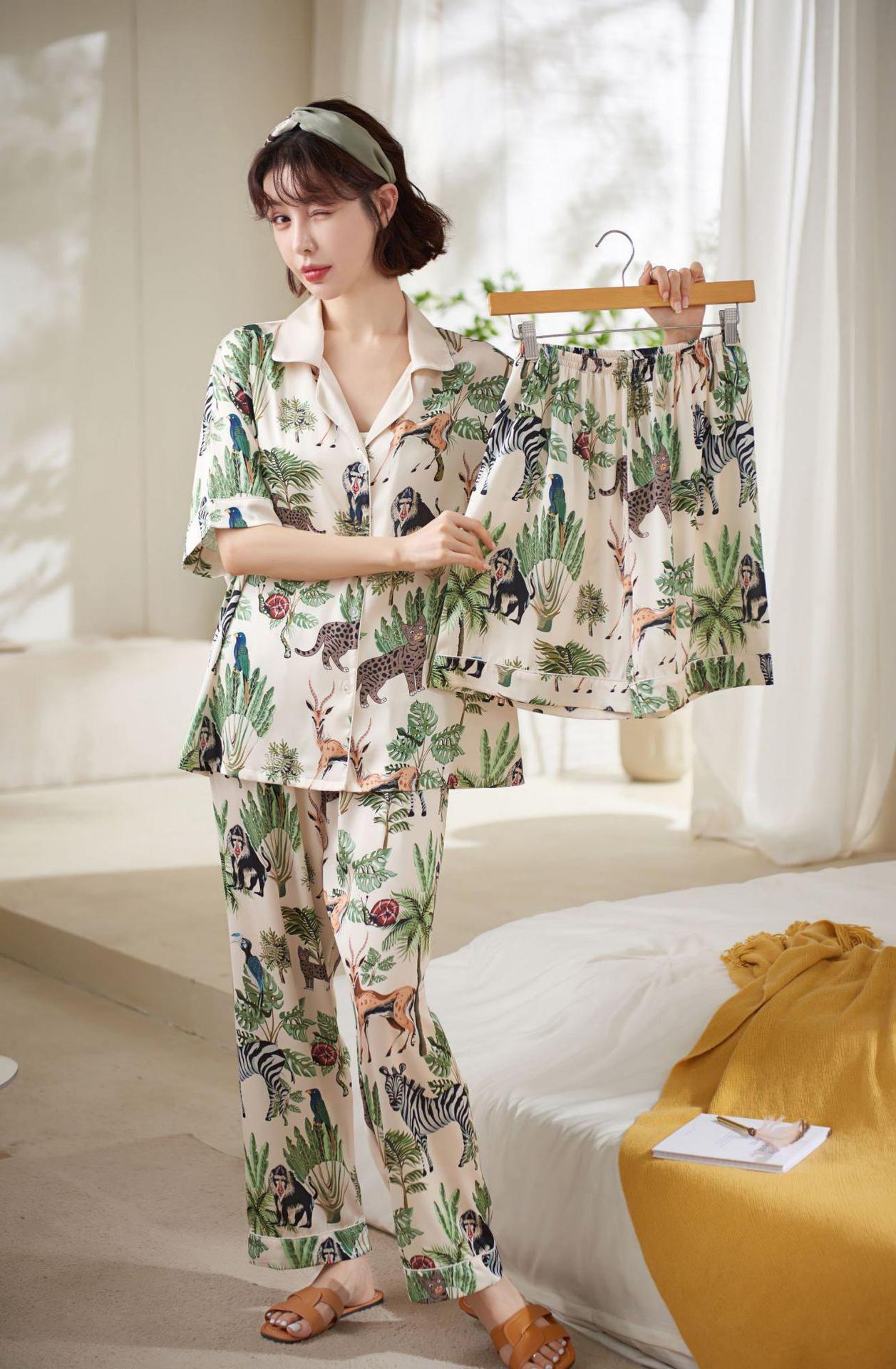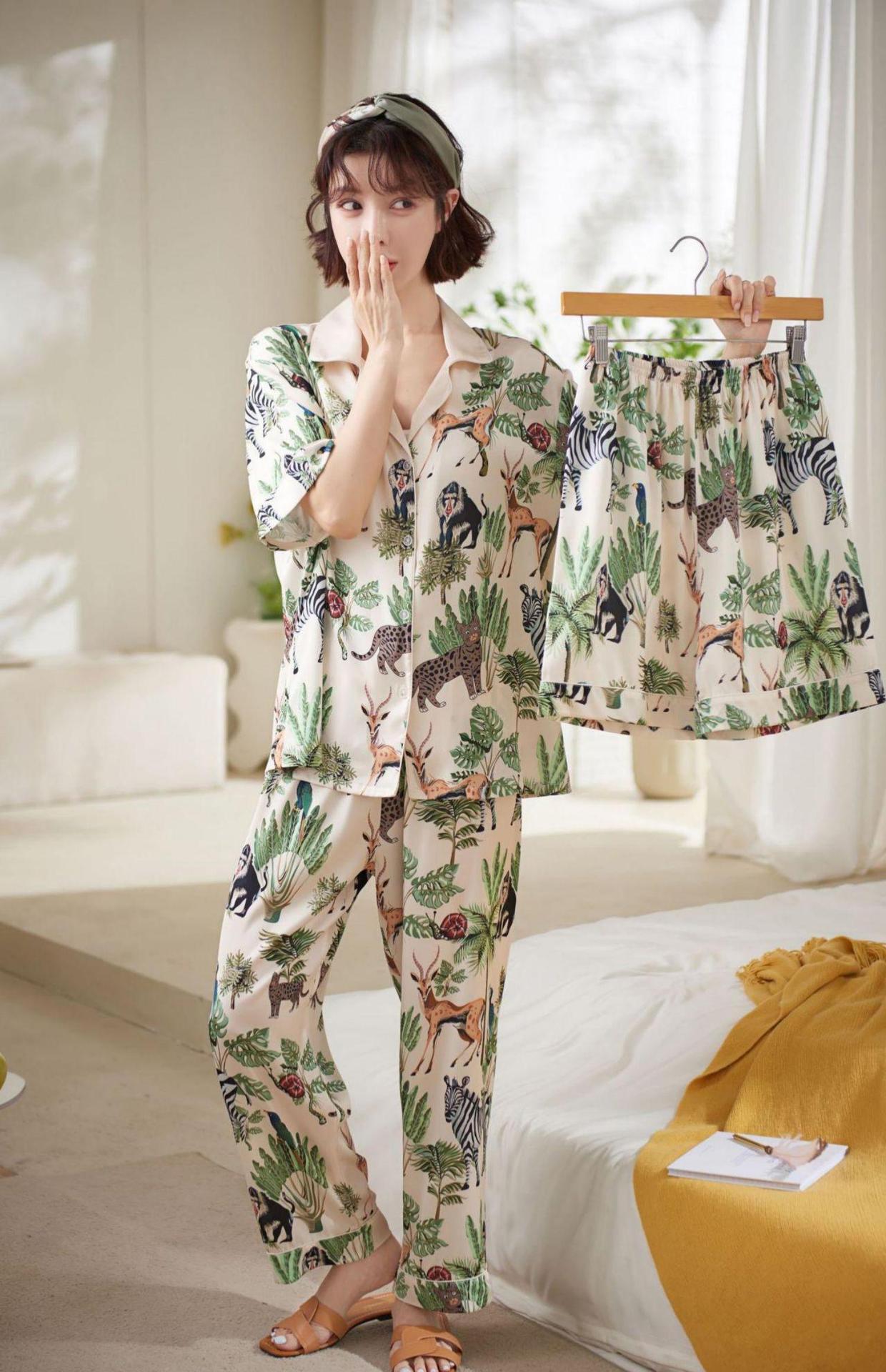 【夏日丛林派对冰丝睡衣】夏季新款冰丝短袖开衫三件套装春秋薄款家居服H242272058