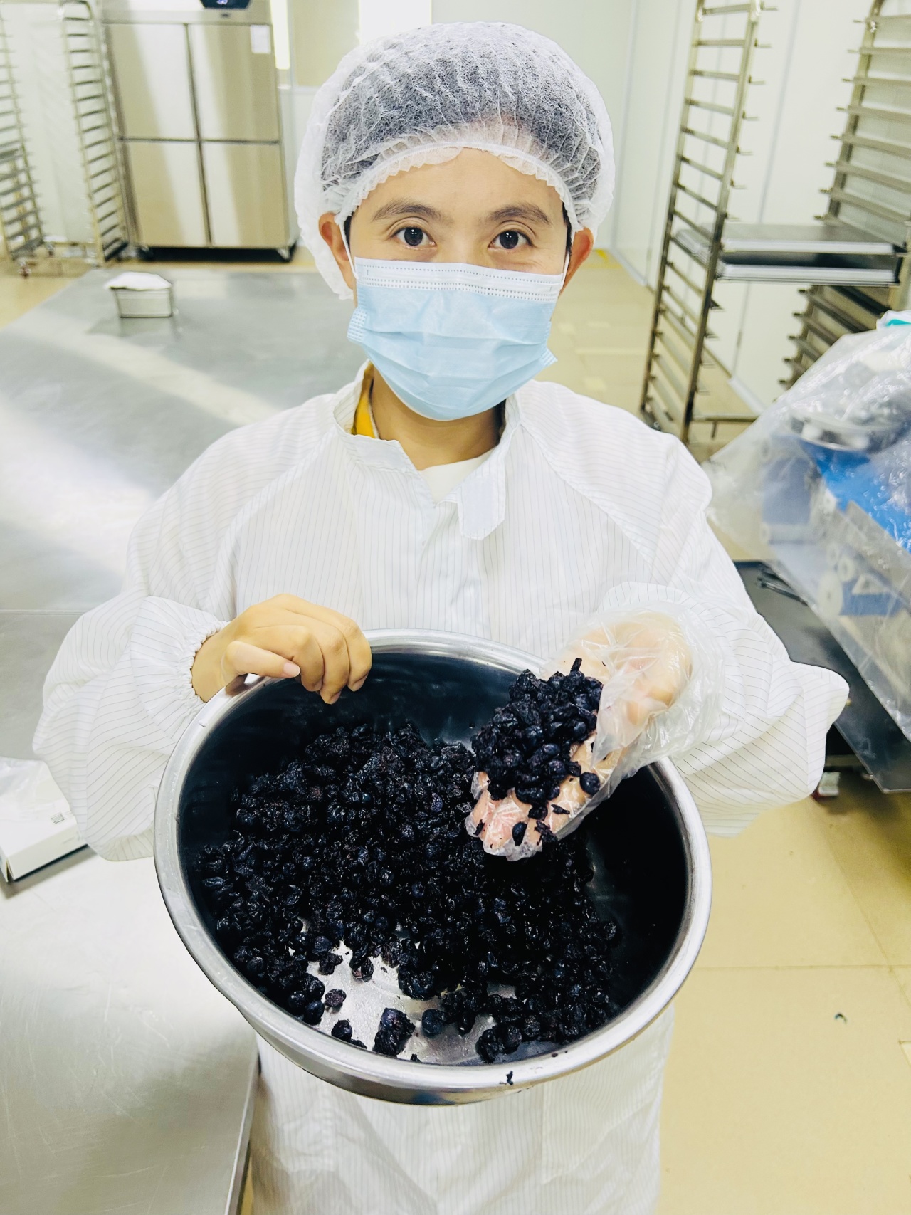 蓝莓内馅非常软,必须冷冻以后才能手工加工,费时费力。蓝莓内馅机器根本不能加工,增加了手工制作的难度,人工成本是非常高的。可以让你吃到一颗颗蓝莓的果肉,真材实料看得见。