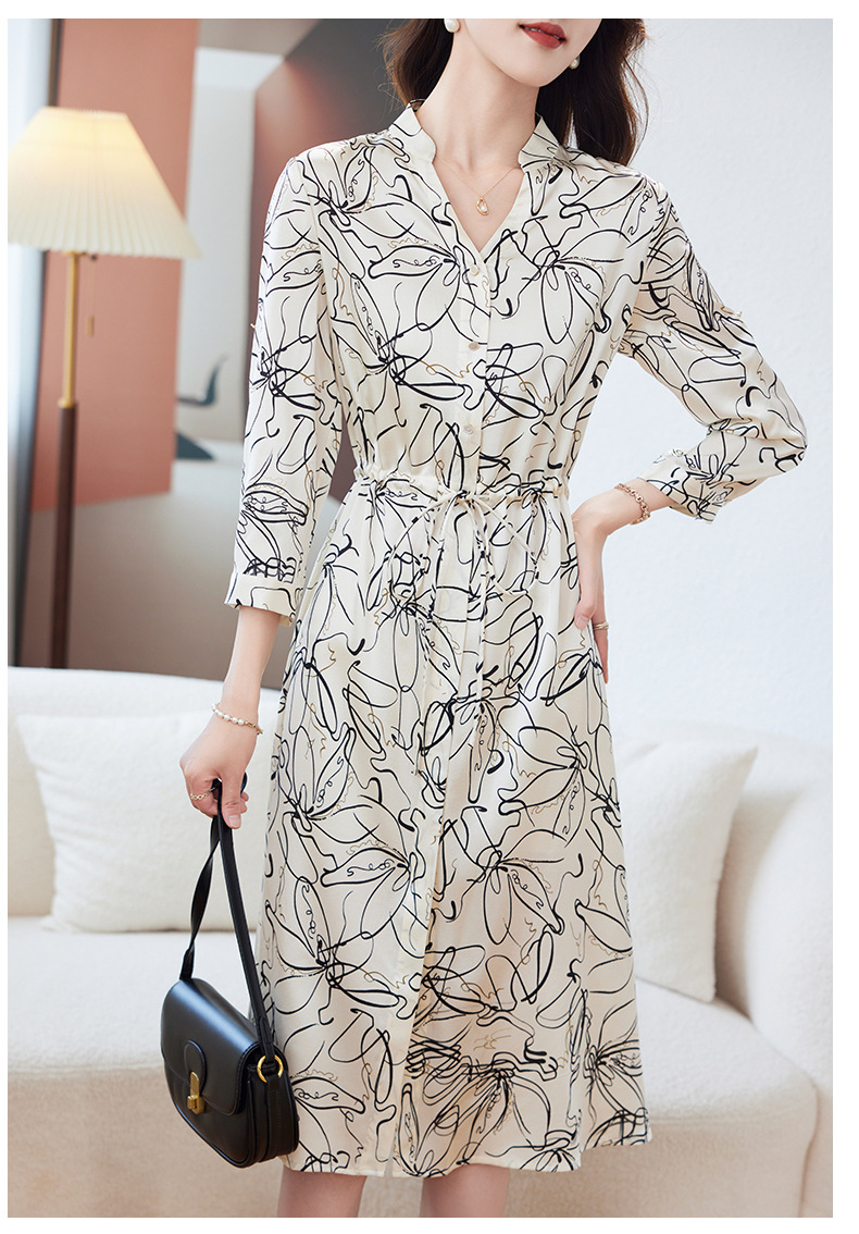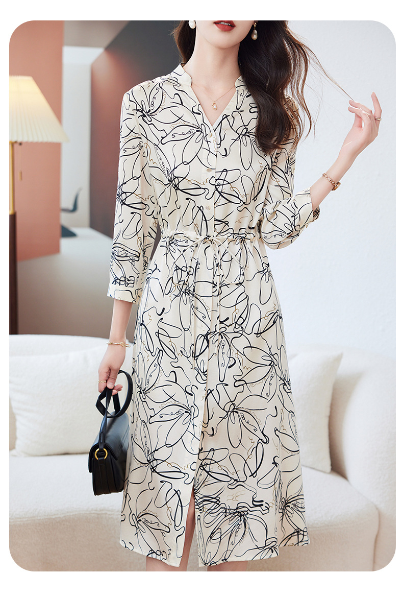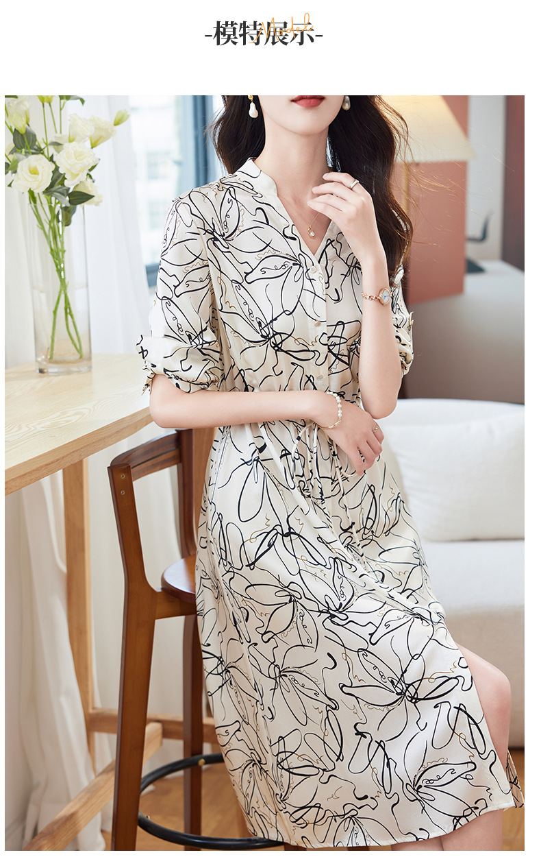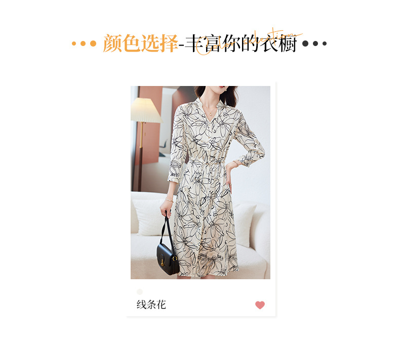 KQ-29679品牌V领淑女轻熟风真丝连衣裙气质名媛法式显瘦碎花收腰桑蚕丝裙