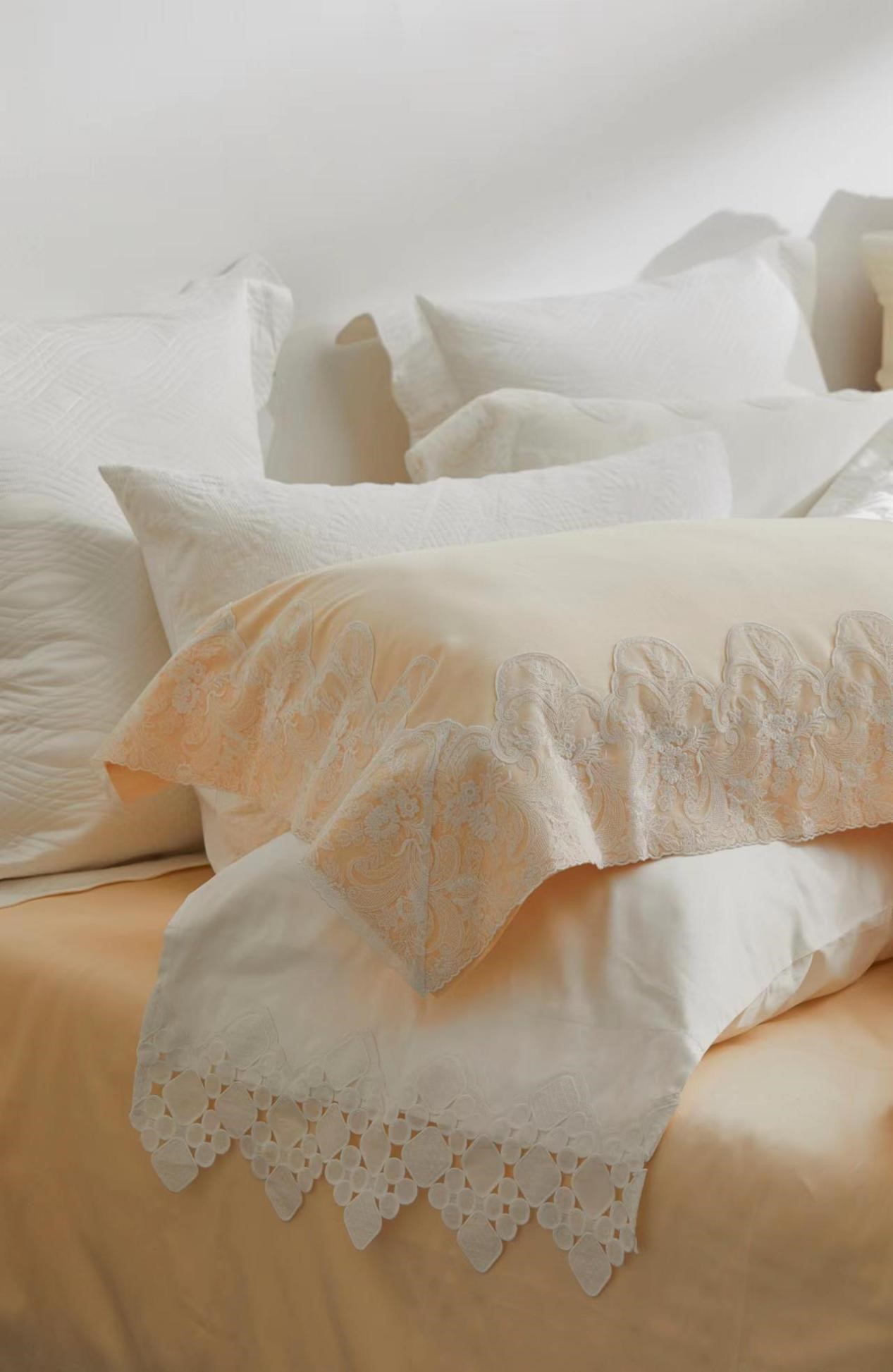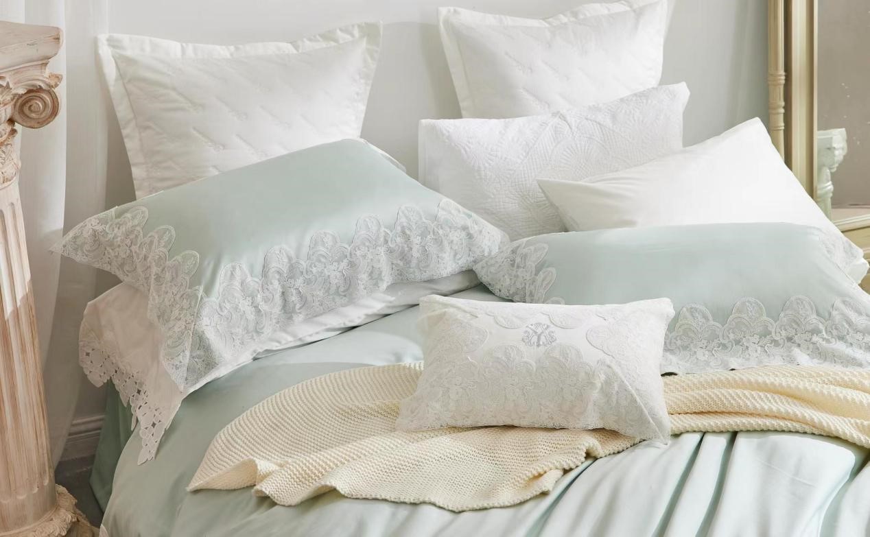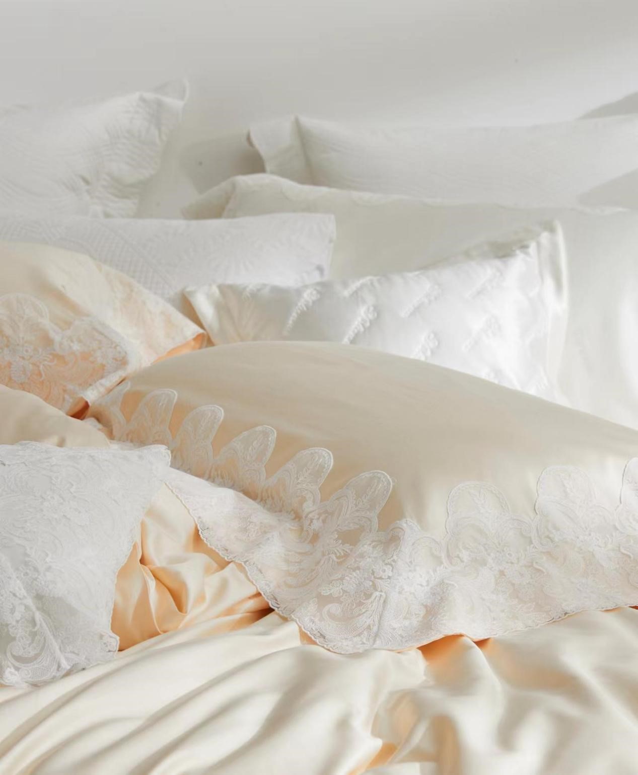 花边在款式上,运用法式花朵清新元素来塑造整体田园美式的气息,紧扣本次yolanna豪华大宅的主题,为床品在莉莉雍系列中的形象增添了固有的花园餐厅般的浪漫气息。半透明的花边材质是对缝纫技术的一项困难考 验,一针一线地波浪形边缘被服帖完美的缝制于富有光泽的面料之上。对于花边的手感把控也十分严格,在凌驾于 轻盈的前提之下,独特的制造工艺也使得花边手感如羽毛般柔软丝滑。被套缝制为三边款,枕套则为四边,花边的 整体宽度与分布恰到好处,完全体现了莉莉雍派的女性之美,映衬您的肤质更加细腻