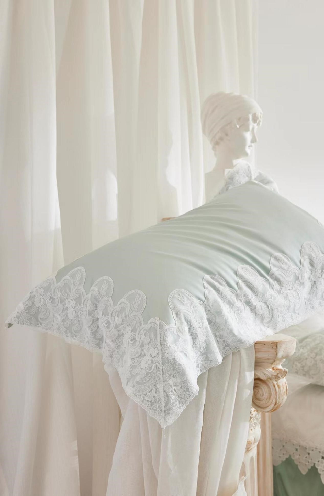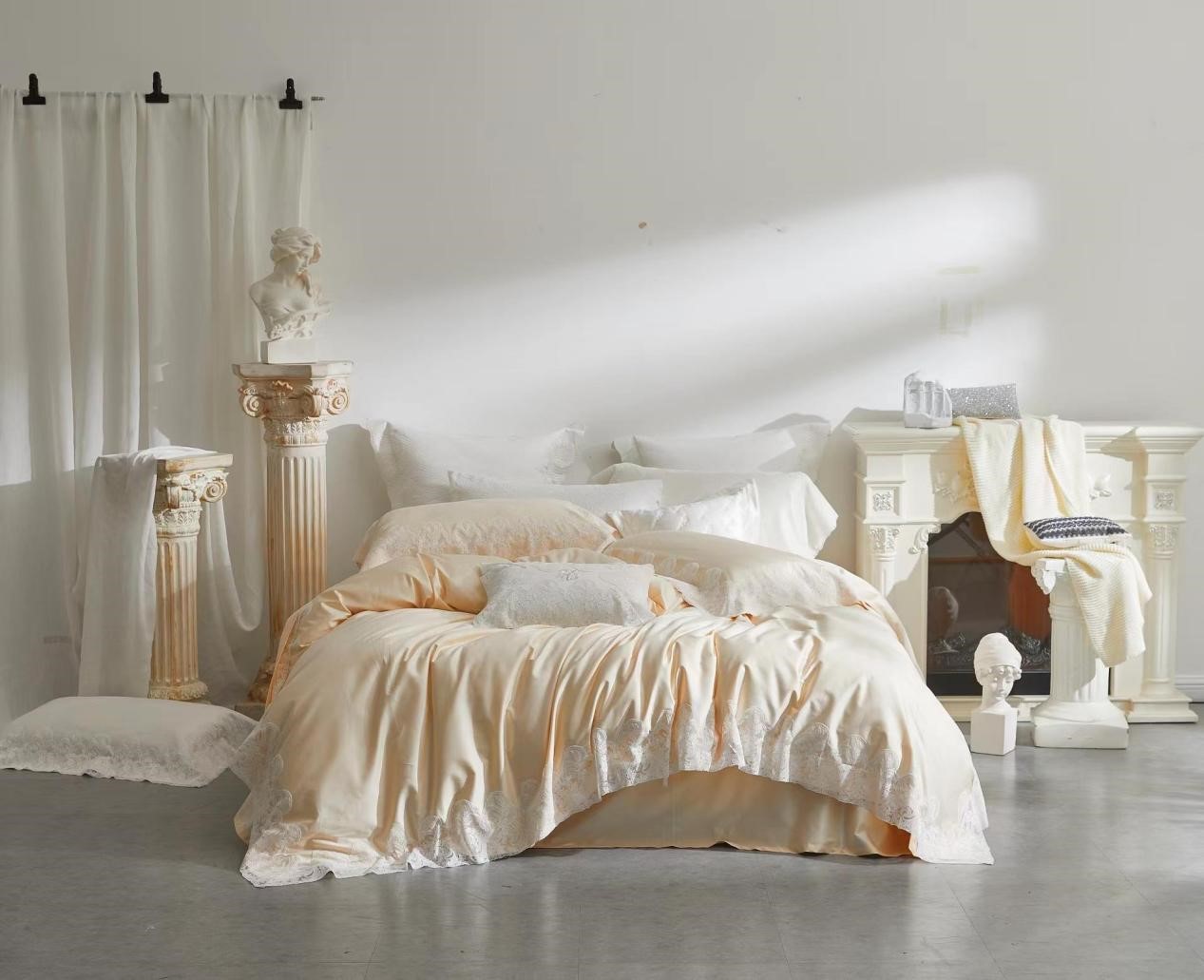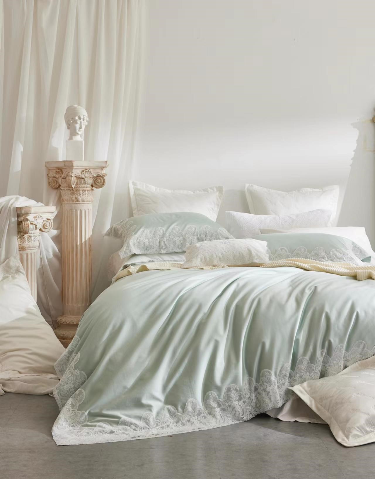 花边在款式上,运用法式花朵清新元素来塑造整体田园美式的气息,紧扣本次yolanna豪华大宅的主题,为床品在莉莉雍系列中的形象增添了固有的花园餐厅般的浪漫气息。半透明的花边材质是对缝纫技术的一项困难考 验,一针一线地波浪形边缘被服帖完美的缝制于富有光泽的面料之上。对于花边的手感把控也十分严格,在凌驾于 轻盈的前提之下,独特的制造工艺也使得花边手感如羽毛般柔软丝滑。被套缝制为三边款,枕套则为四边,花边的 整体宽度与分布恰到好处,完全体现了莉莉雍派的女性之美,映衬您的肤质更加细腻