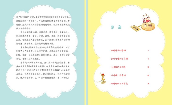 “叮当小铃铛童话第一季”是一套励志童话书,也是一套儿童由看图画过渡到读文字的桥梁书。书中以小朋友们喜爱的动物呼噜猫、萝卜兔、米喜熊、小福象为主人公,写了涉及儿童成长各个方面的故事,将善良、爱心、友谊、诚实、勇敢、机智、分享等美好品质巧妙地融合进童话故事里,让小读者们能够在阅读中增长智慧,增强信心、敢于自我肯定、勇于战胜困难。 书中插图色彩明亮,形象可爱,再加上注音,是专为学龄前儿童和小学一、二年级学生设计的。每个故事后设有“悄悄话板块”,起到画龙点睛的作用,引导小读者对本篇故事的主题进行思考和领悟,也特别适合父母和孩子亲子阅读时引发讨论话题,起到抛砖引玉的作用。