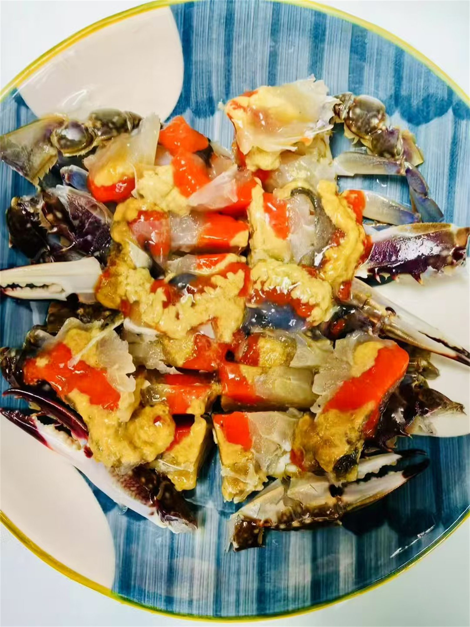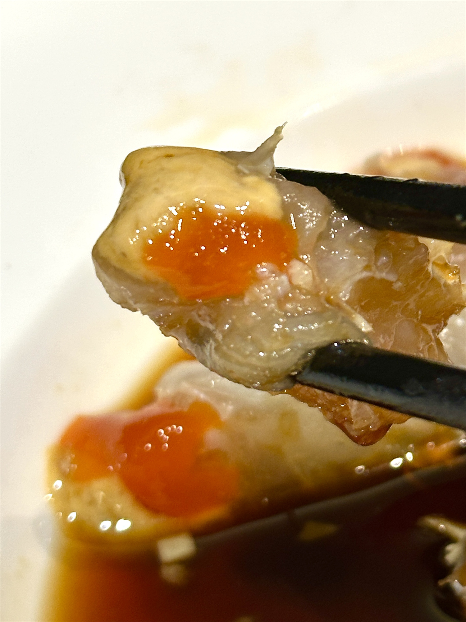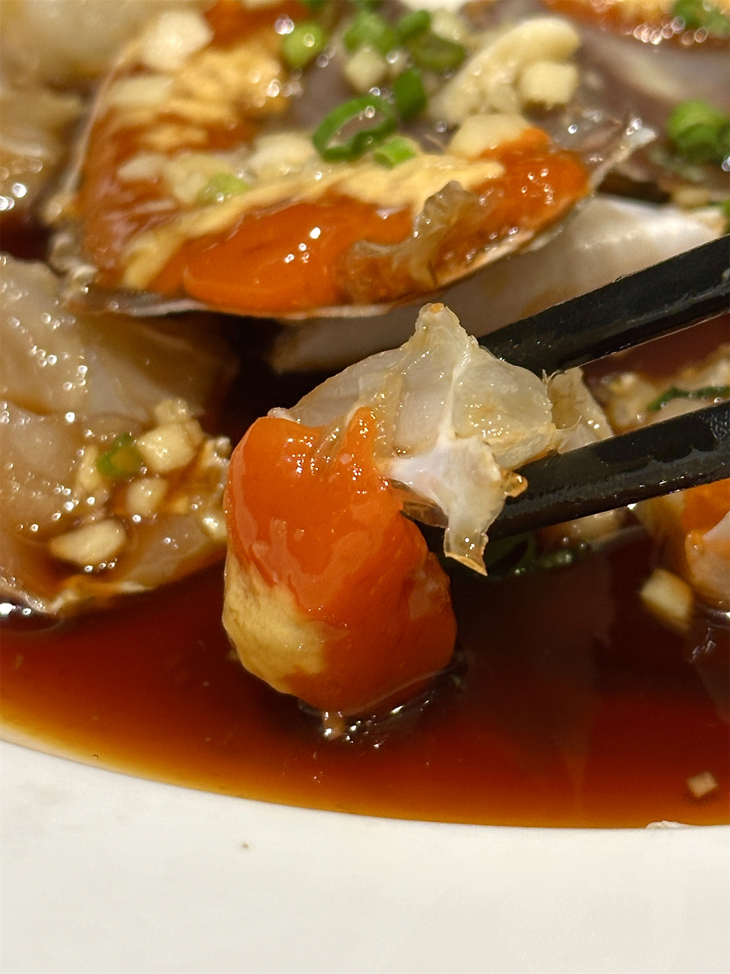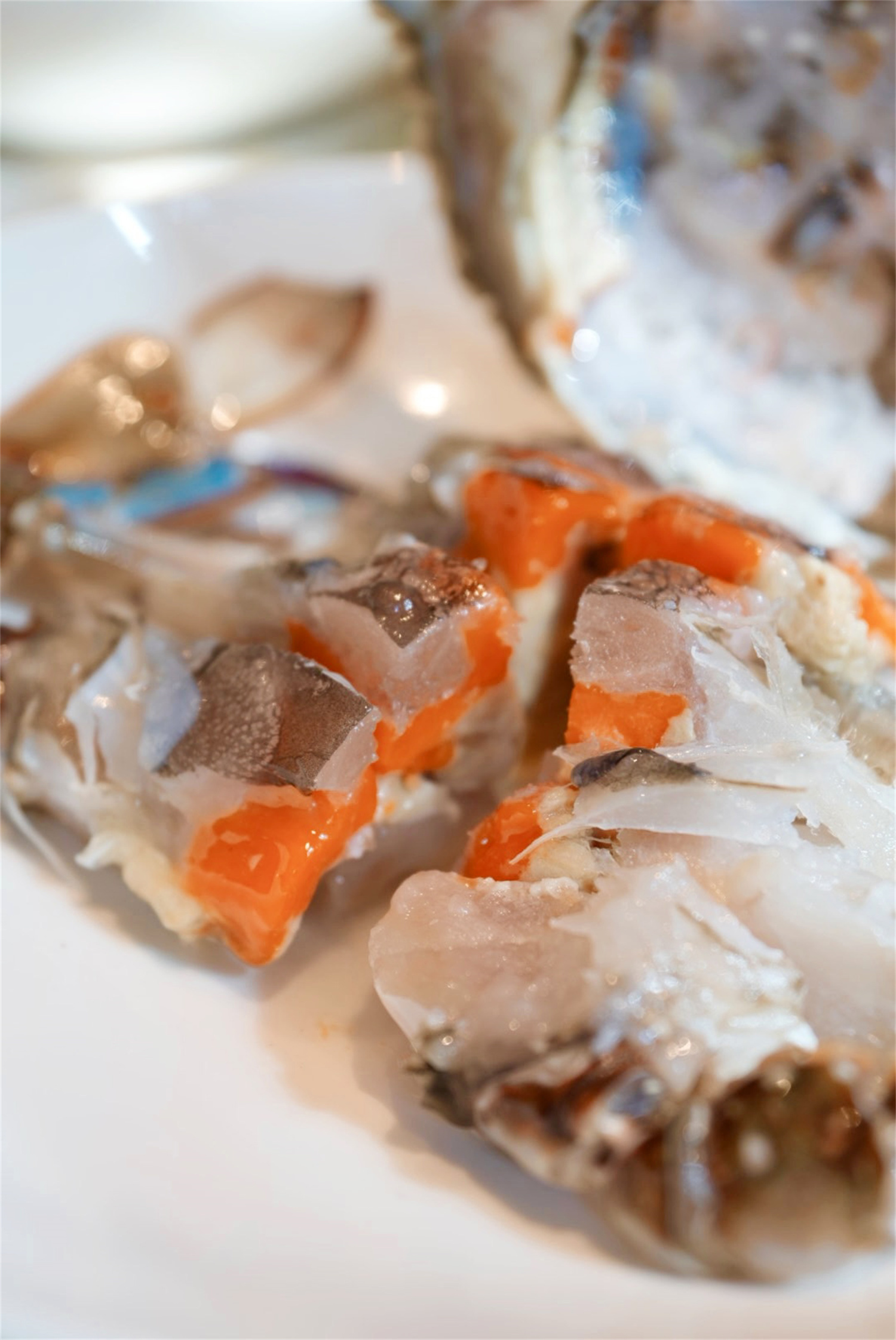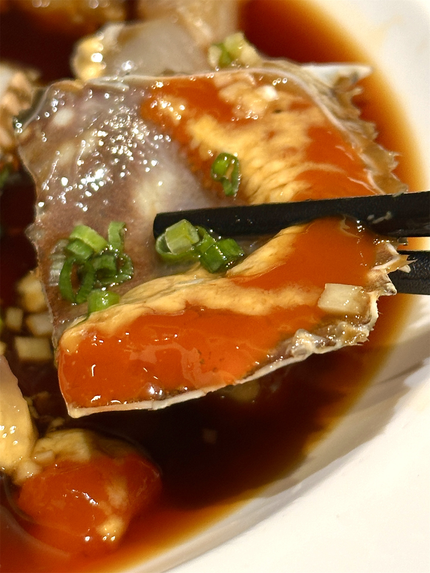夹起来微微颤,吃进嘴里冰冰凉的,红膏绵密像厚芝士,蟹肉滑滑软软,冰布丁一样; 不像老底子那种齁咸,是鲜甜的味道,空口吃都超享受; 如果能配一碗热腾腾的米饭,打耳光都不放啊~