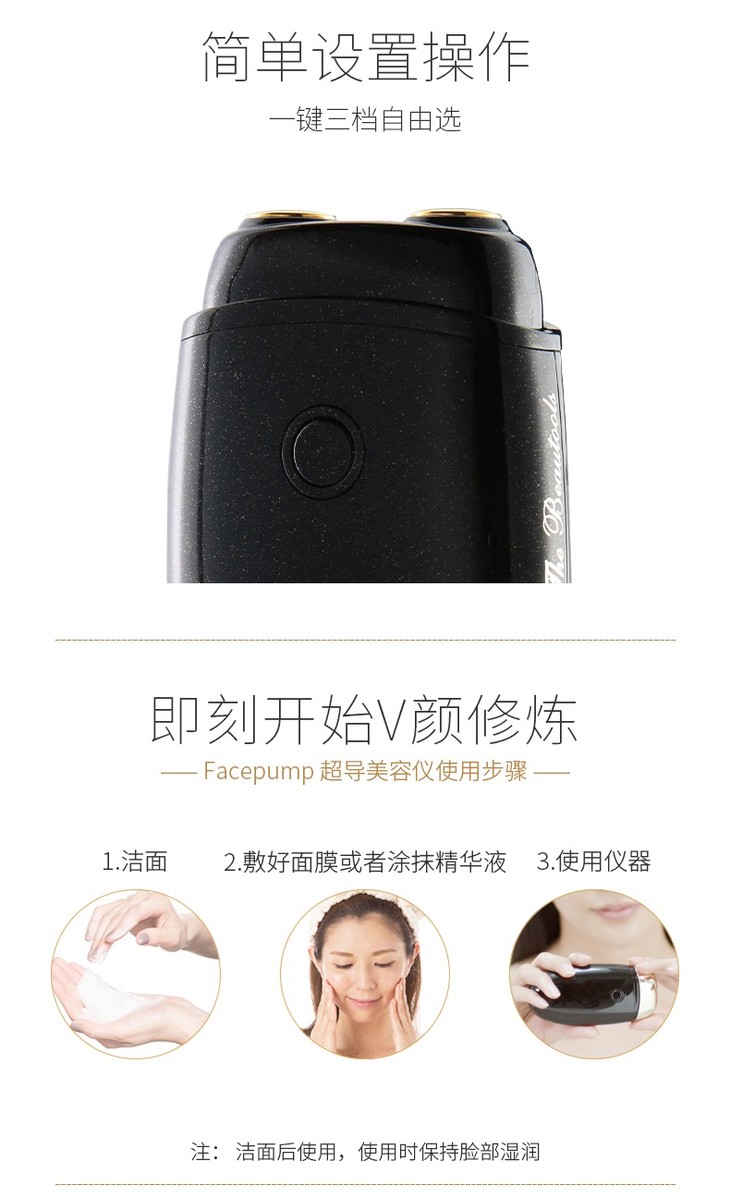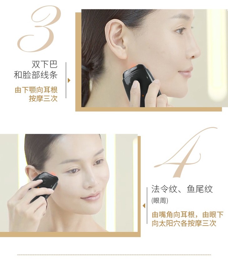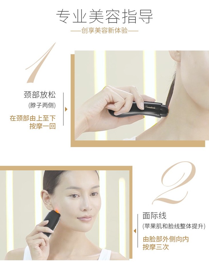“一款低调又奢华的美容仪,24k纳米金EMS电流输出头,通过等离子特殊电脉冲波技术,将透明质酸等有效美容成分导入肌肤深层,轻盈小巧的设计,方便携带,可以用于淡化脖子颈纹,修饰苹果肌和脸部线条,立现小“V”脸,赶走鱼尾纹、法令纹,年轻看得见。”