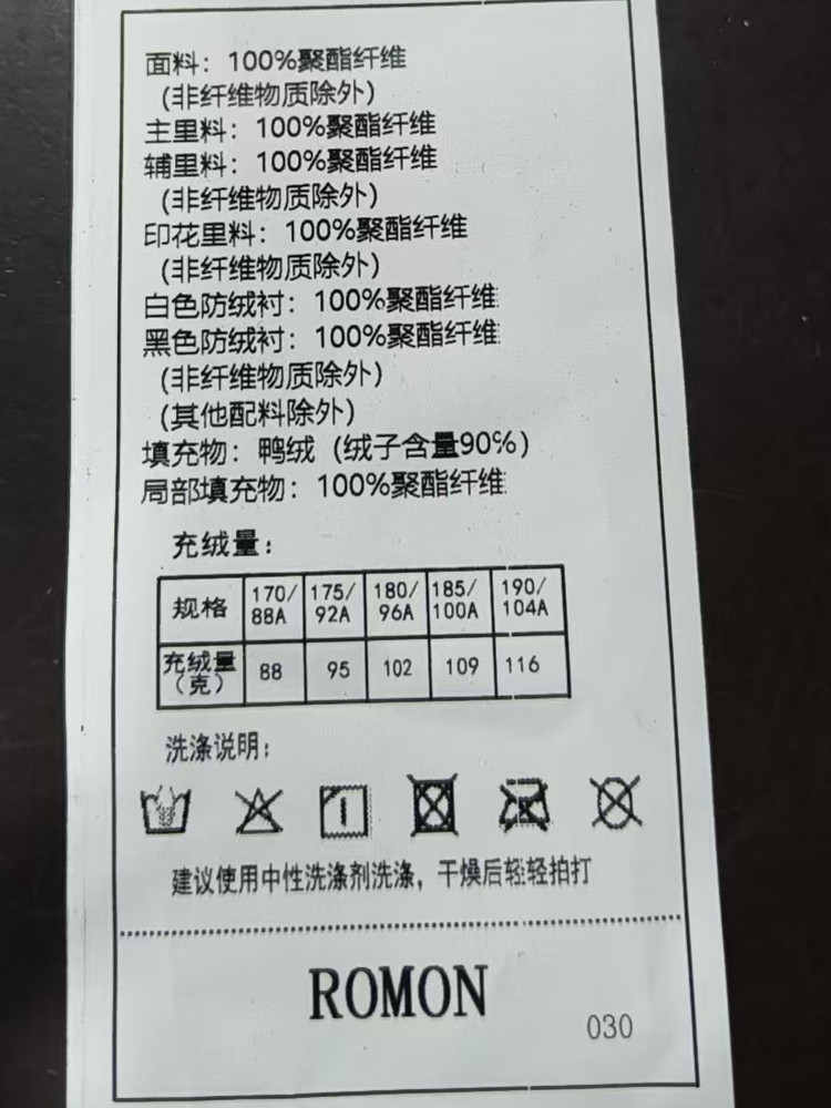 辅里料:100%聚酯纤维(非纤维物质除外)