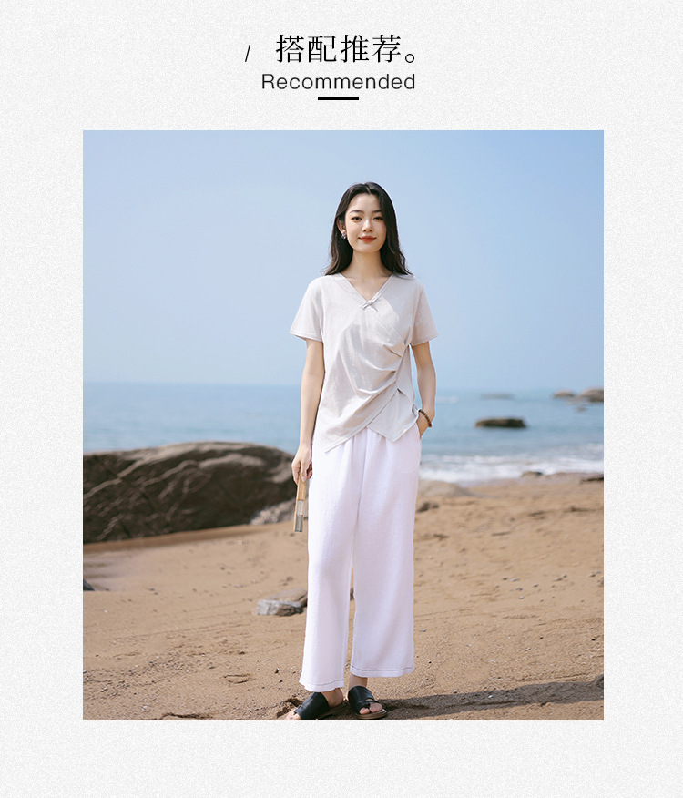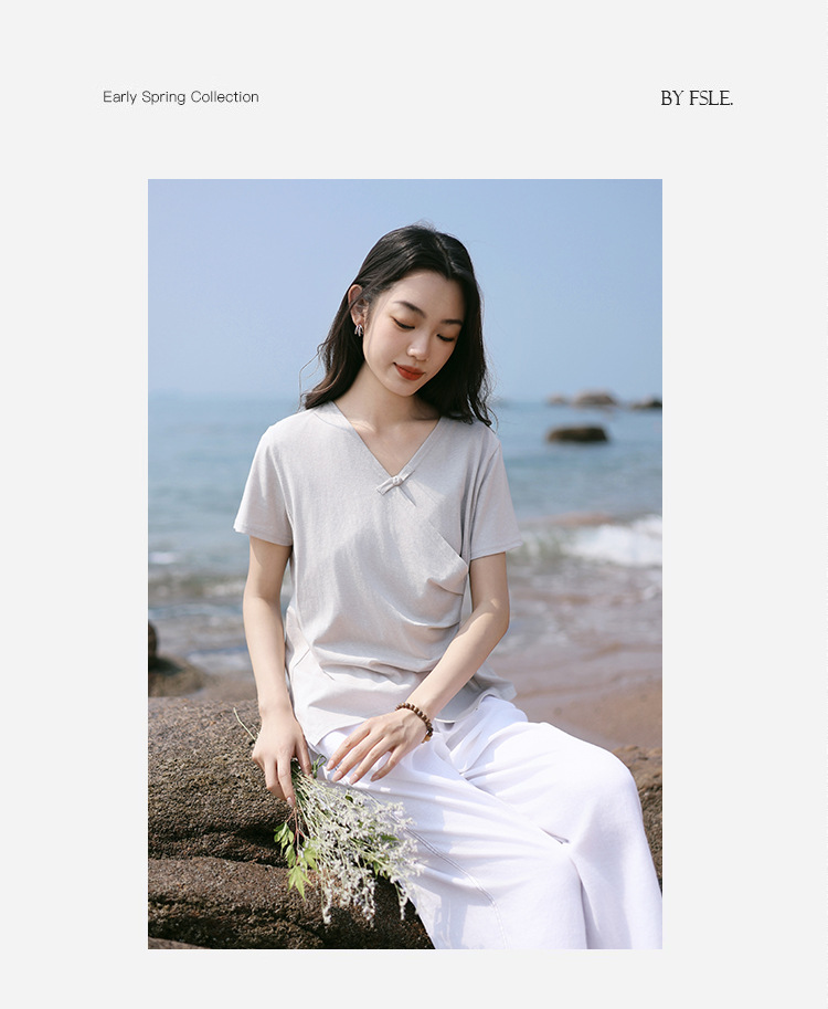 雀说新款设计感短袖t恤女新中式汉麻v领气质显瘦上衣AL6516