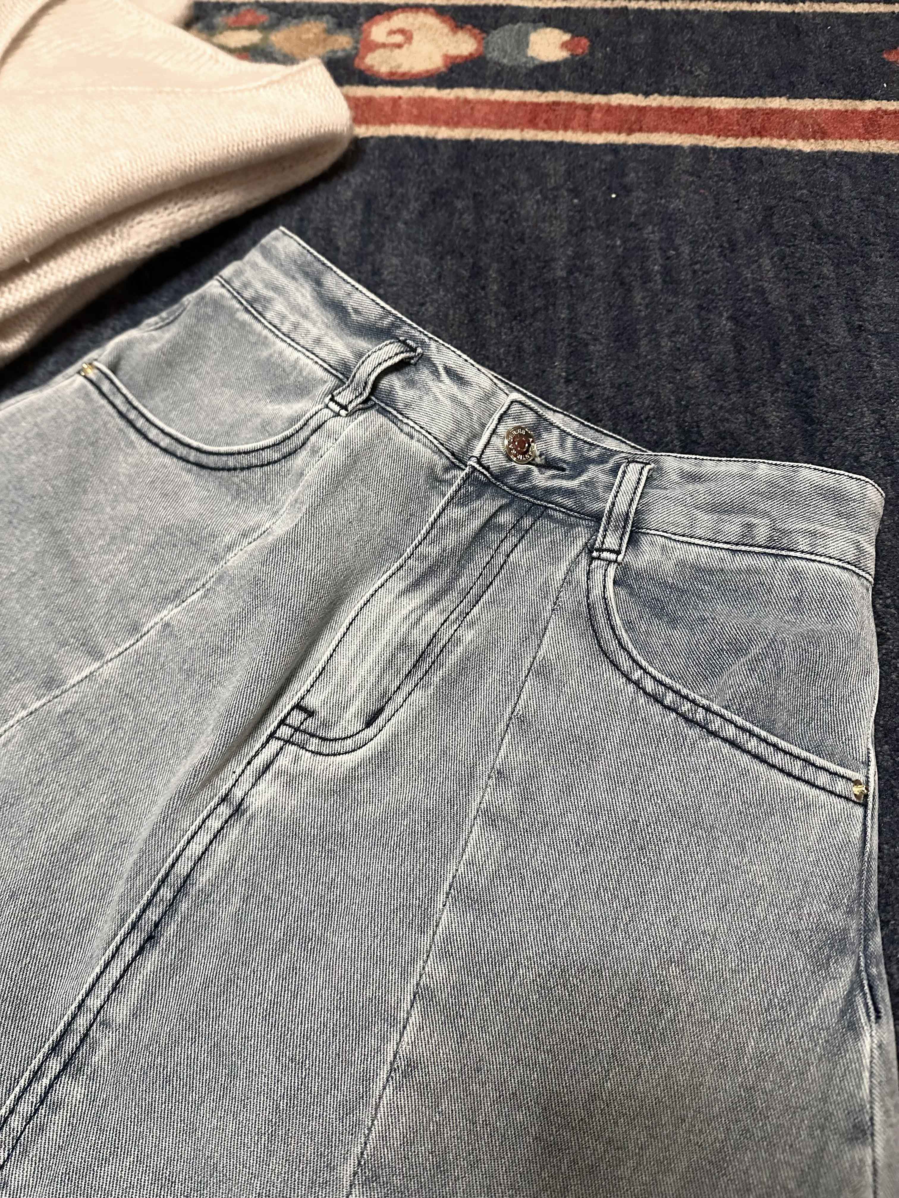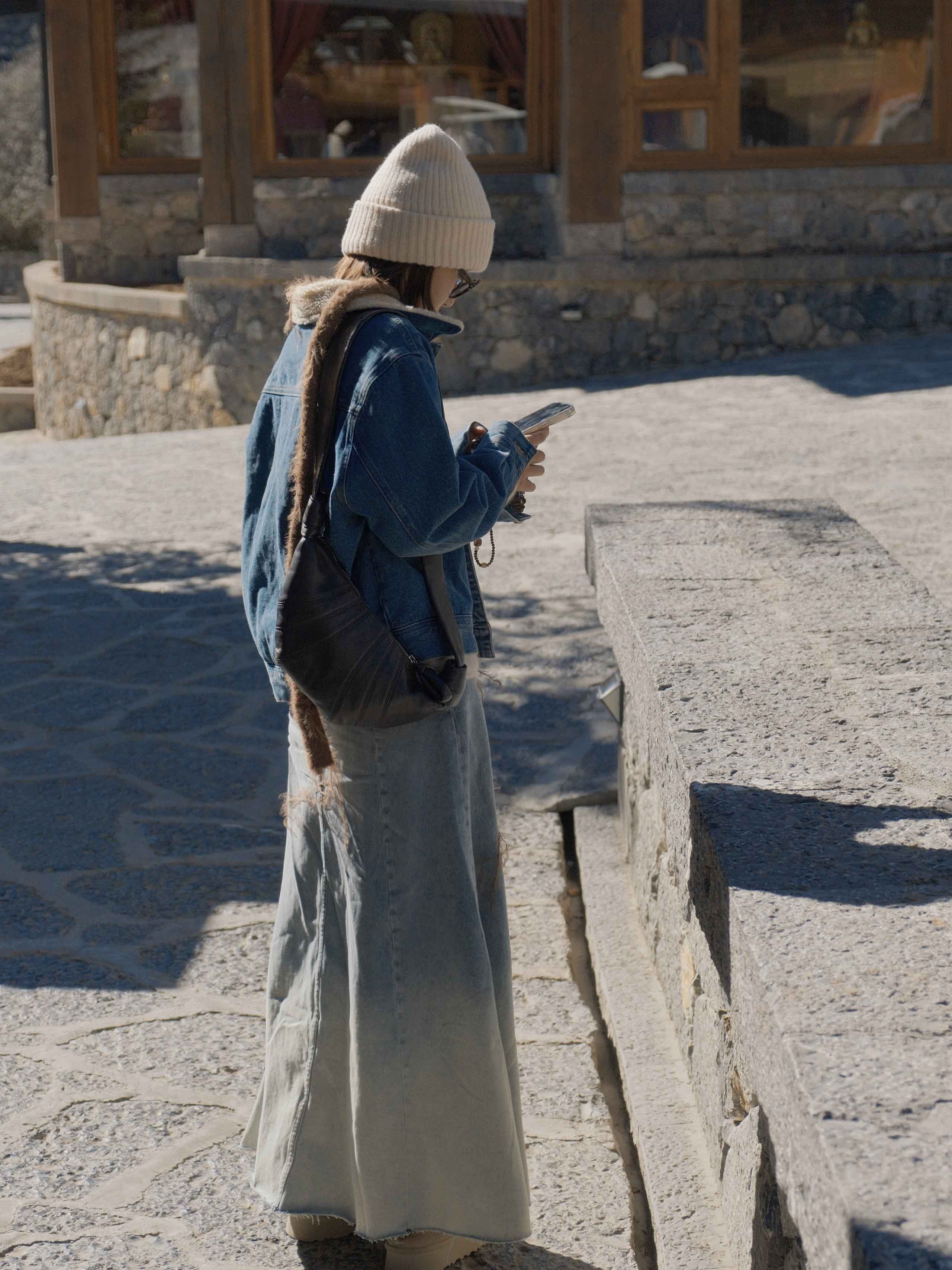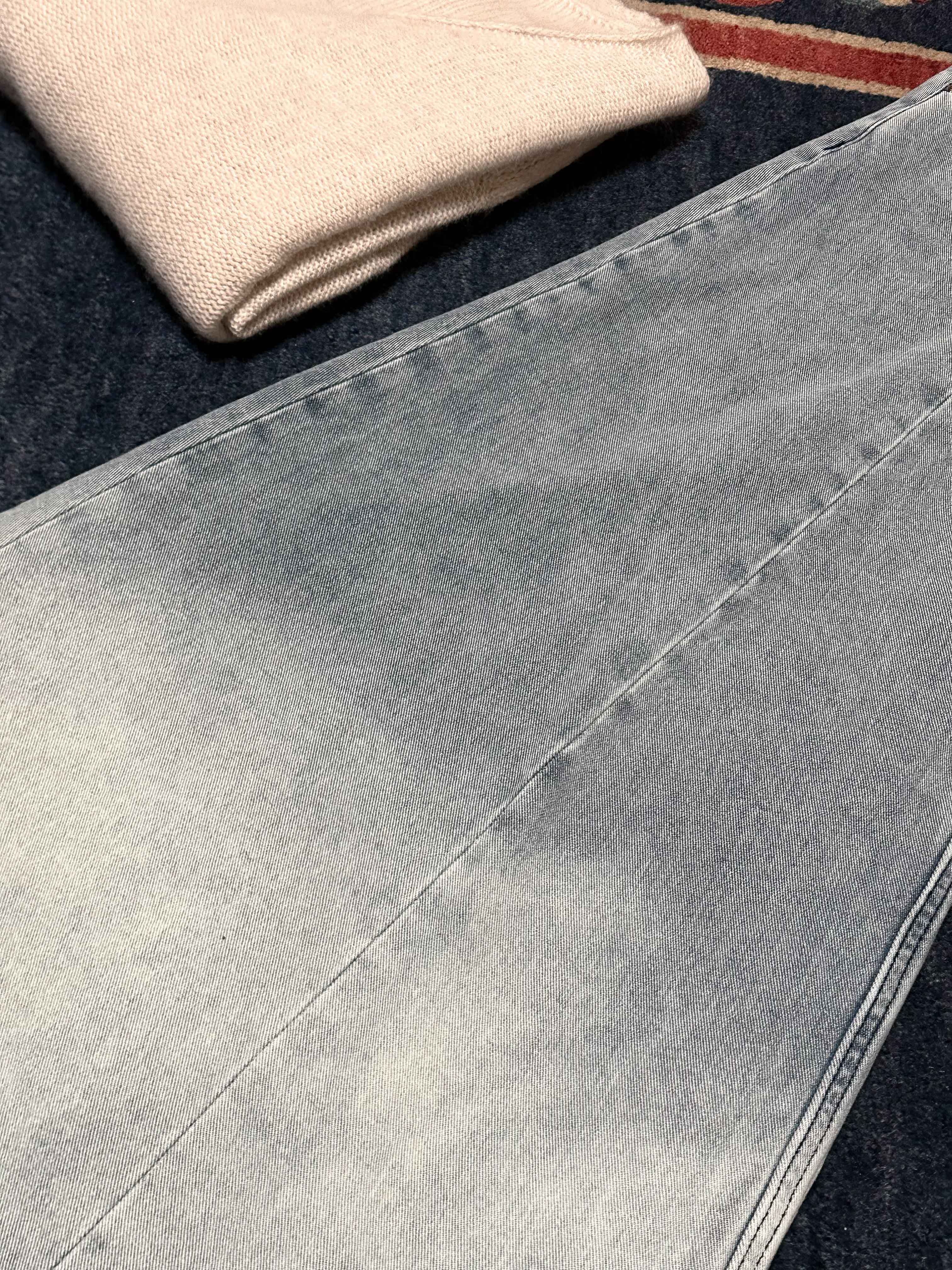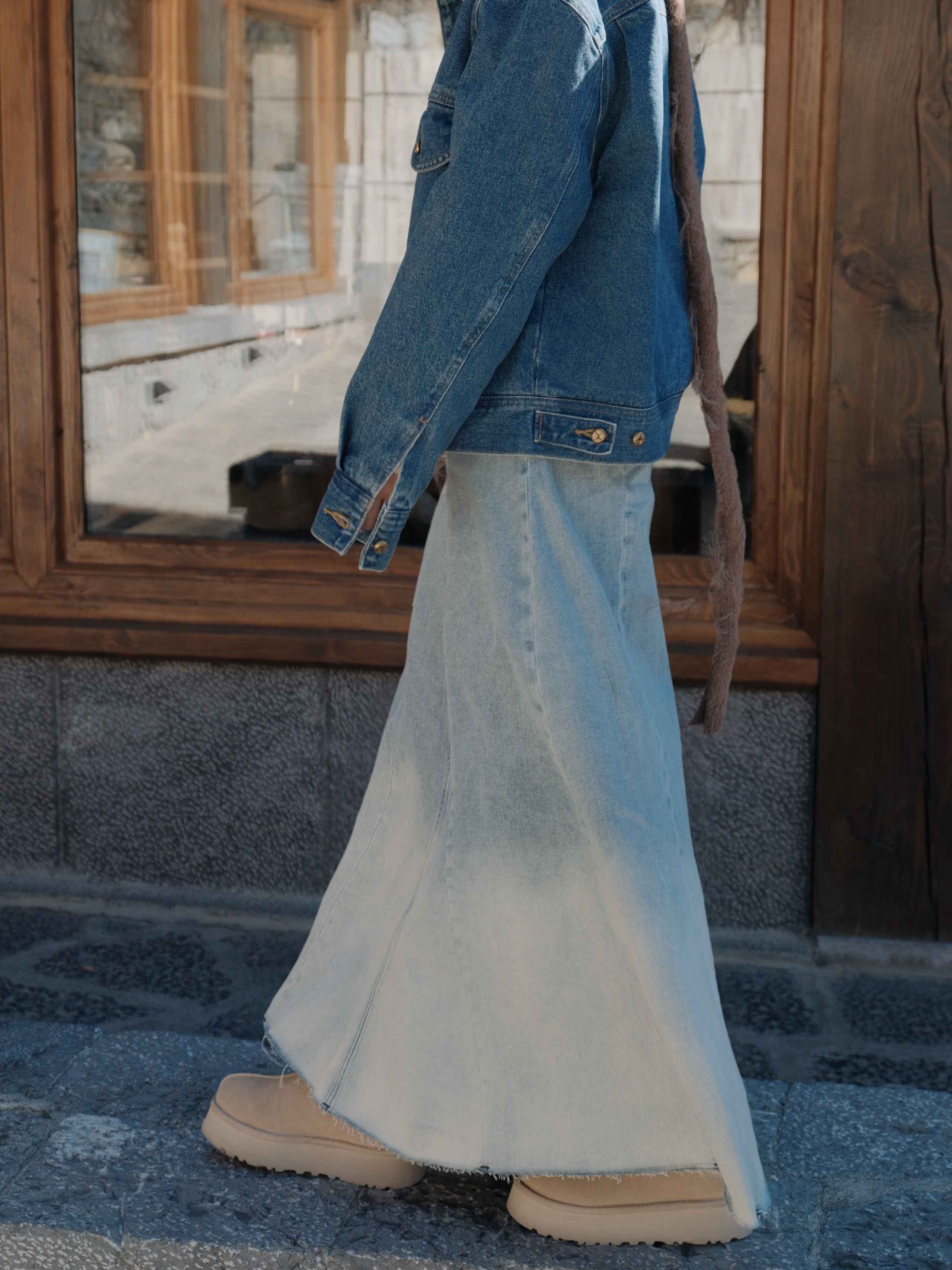 渐变洗水长牛仔半裙,A摆廓形,裙摆恰到好处的摆量,中性帅气。