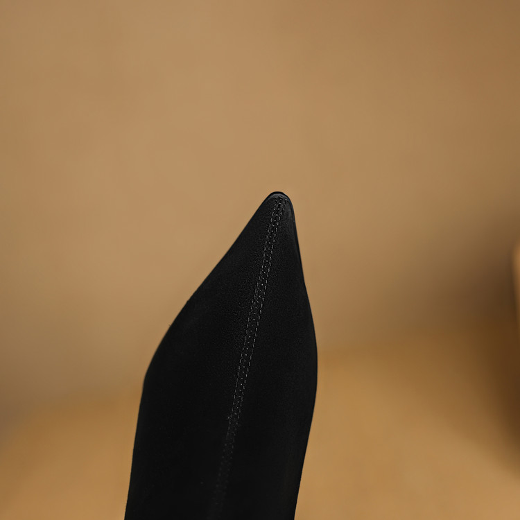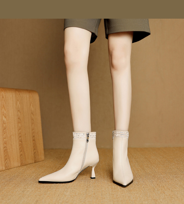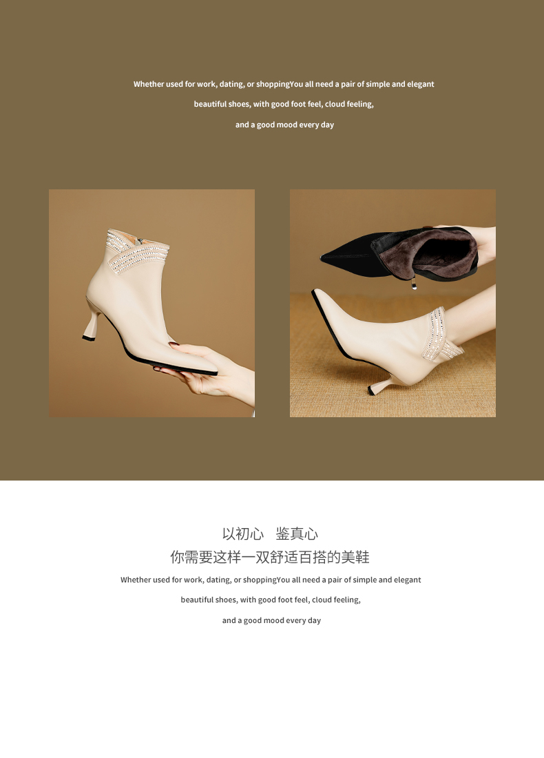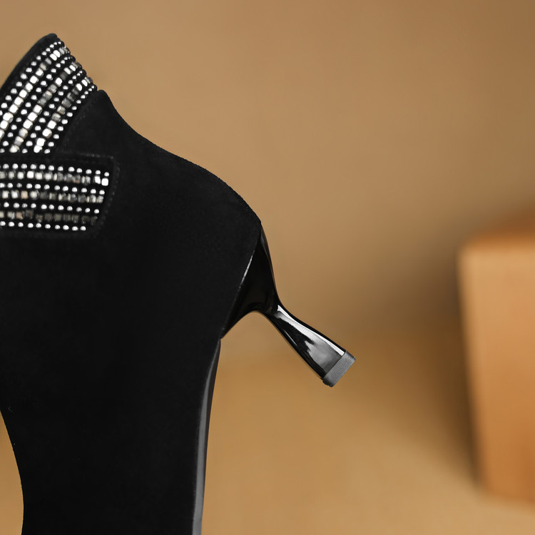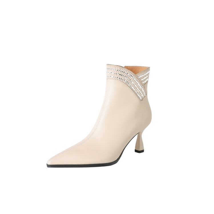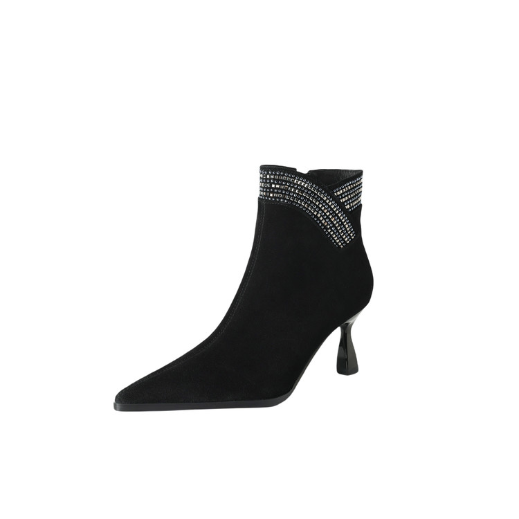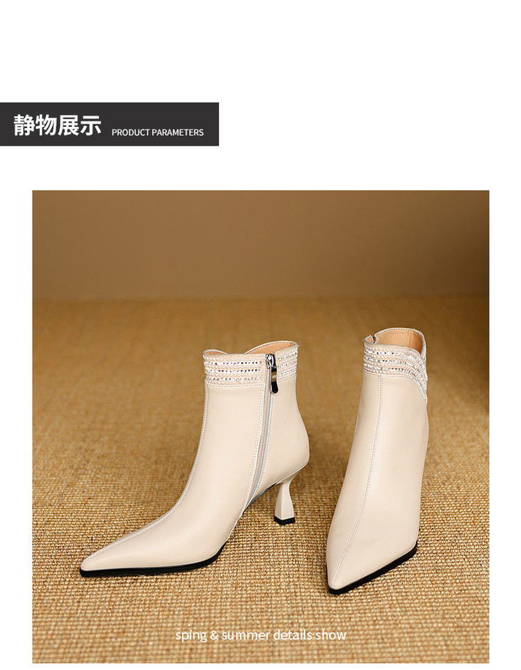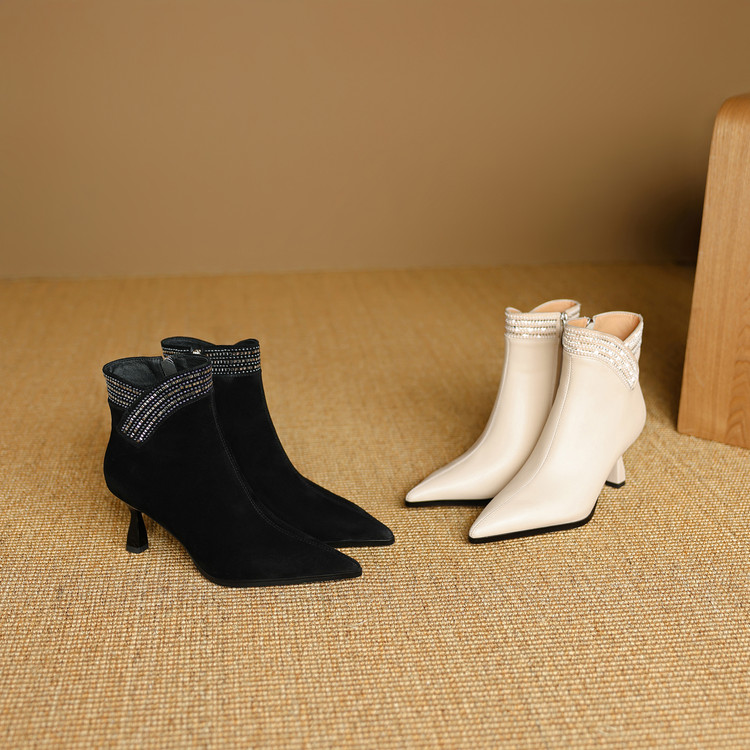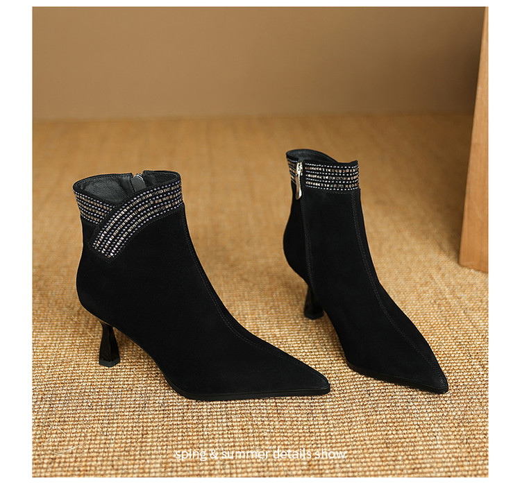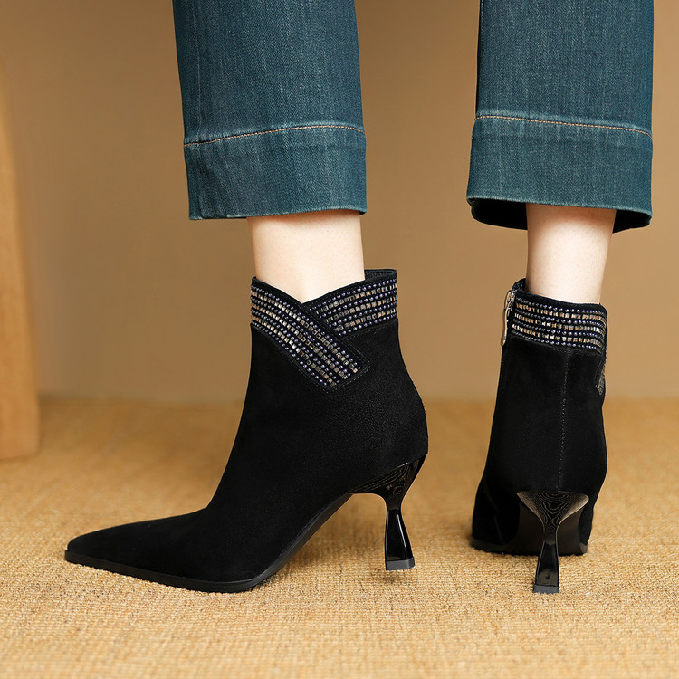 【预售5天】羊皮尖头细跟短靴女秋冬新款法式百搭水钻侧拉链高跟及裸靴子DB&M6588