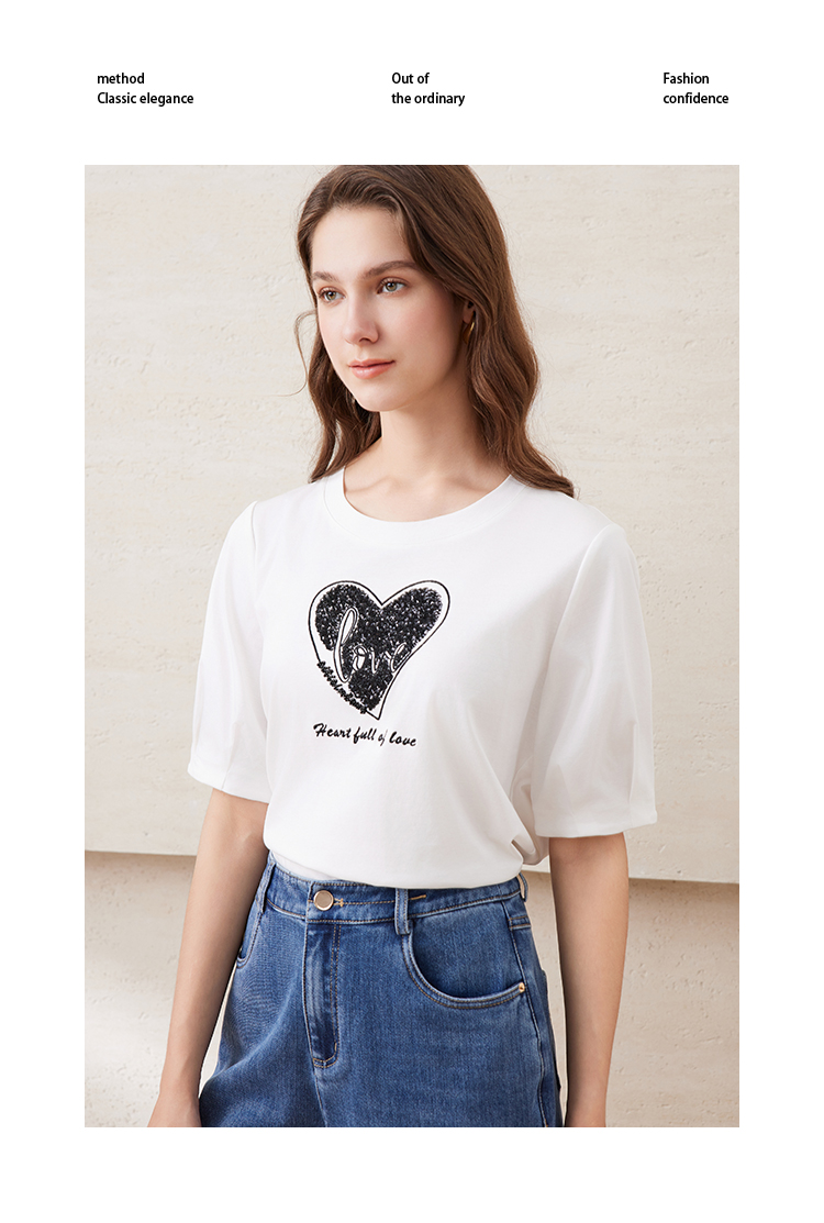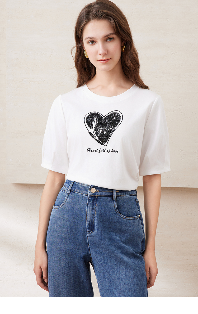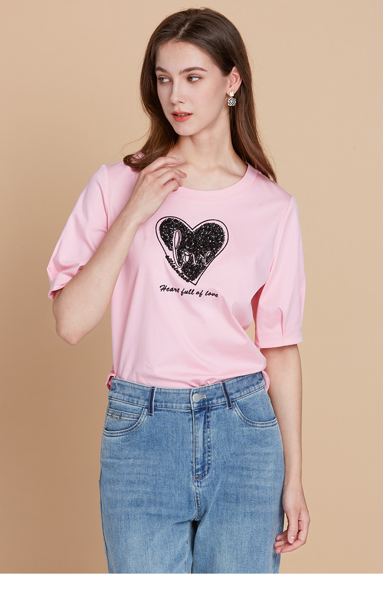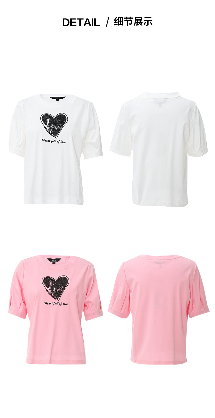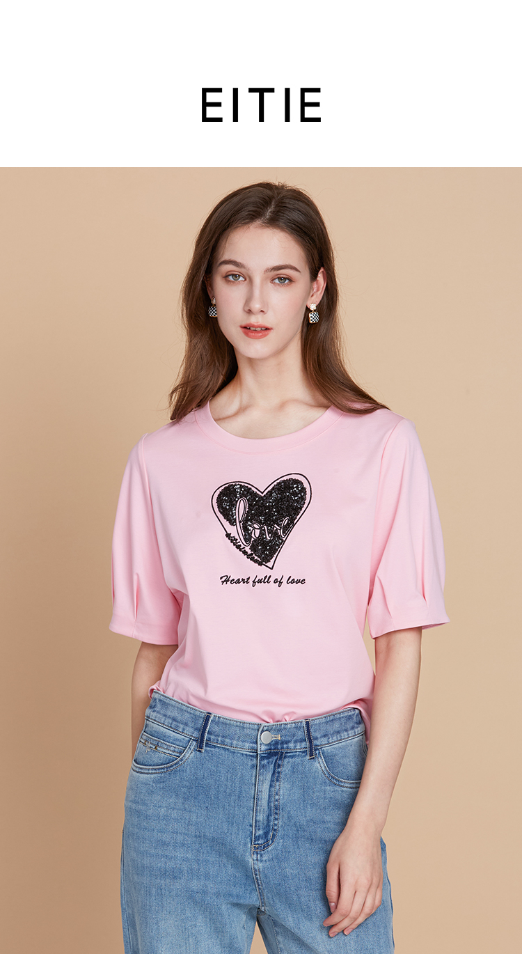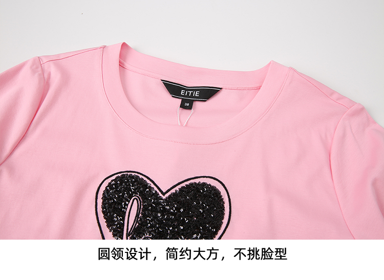 EITIE爱特爱夏季新款圆领亮片刺绣印花短袖纯棉T恤上衣女7702403