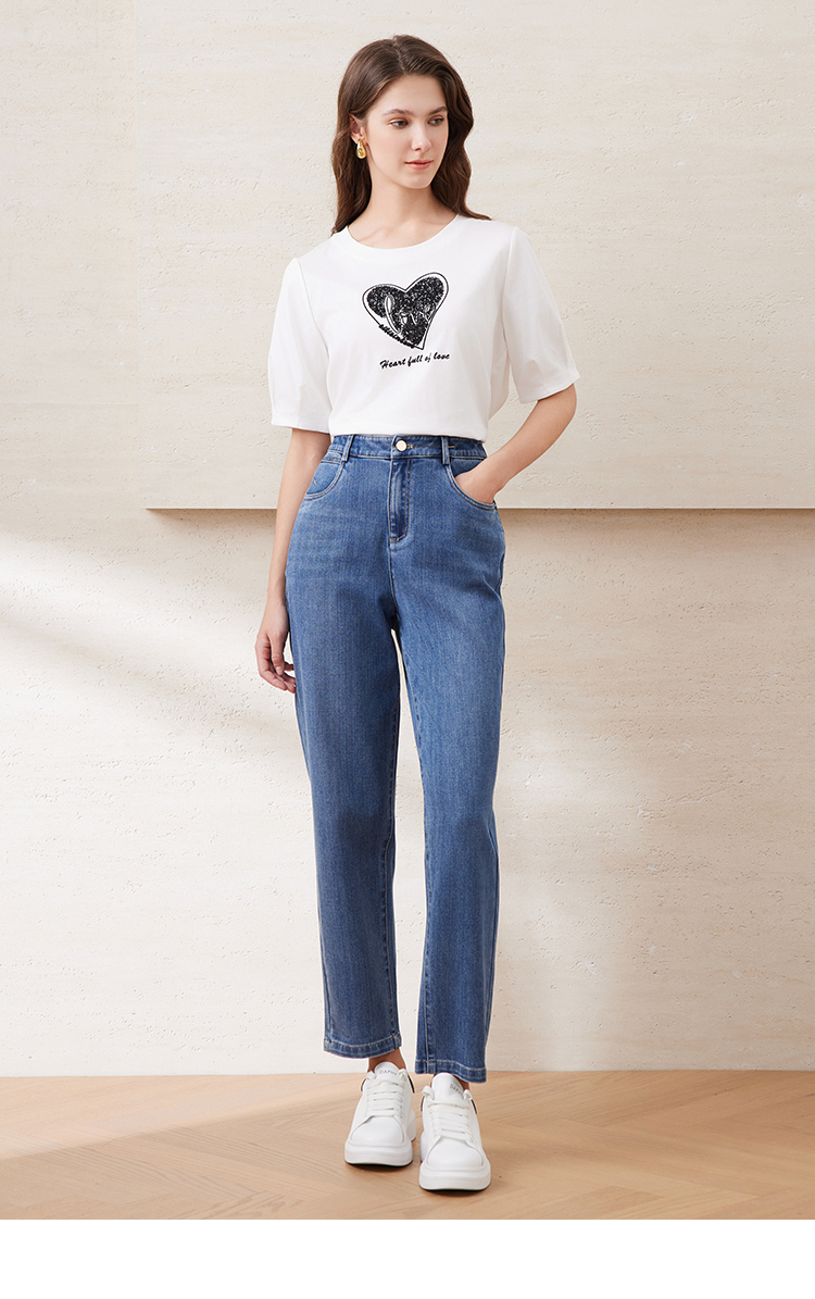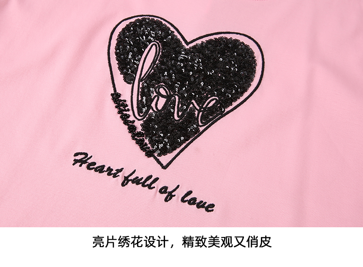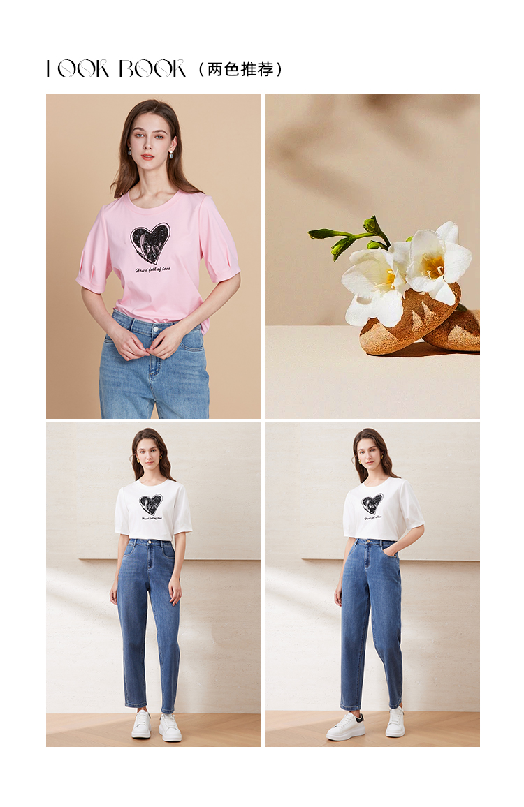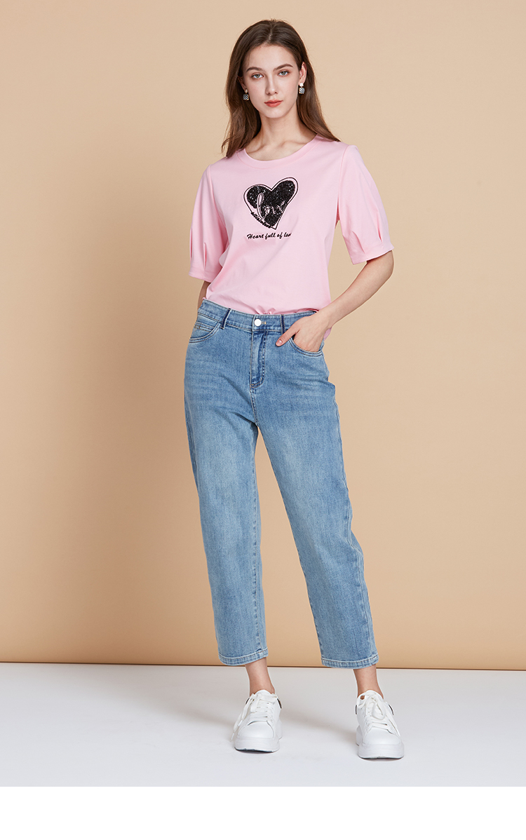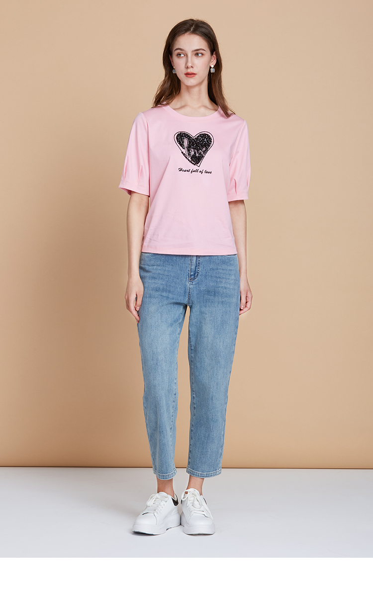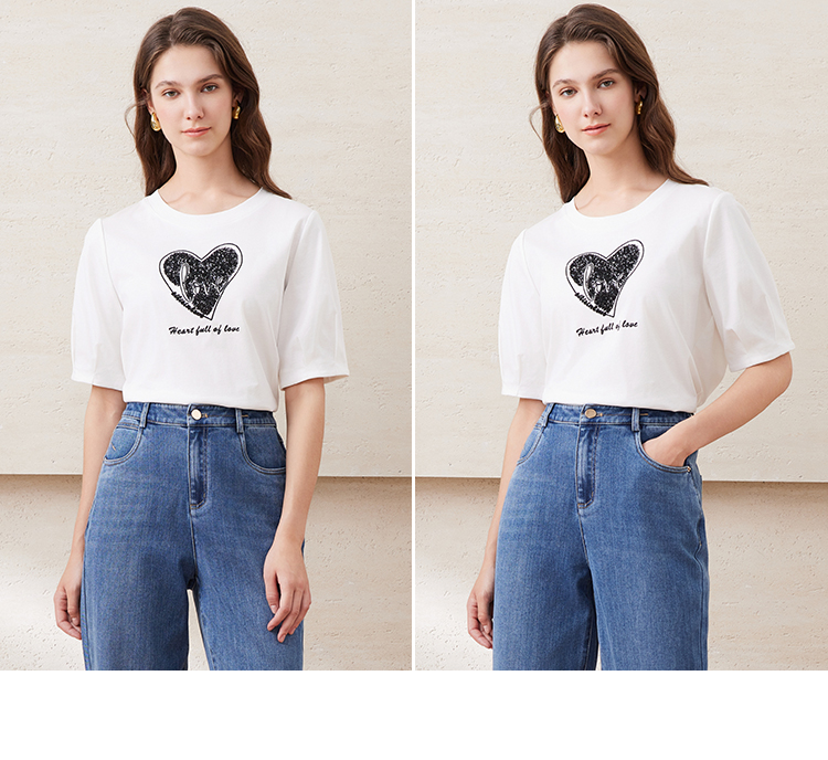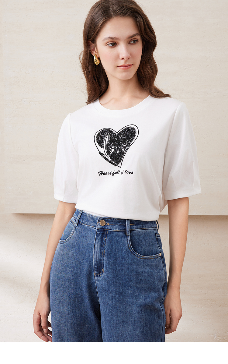 EITIE爱特爱夏季新款圆领亮片刺绣印花短袖纯棉T恤上衣女7702403