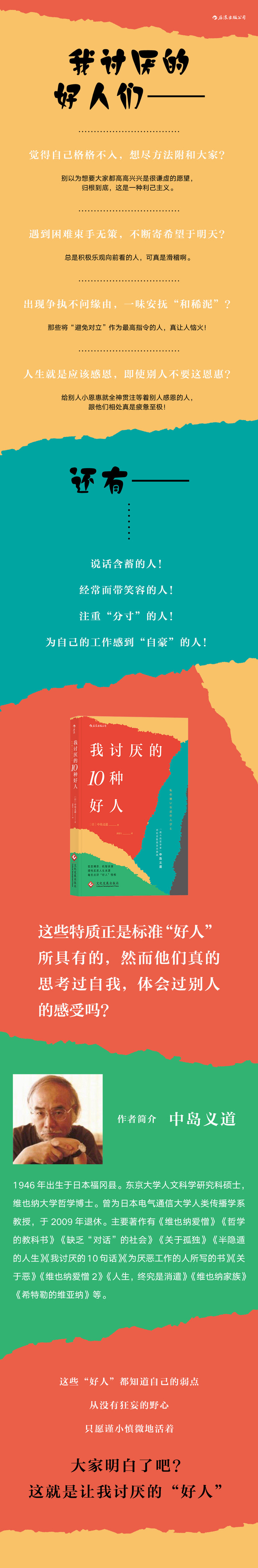 中岛义道,1946年出生于日本福冈县。东京大学人文科学研究科硕士,维也纳大学哲学博士。曾为日本电气通信大学人类传播学系教授,于2009年退休。主要著作有《维也纳爱憎》《哲学的教科书》《缺乏“对话”的社会》《关于孤独》《半隐遁的人生》《我讨厌的10句话》《为厌恶工作的人所写的书》《关于恶》《维也纳爱憎2》《人生,终究是消遣》《维也纳家族》《希特勒的维亚纳》等。