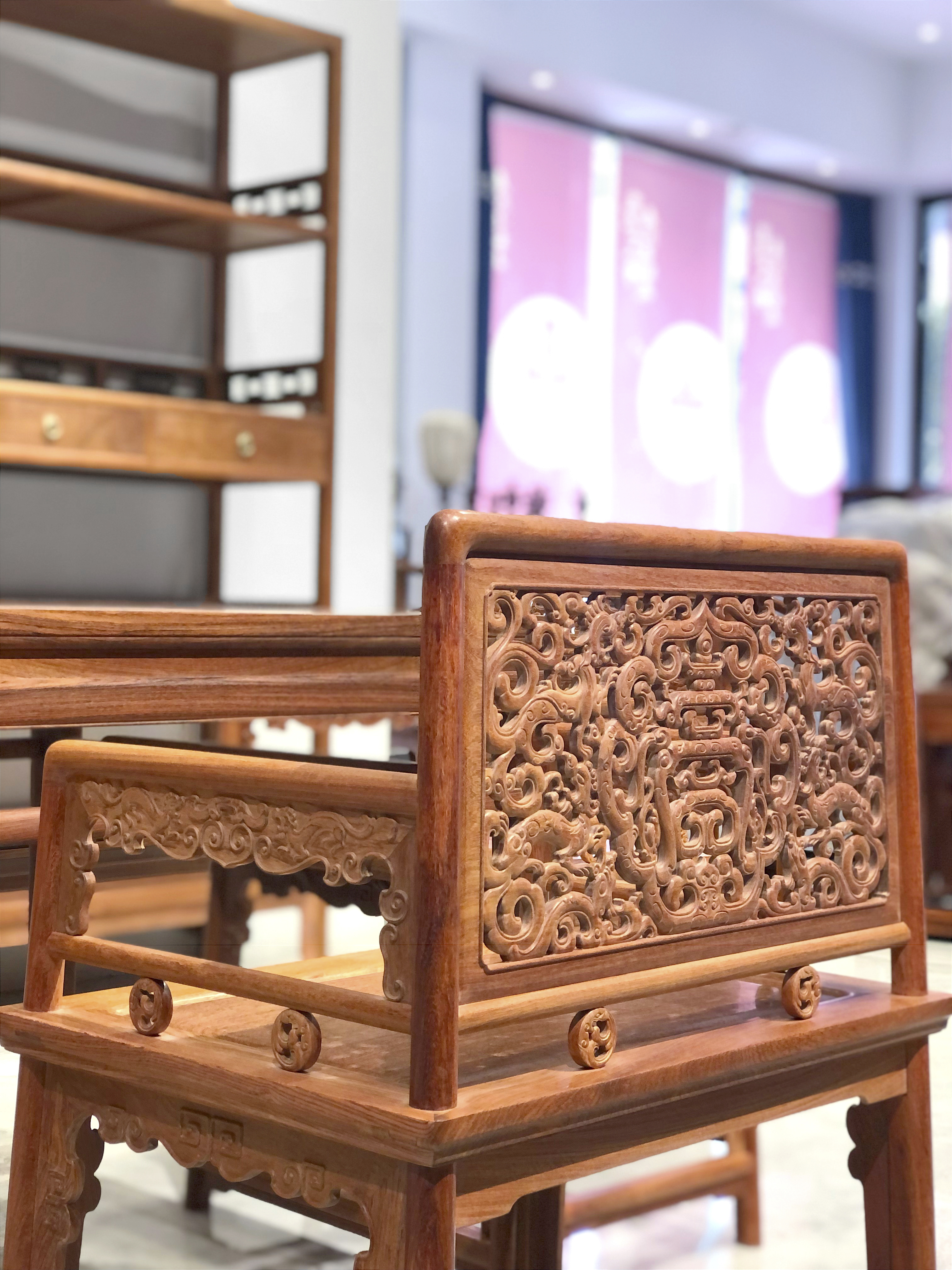 玫瑰椅原型为王世襄先生的《明式家具珍赏》一书中的,明黄花梨透雕靠背玫瑰椅。此椅在搭脑、后腿及靠近椅盘的横枨打槽,嵌装透雕花板,正中图案为“寿”字,左右两侧各雕饰三条螭龙,长尾卷转,布满整个空间,取“群龙捧寿”之意。扶手下装花牙,以如意云纹和螭龙纹点缀,三面横枨下各有透雕螭龙纹卡子花,座面下安装壶门牙板,浅雕卷草花纹,皆与靠背板的雕刻相呼应,这把椅子是非常典型的明清时期的玫瑰椅,此椅整体风格柔婉,典雅秀丽,可以随意置放,单独成景。