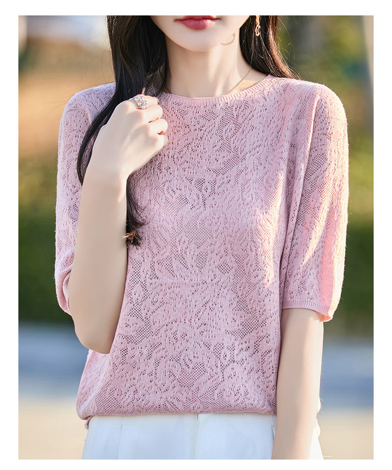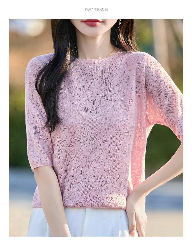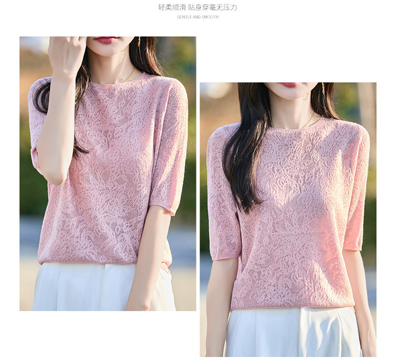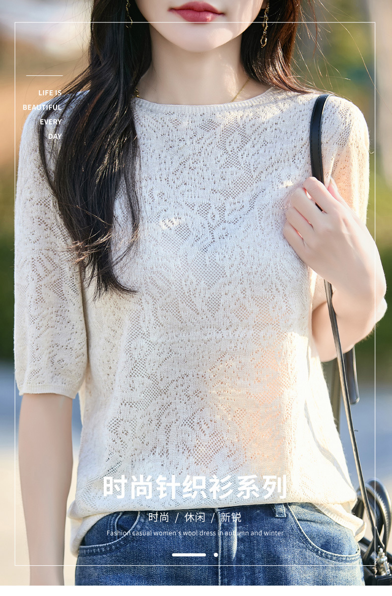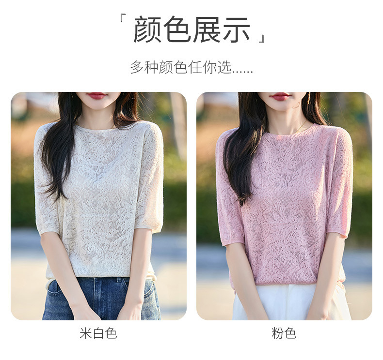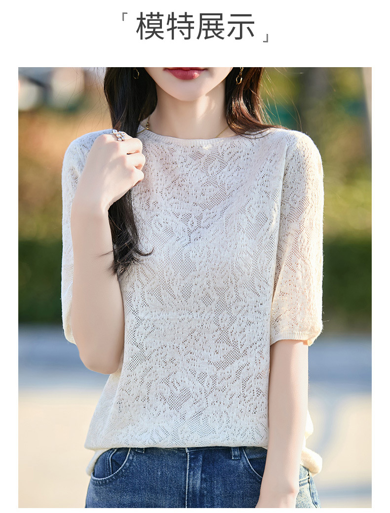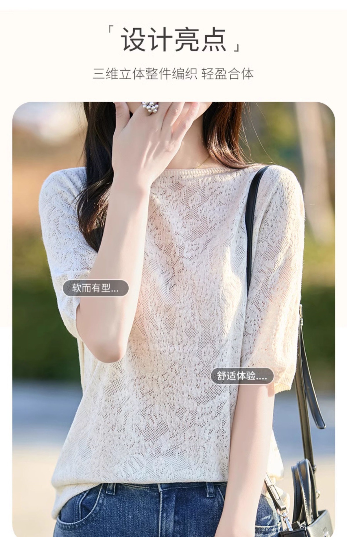 CC-LS-2292冰丝针织短袖t恤女夏季2025新设计感款蕾丝提花打底洋气薄款上衣