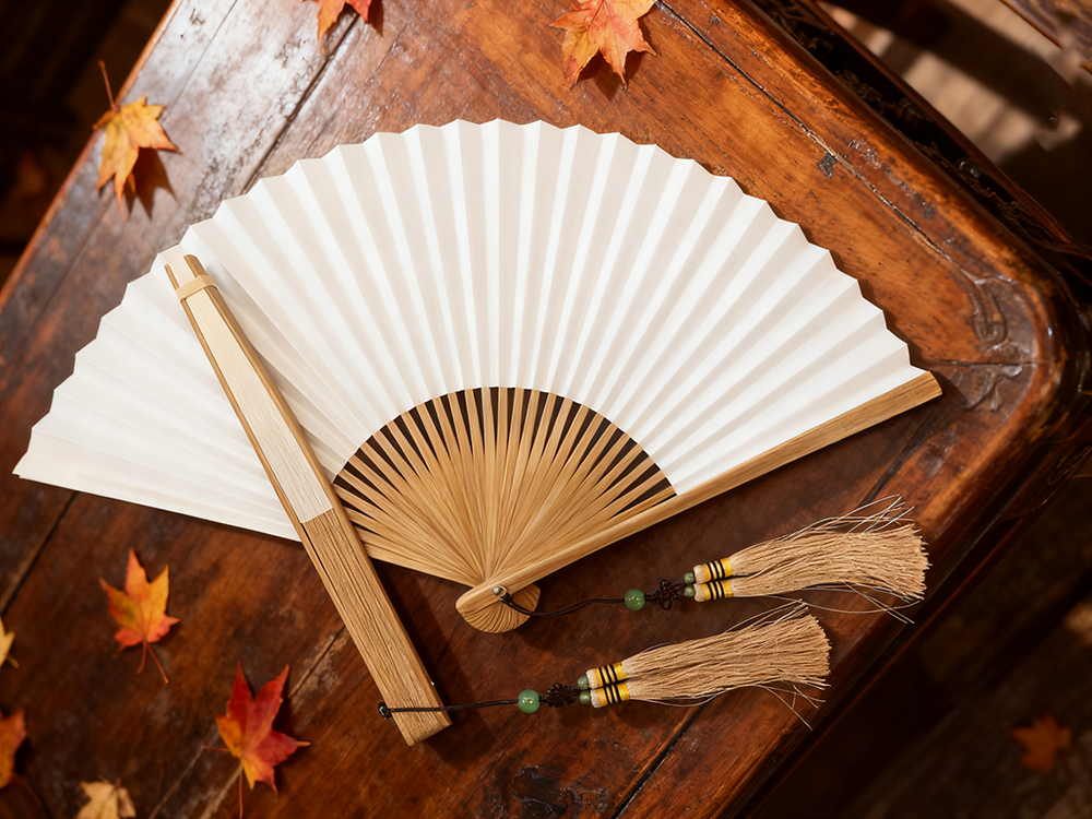 竹骨的浅棕与纸扇的莹白相映,如截一段时光入怀;同系的流苏缀着绿珠,在光影里漾着雅致。