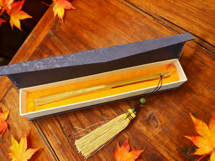 深蓝锦盒轻启,一方橙绒衬里托着竹扇,清透竹骨在光下泛着温润的黄;待你开盒时,便有古韵与秋情一同漫溢开来~~~
