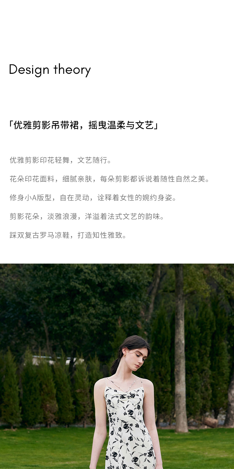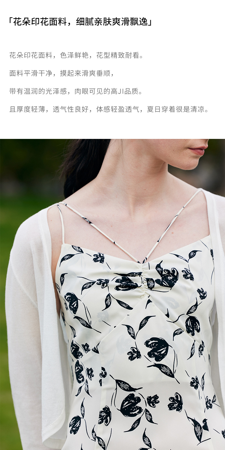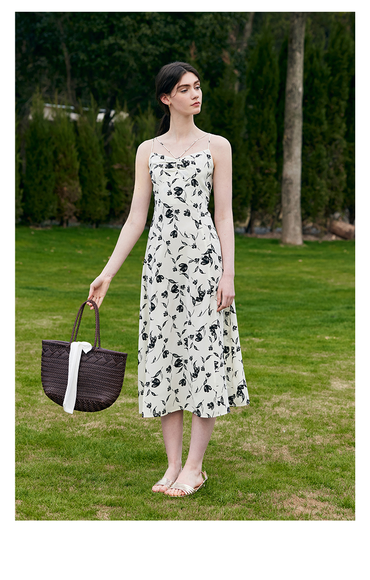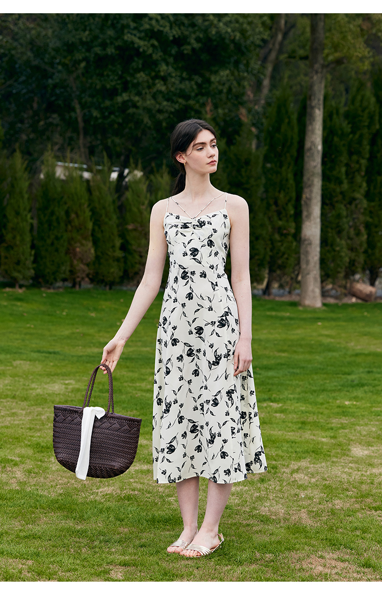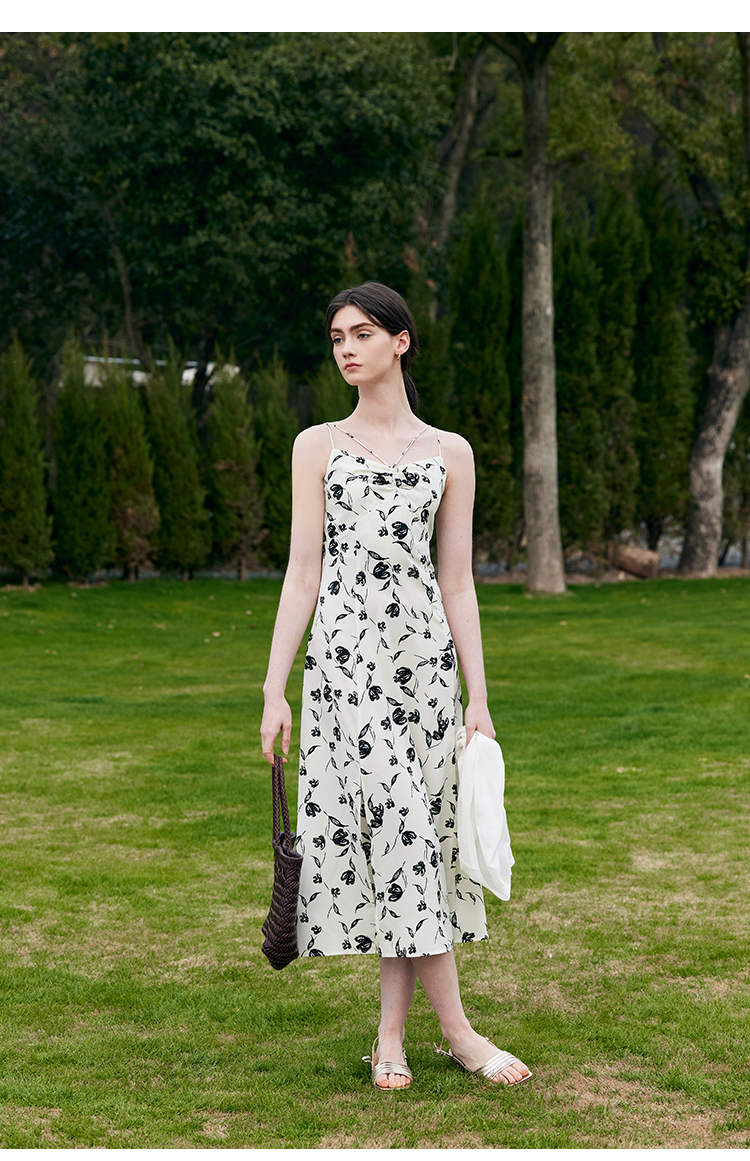 HeyDress黑白印花吊带裙女夏季法式复古收腰浪漫剪影碎花连衣裙子