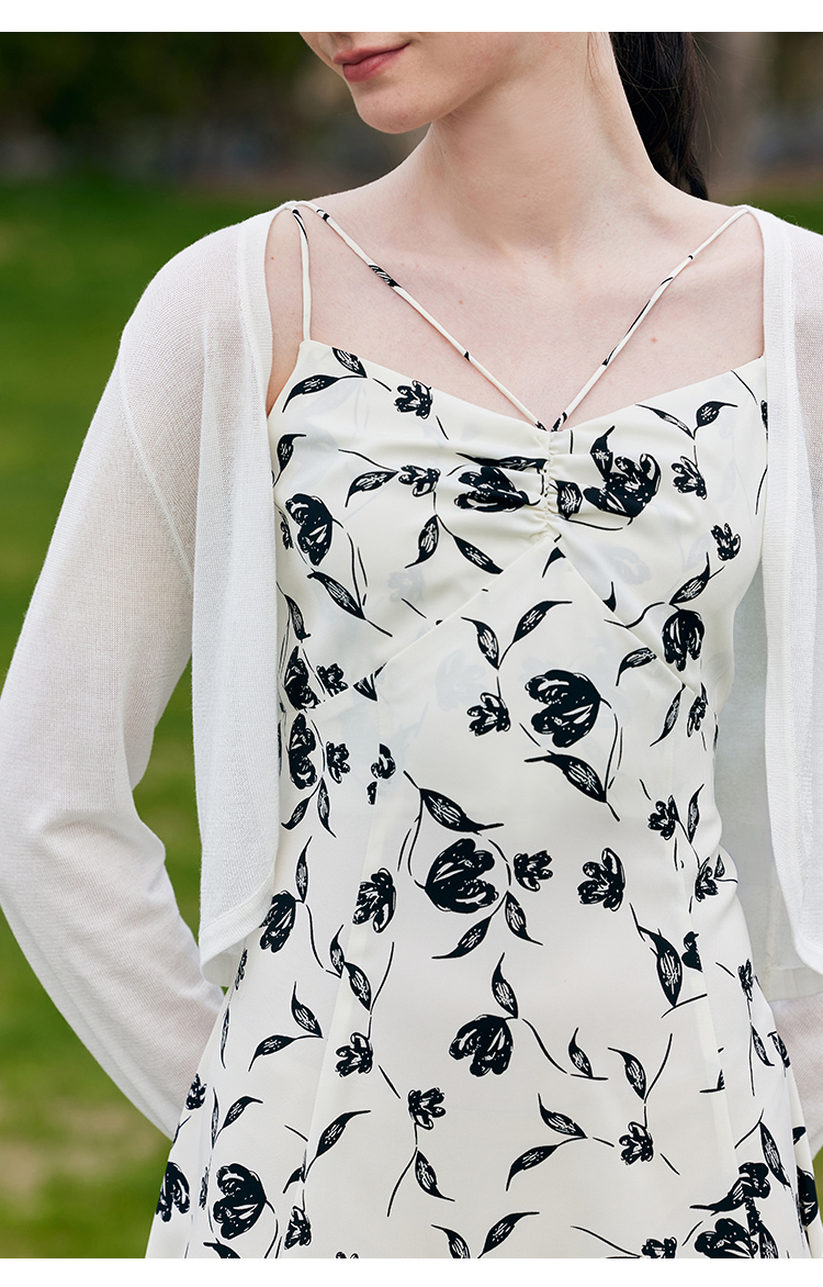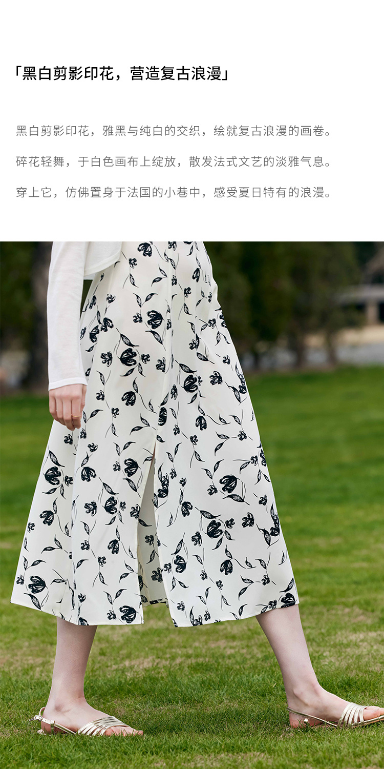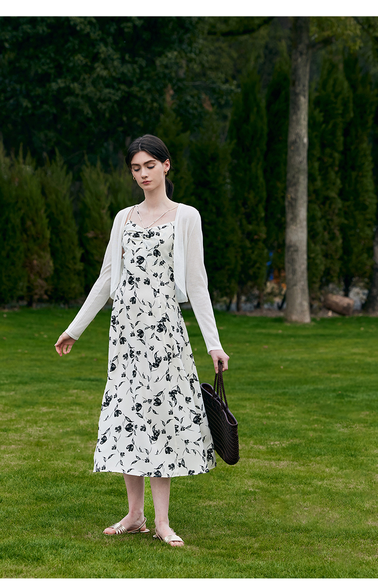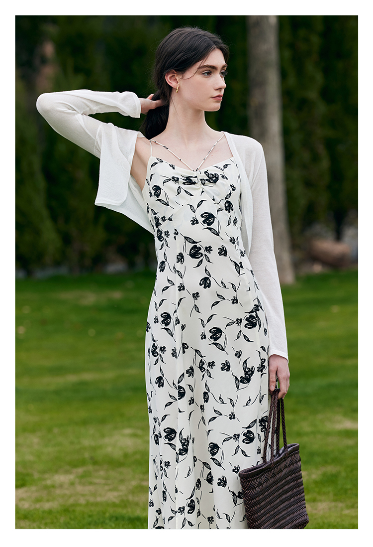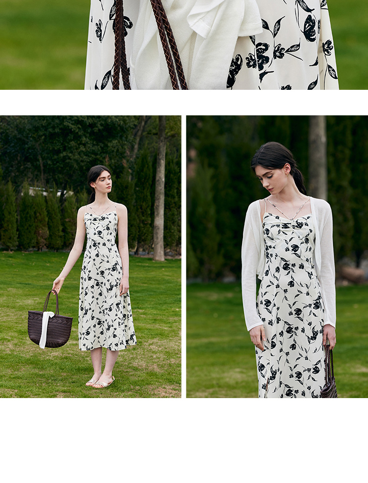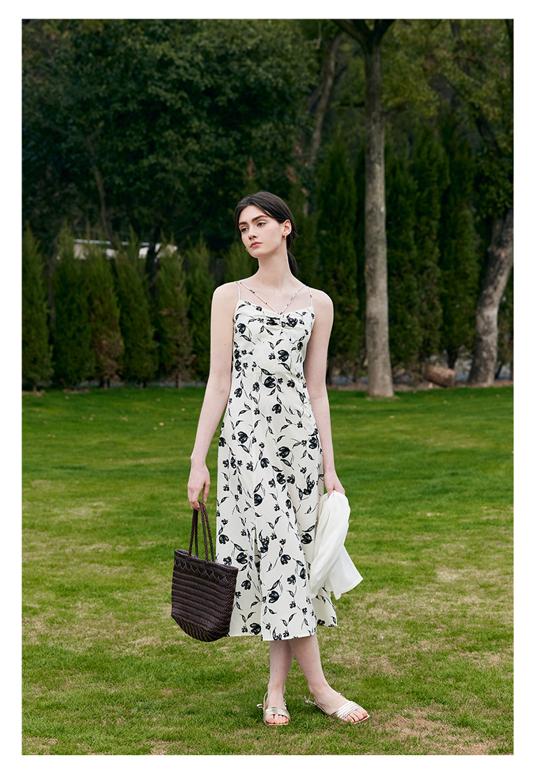HeyDress黑白印花吊带裙女夏季法式复古收腰浪漫剪影碎花连衣裙子