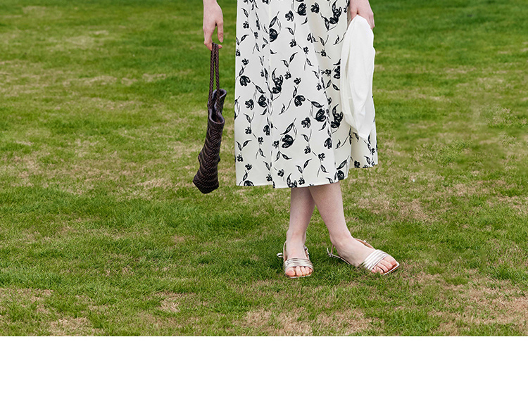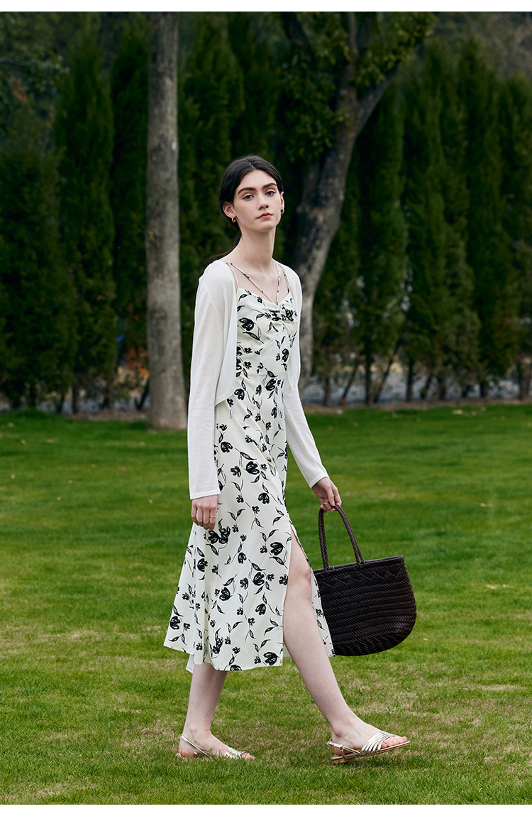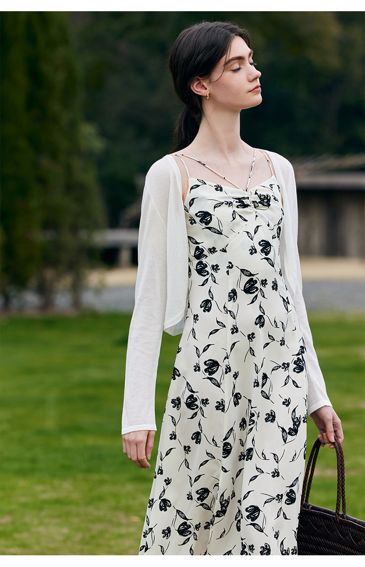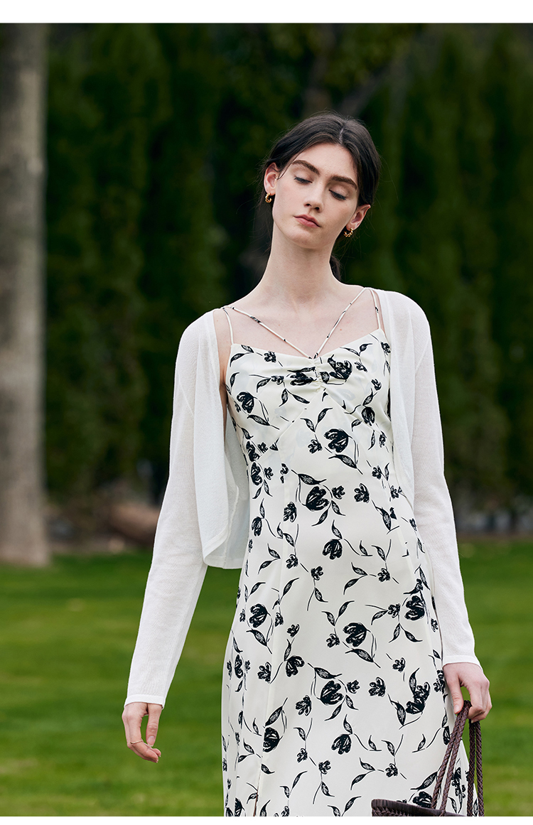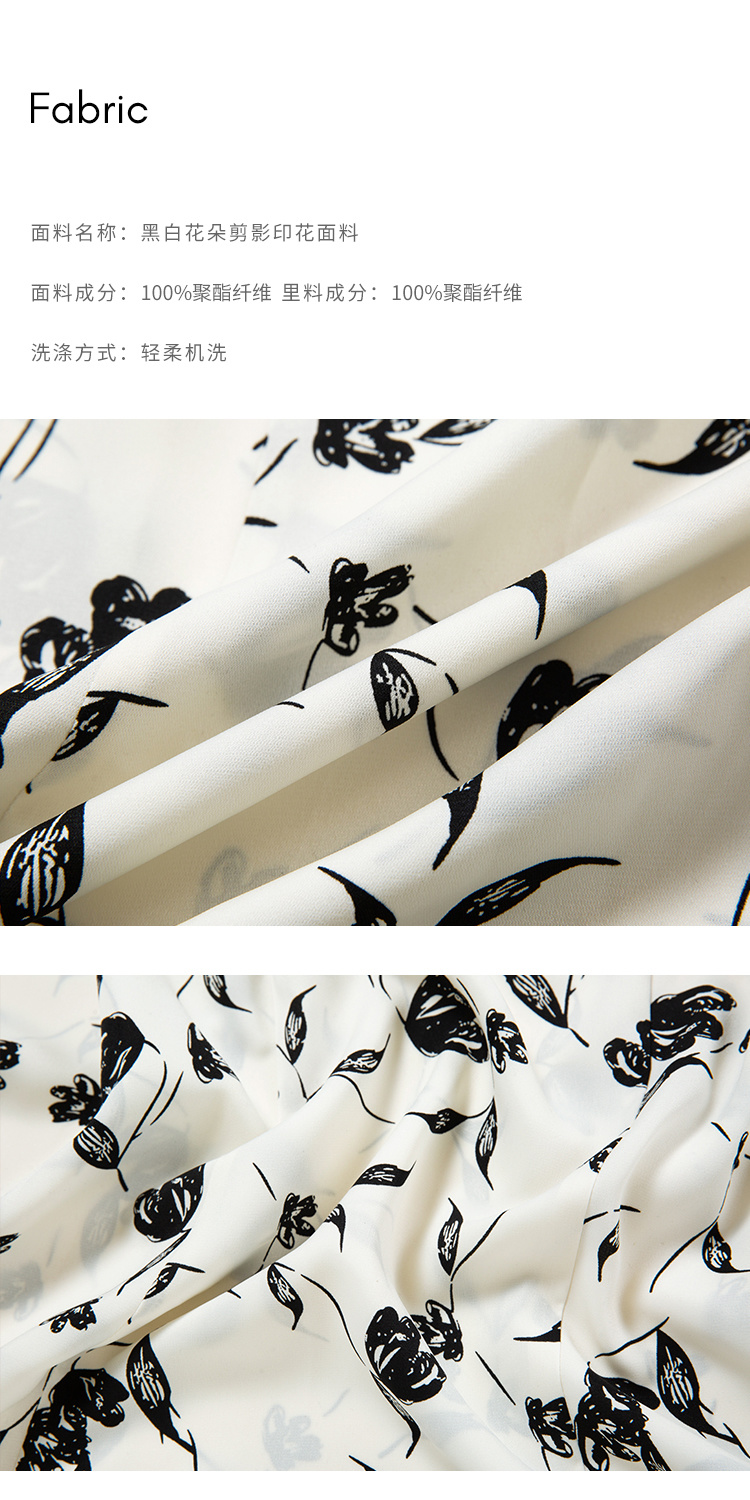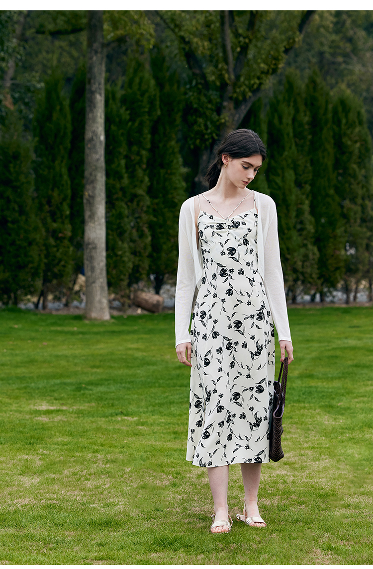 HeyDress黑白印花吊带裙女夏季法式复古收腰浪漫剪影碎花连衣裙子