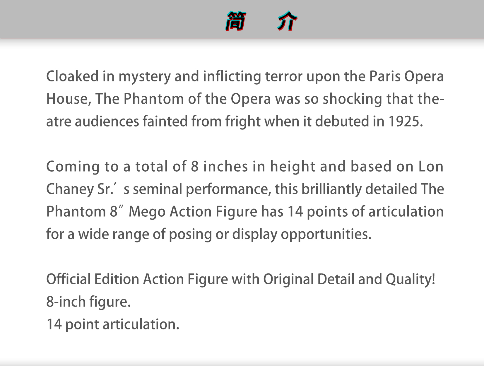 现货 Mego 歌剧魅影 Phantom of the Opera 8英寸 可动