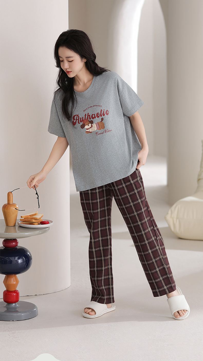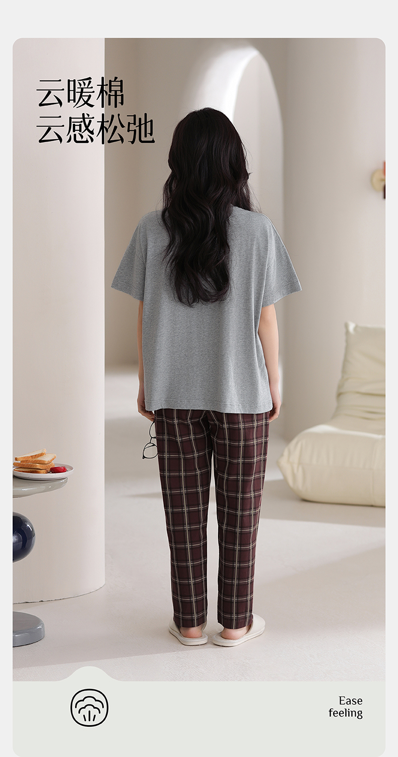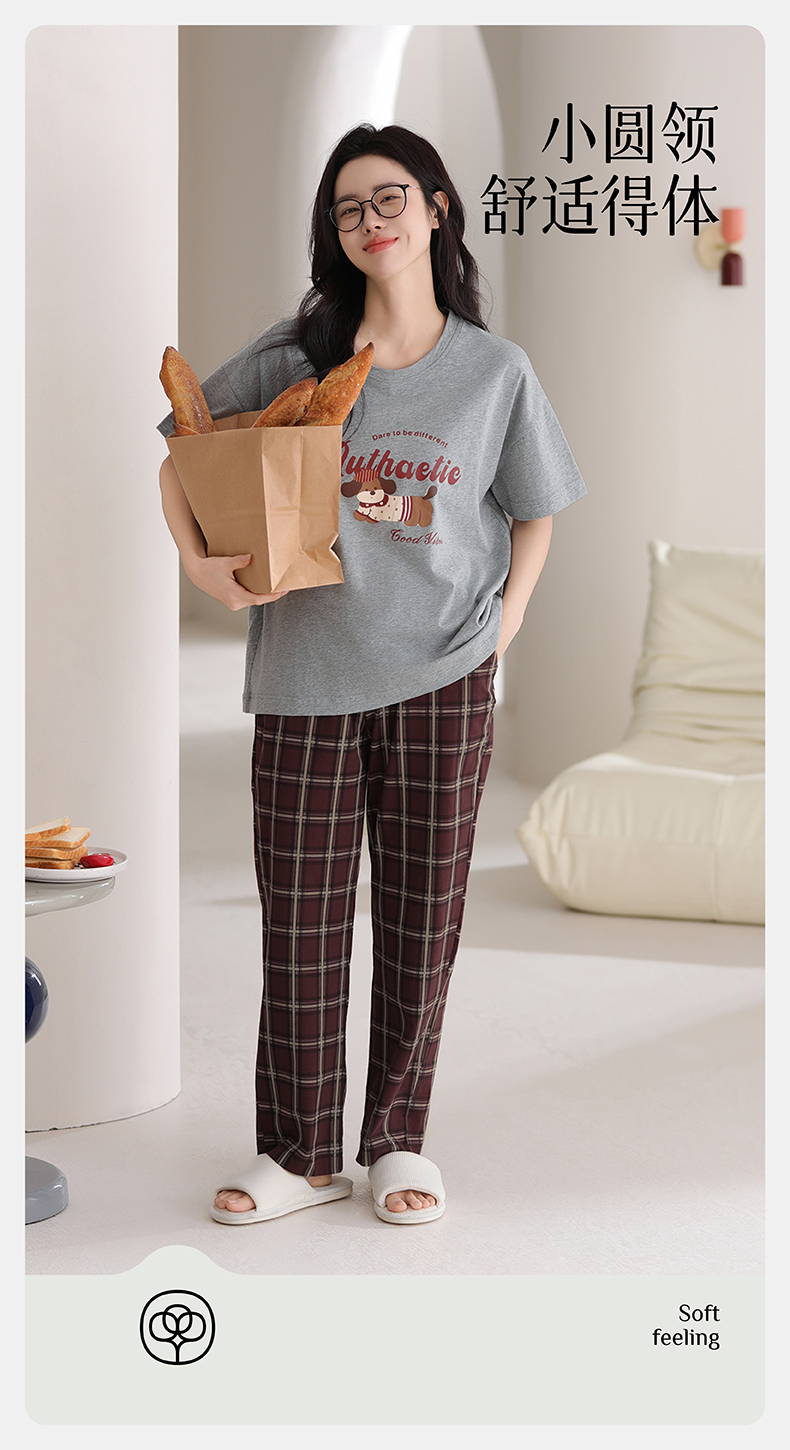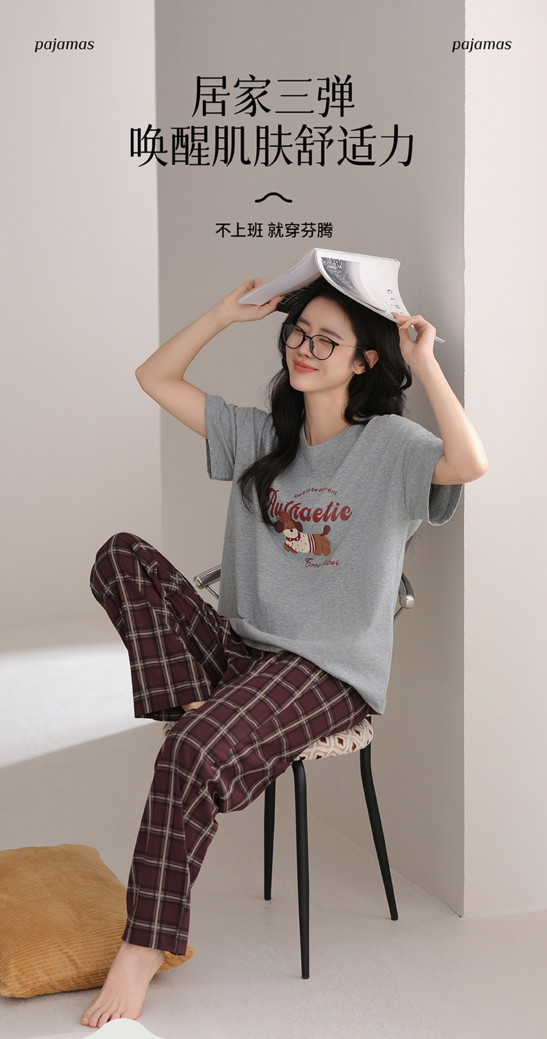 芬腾睡衣女款夏季短袖长裤薄款休闲可爱圆领套头可外穿家居服套装