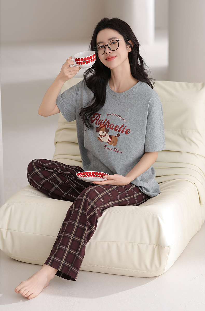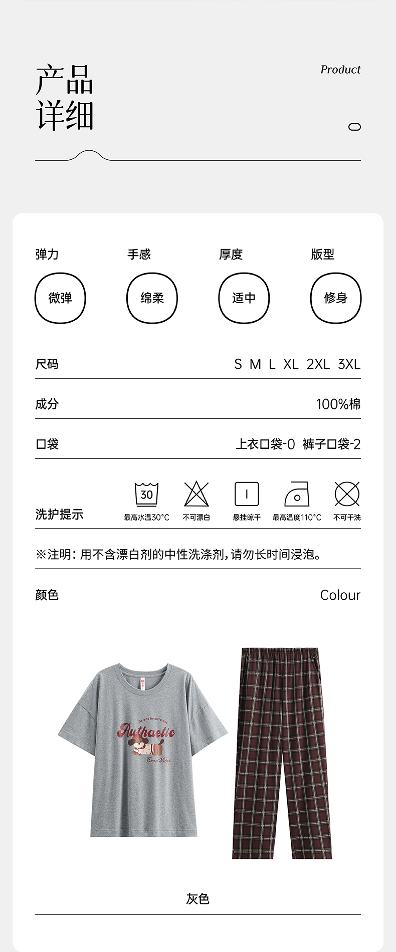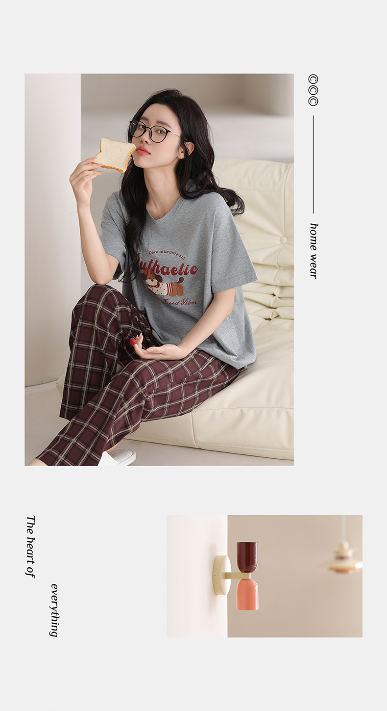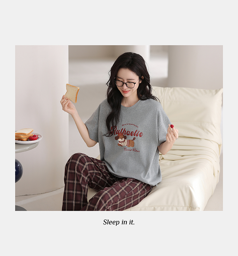 芬腾睡衣女款夏季短袖长裤薄款休闲可爱圆领套头可外穿家居服套装