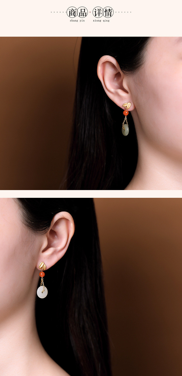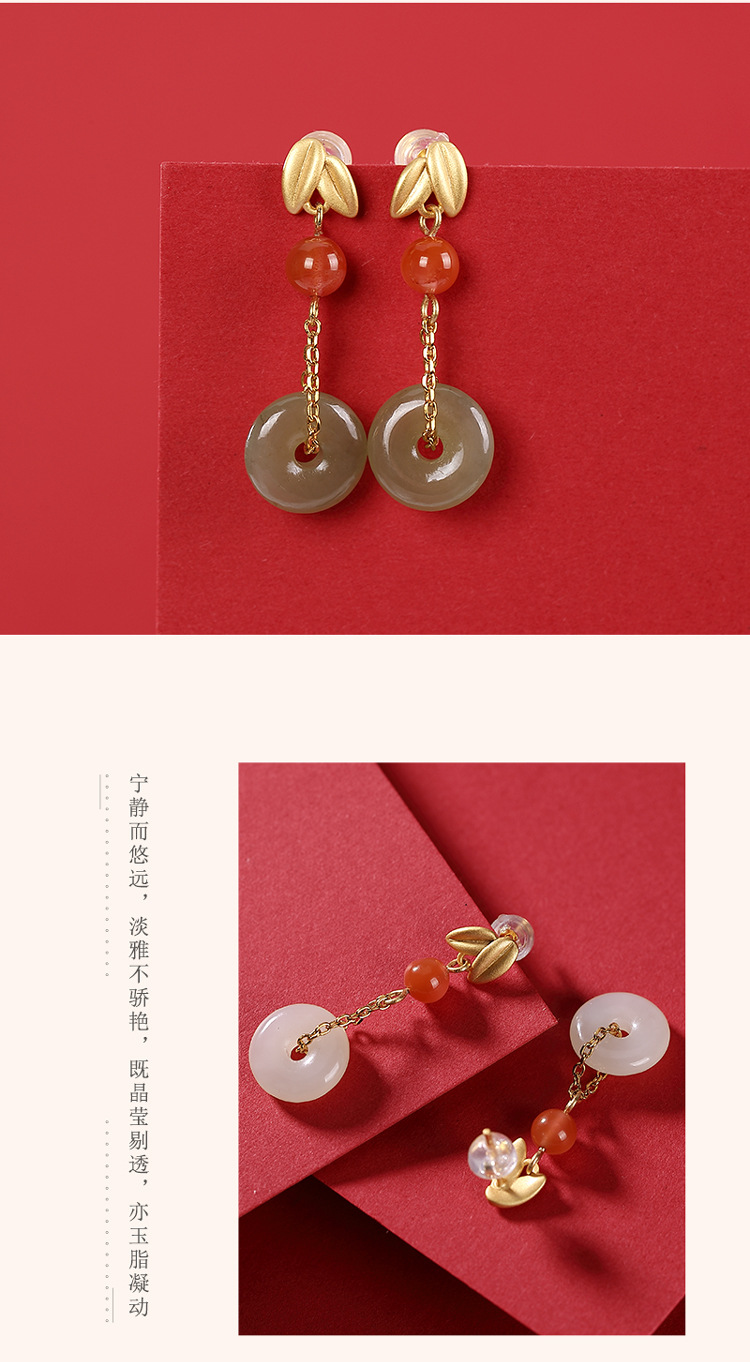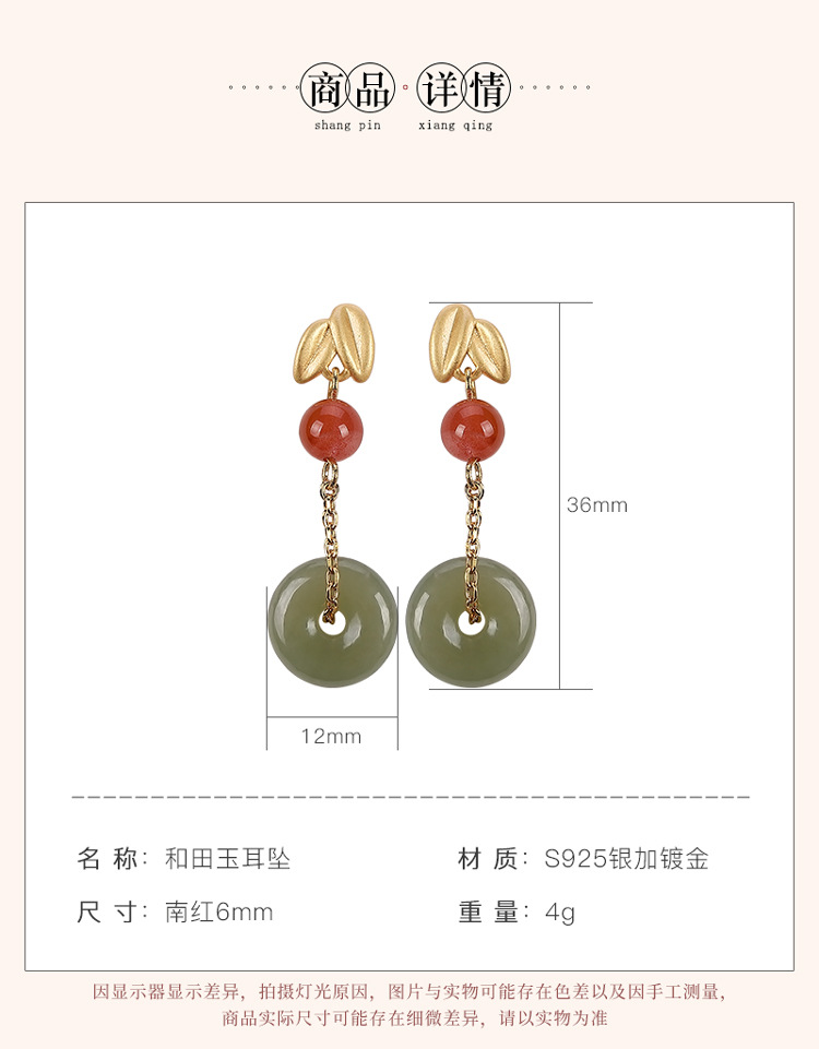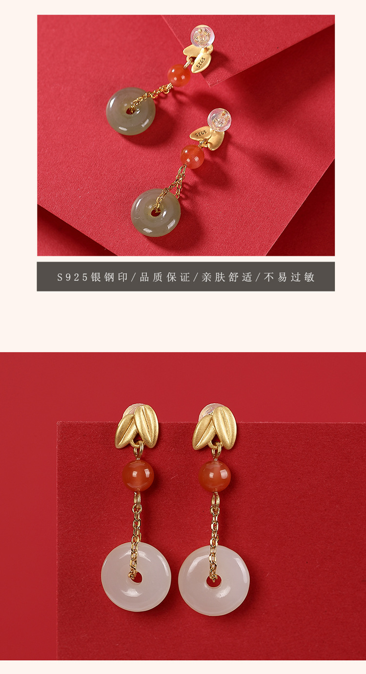 S925纯银镀金南红和田玉个性竹叶复古平安扣耳钉耳坠 CW