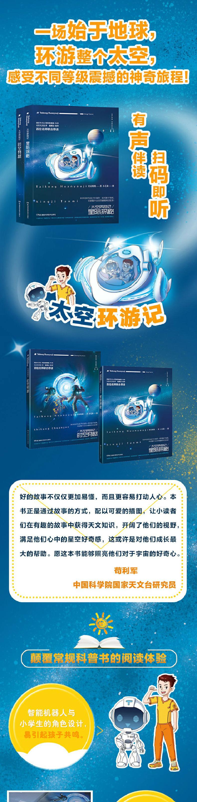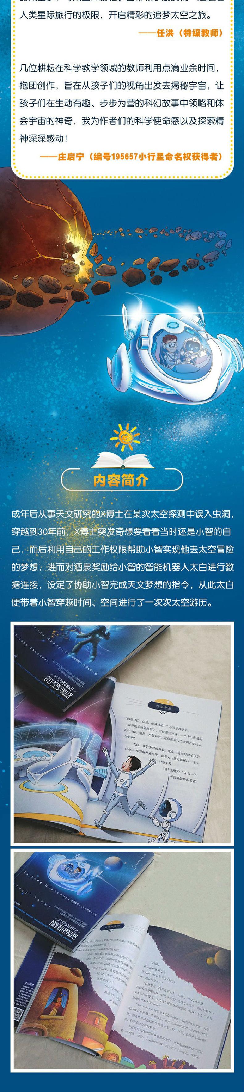 成年后从事天文研究的X博士在某次太空探测中误入虫洞,穿越到30年前,X博士突发奇想要看看当时还是小智的自己,而后利用自己的工作权限帮助小智实现他去太空冒险的梦想,进而对酒泉奖励给小智的智能机器人太白进行数据连接,设定了协助小智完成天文梦想的指令,从此太白便带着小智穿越时间、空间进行了一次次太空游历,本书以小智和智能机器人太白穿越到太空、过去以及未来的所见所闻,从宇宙天体知识、前沿天文追踪两个方面向小读者们呈现了一副活灵活现的天文画卷,对于书中描绘的太空场景以及天体奇观,均有精美图片作为参考,作者以故事情节体验及类比的形式让大量炫酷、晦涩的天文概念变得通俗易懂,帮助孩子在故事中轻松掌握天文知识,建立基础的宇宙观,开阔科学视野,提升科学核心素养,见过宇宙的博大,才有浩荡的心胸!