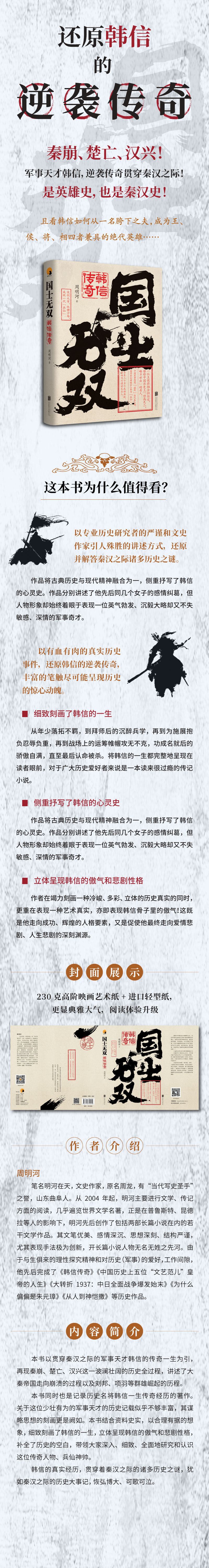本书是记录历史名将韩信一生传奇经历的著作。淮阴少年韩信自小便胸怀大志,幼年与母亲相依为命,生活在社会底层,但任何环境的压抑也无法磨灭他的那颗勃勃雄心。他艰苦求学,学成之后又坐吃山空,为求生存不得不跟着商队奔波。秦末农民战争爆发以后,他先是投军项梁、项羽叔侄,感觉不受重视后又归附汉王刘邦,并在汉相国萧何的鼎力举荐下被任命为汉军大将军。他智虑宏远、用兵如神,从此开始了他辉煌至极的军事统帅生涯……全书对韩信的一生进行了细致的刻画与描绘,既突出了韩信的军事才能和累累战功,又描写了他的个人感情经历,对韩信功高于世却落个夷灭宗族下场背后的心路历程的转变有精彩刻画。本书将古典历史与现代精神融合为一,着重抒写了韩信的心灵史,并分别讲述了他先后同几个女子的感情纠葛,但人物形象却始终着眼于表现一位英气勃发、沉毅大略却又不失敏感、深情的军事奇才!