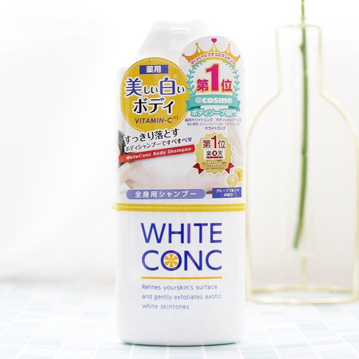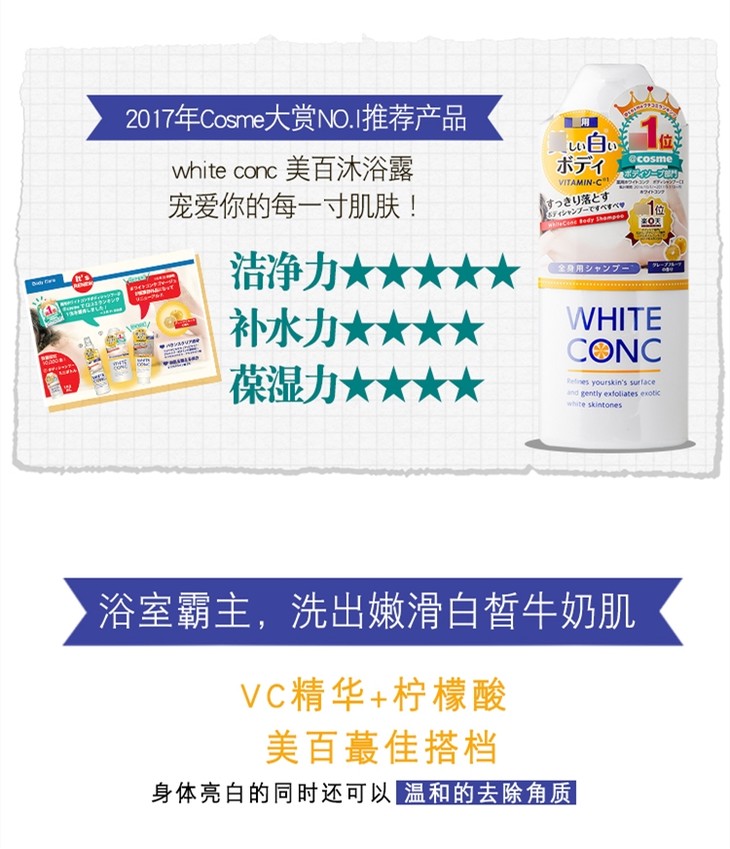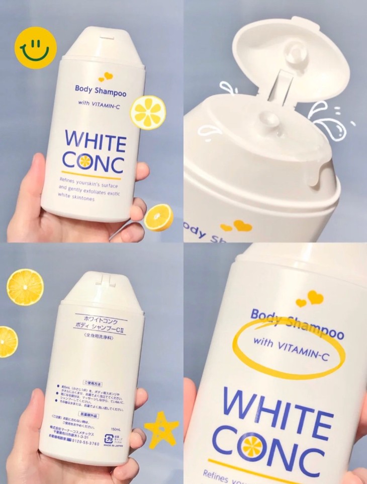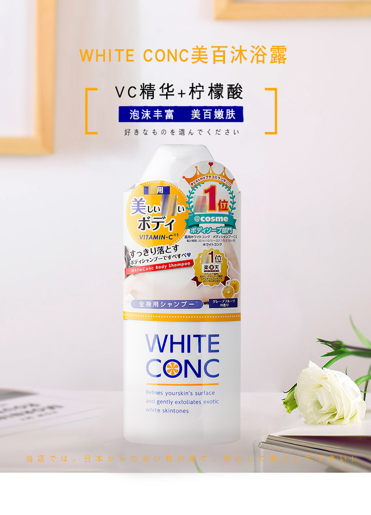 WHITECONC维C美白沐浴露360ml👍小红书林允同款🔥,可以令你白成一道光⚡,越洗越白的沐浴露。萃取柠檬精华及丰富的VC诱导体🍋,身体白的同时还可以温和的去角质👊。打开瓶盖一股新鲜的柠檬清香味袭来,非常治愈的清香🌬。乳白色稍稀薄的质地☁,气泡不是很丰富,但是打出来的泡泡特别绵密。使用一段时间,真的会变白✨!温馨提示此款沐浴露含有去角质和美白的功效,所以不建议🙅每天使用哦,连用两条隔两天再用更佳。
