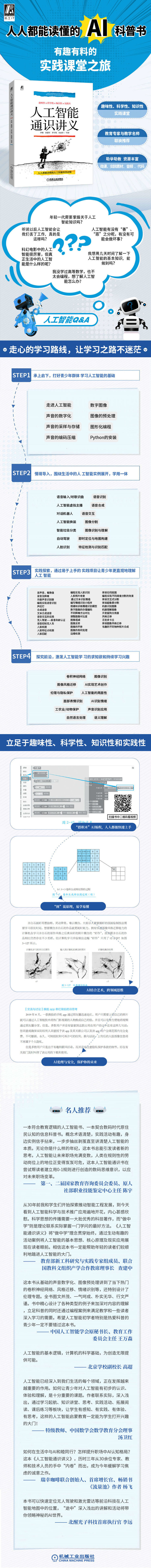 一本符合教育逻辑的人工智能书、一本契合数码时代原住民认知的信息科普书。概念术语清楚,实践活动有趣,身边实例信手拈来,一步步抽丝剥茧直至讲清楚人工智能的本质。无论你是什么样的年纪,这本书总能引发读者新的思考。人工智能让未来职场充满变数,人类在规则性的劳动岗位上的地位正变得岌岌可危,这本人工智能通识书在尝试帮读者建立用0-1规则进行创造的数码思维意识,以应对未来职场变革。