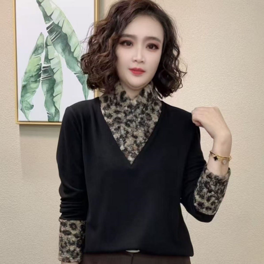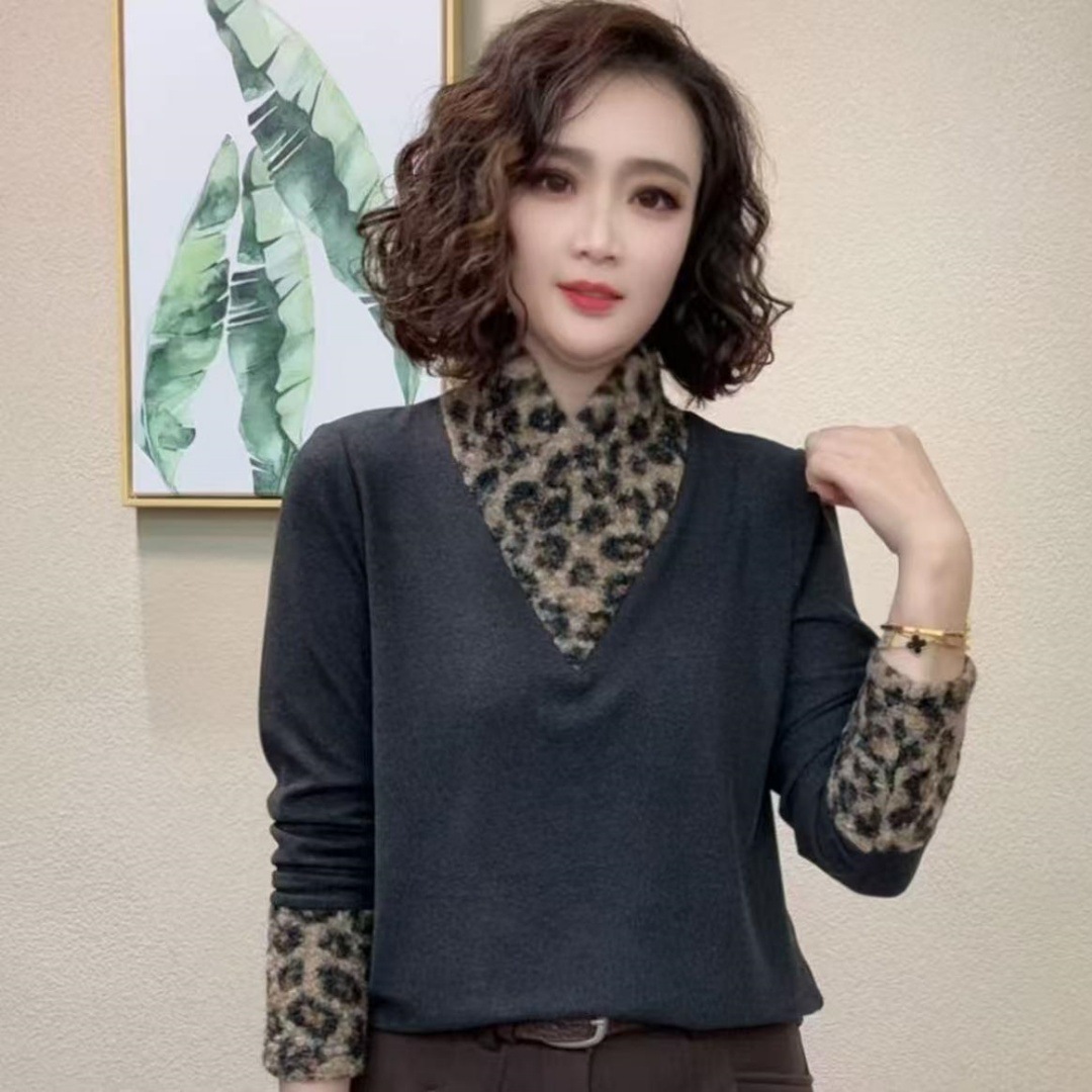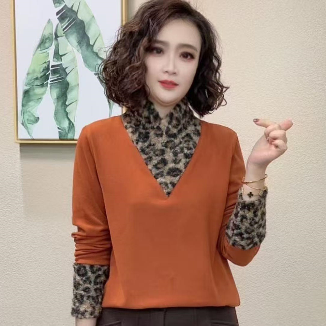 2025冬季新款双面绒妈妈装V领T恤时尚豹纹保暖打底衫百搭减龄上衣