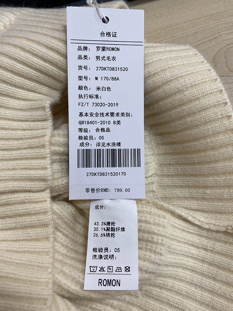 面料:43.3%腈纶 30.1%聚酯纤维 26.6%锦纶
