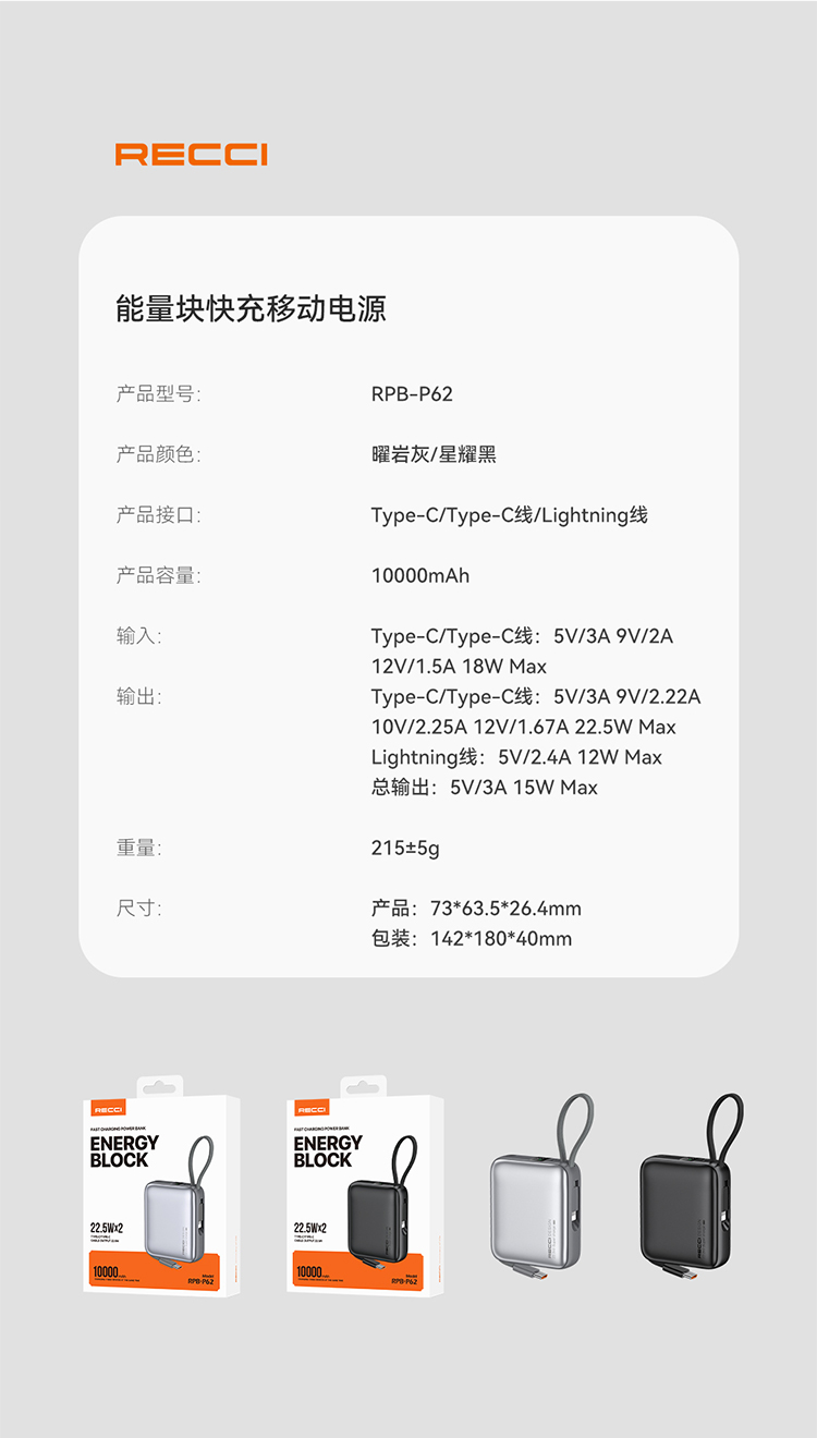 「好看又好用」锐思能量块快充移动电源 RPB-P62