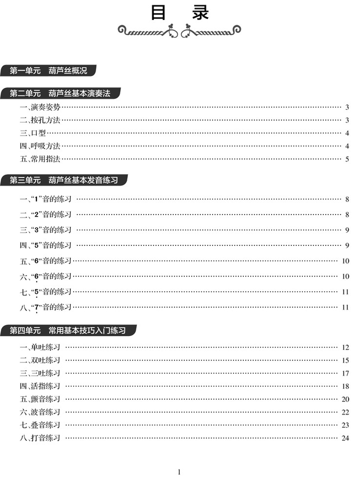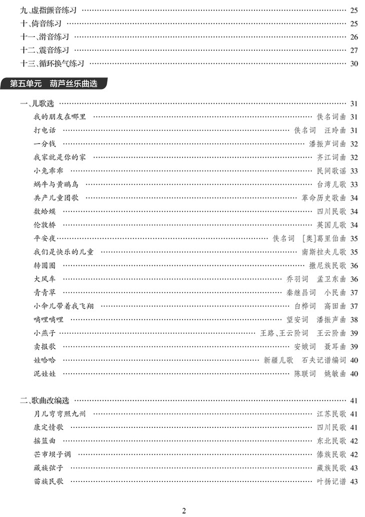 编者在单元分配上有些重复,可将第三单元的内容放在第二单元的第五讲里面,由此,该书共分五单元,分别为:葫芦丝概况、葫芦丝基本演奏法、葫芦丝基本发音练习、常用基本技巧入门练习、葫芦丝乐曲选。这样更适合作为初学教程的整体编排结构。