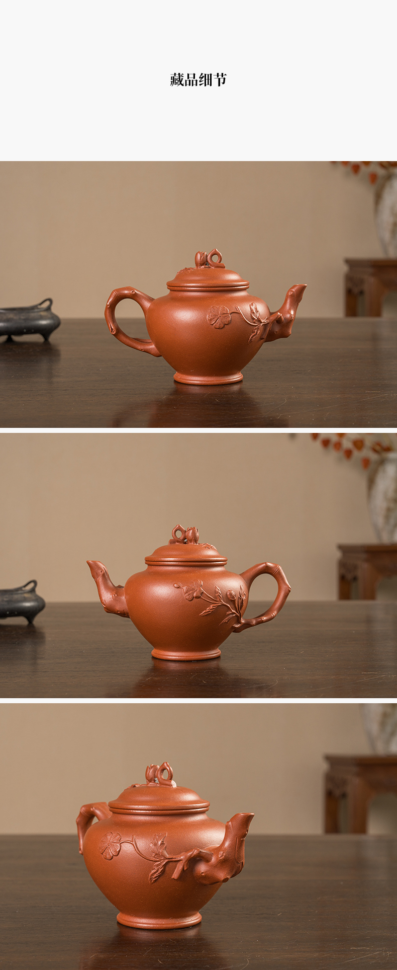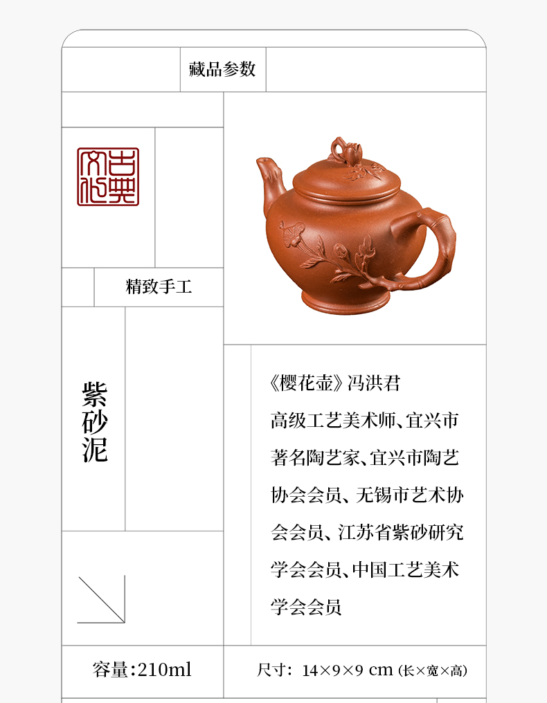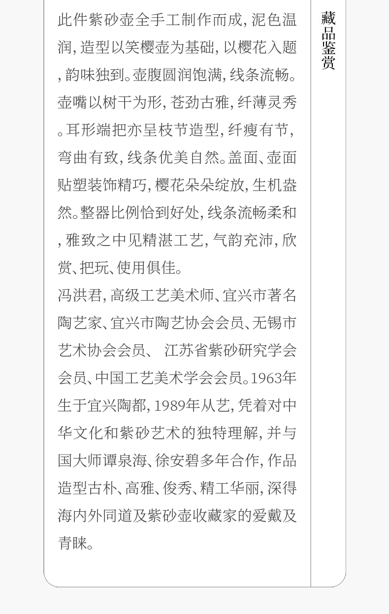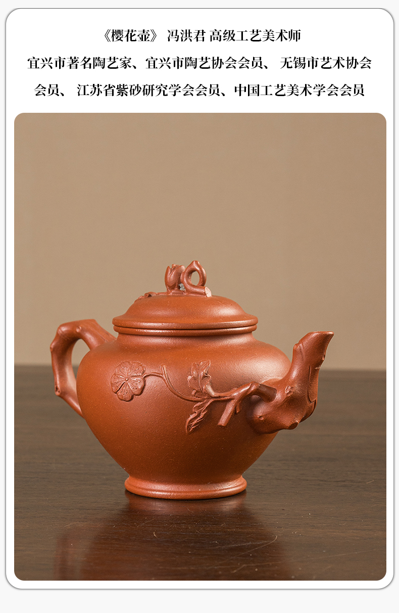 《樱花壶》 冯洪君 高级工艺美术师、宜兴市著名陶艺家、宜兴市陶艺协会会员、 无锡市艺术协会会员、 江苏省紫砂研究学会会员、中国工艺美术学会会员