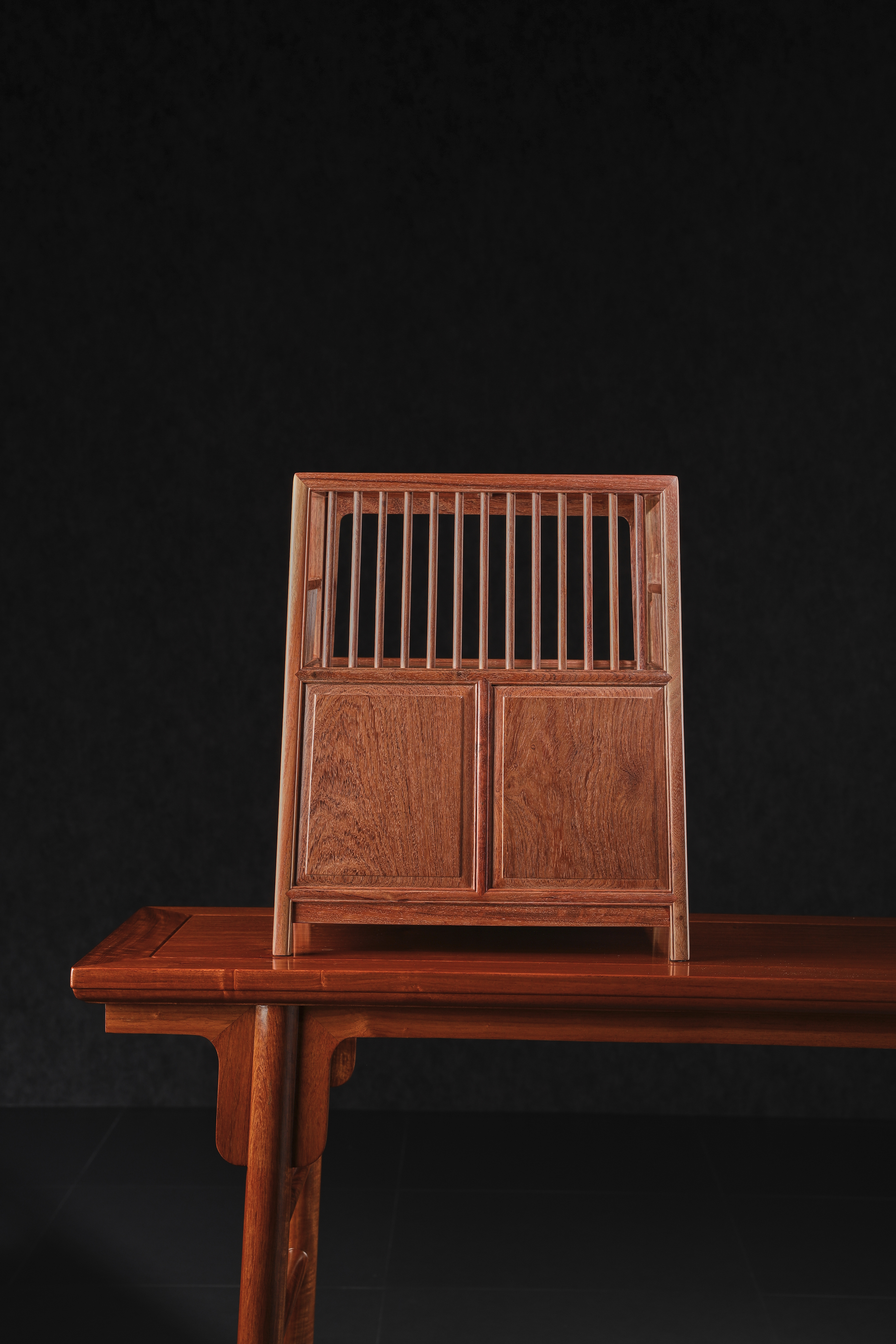 小茶水柜,造型源于万历柜,上部为架,下部为柜。上部采用直棂式造法,稀疏清朗,四围通透,挺拔又自带一份空灵气韵,承置器物,隽永文雅。下部设双柜门,中可置物品,如茶具,摆件,文玩等。