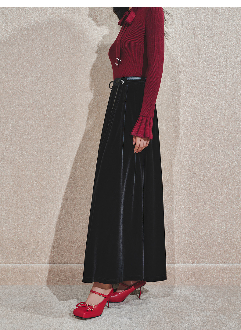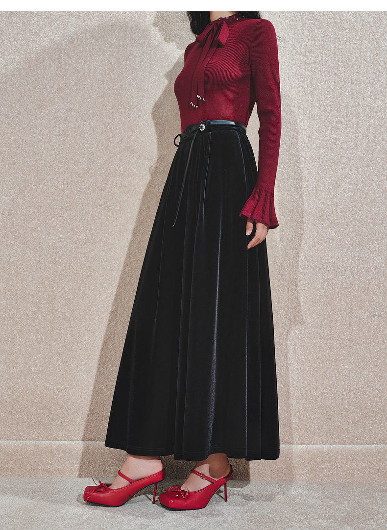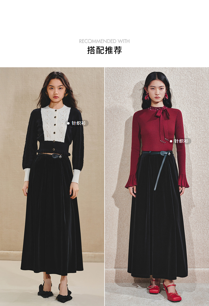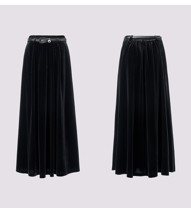MAXRIENY浪漫复古感A字丝绒半裙24冬新款法式赫本风高腰长裙修身(货号:MS85SK509)