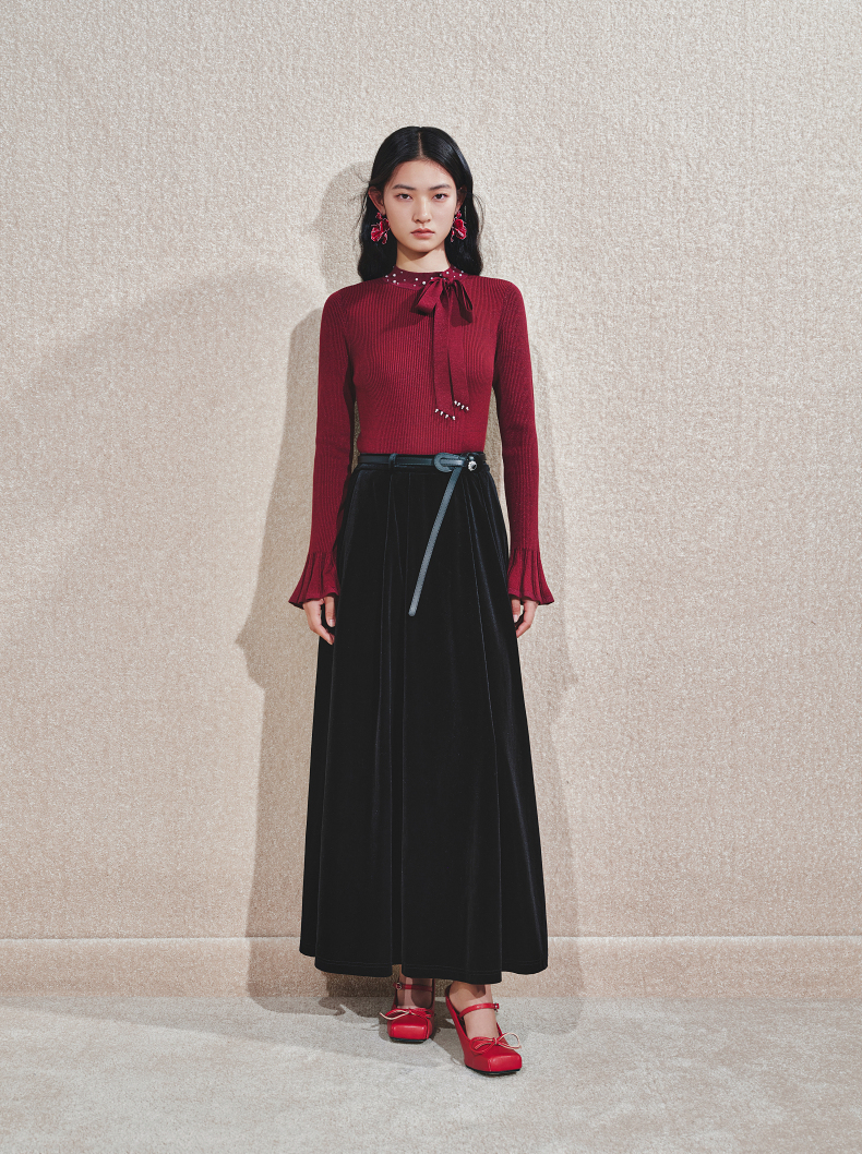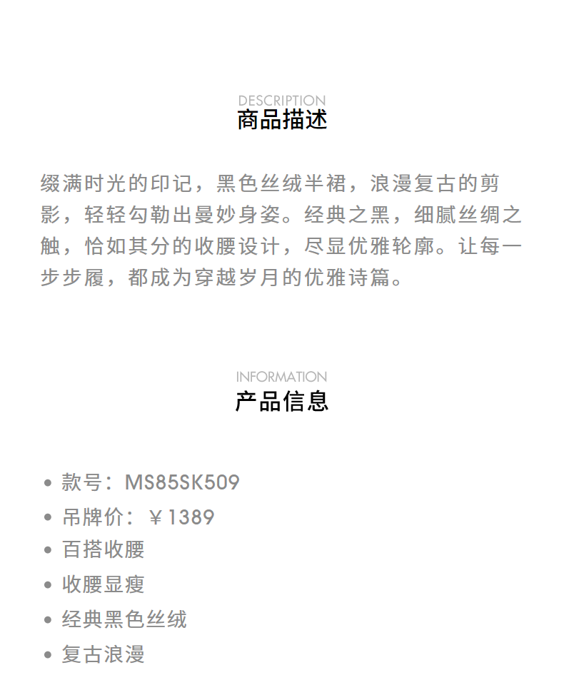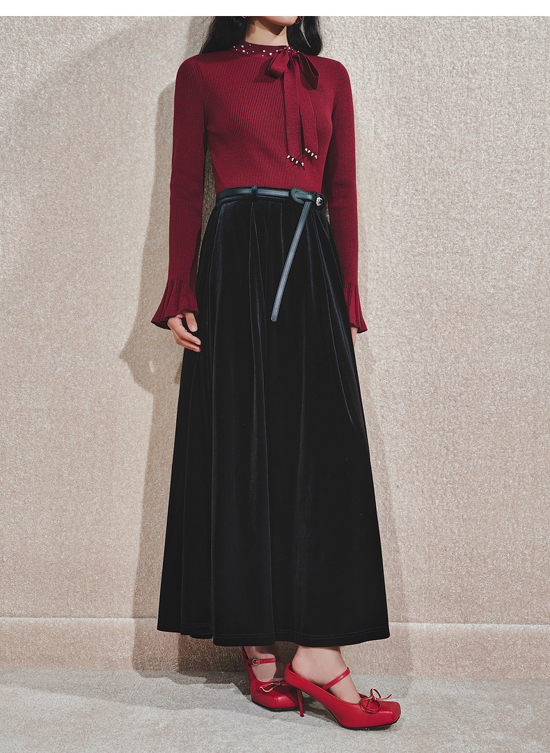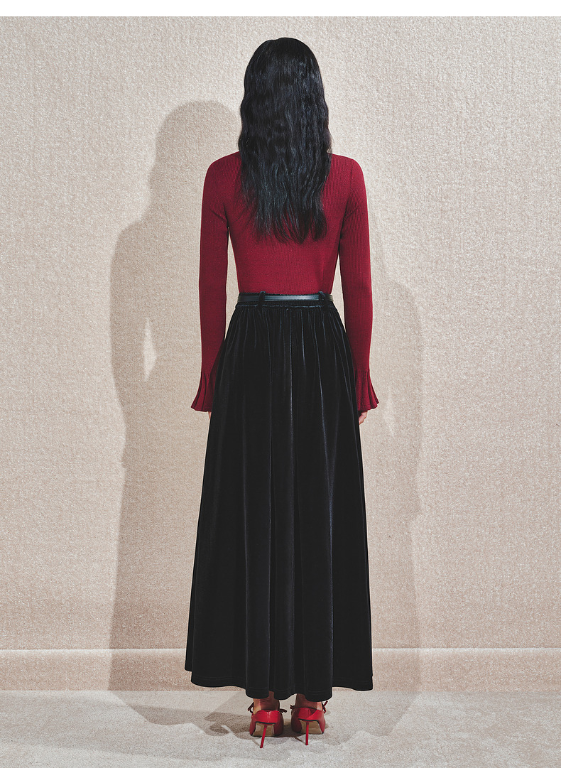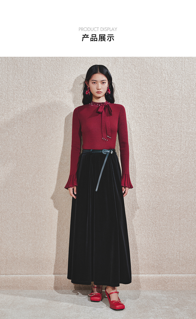 MAXRIENY浪漫复古感A字丝绒半裙24冬新款法式赫本风高腰长裙修身(货号:MS85SK509)
