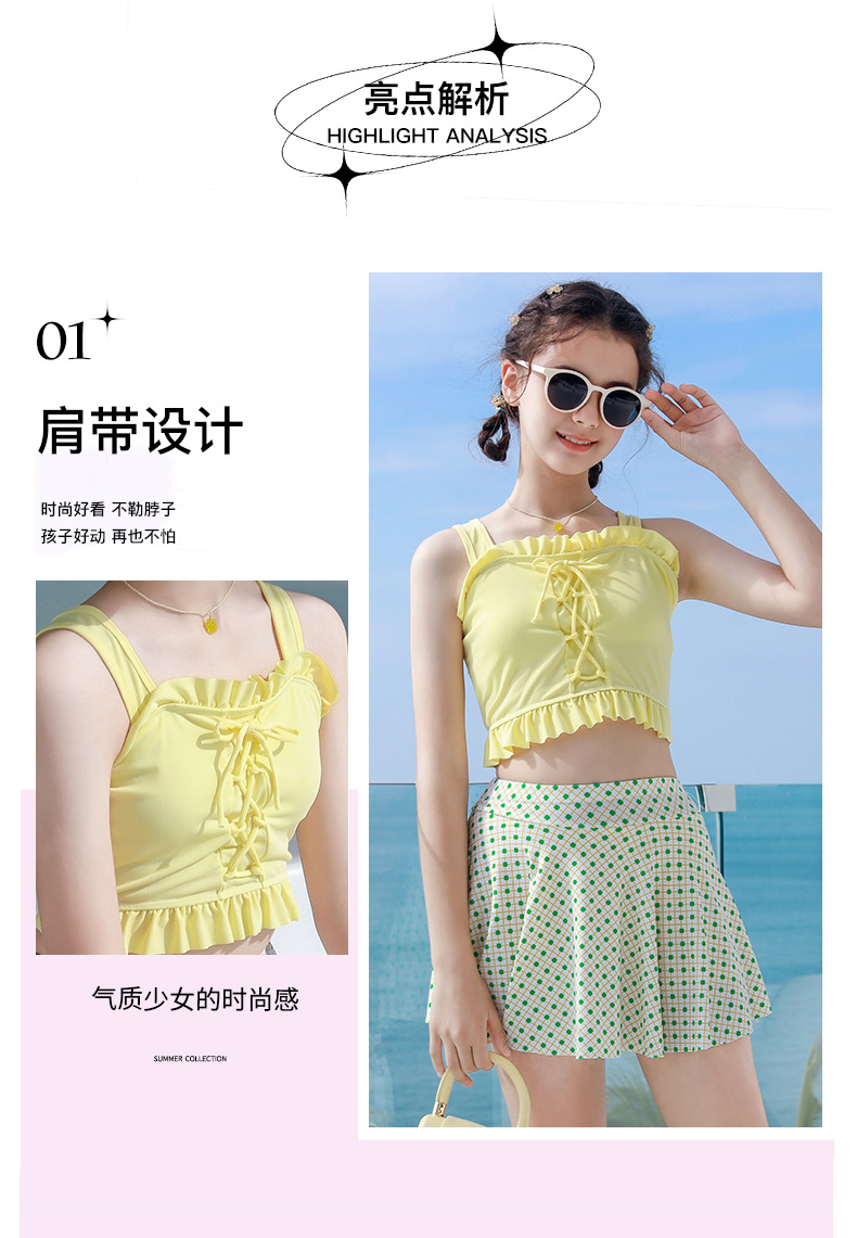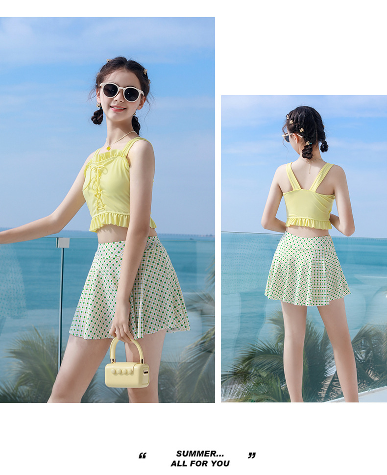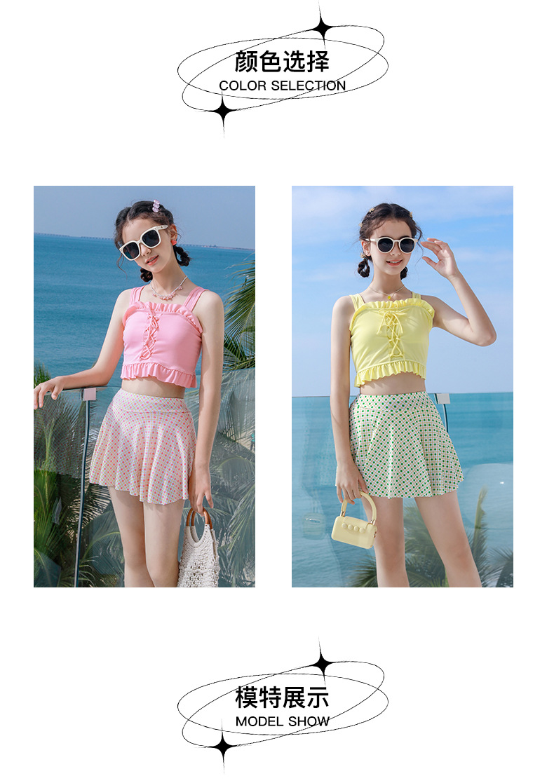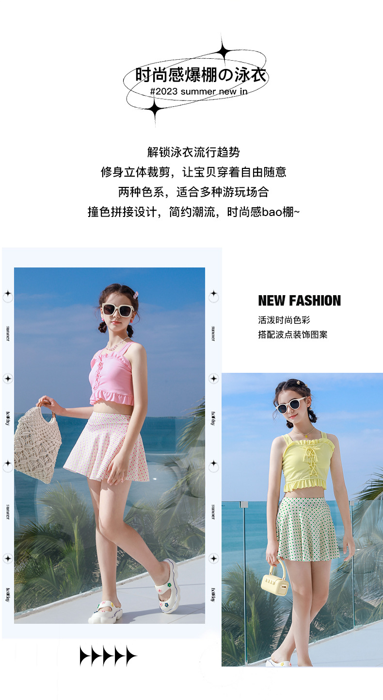 【甜美风分体泳衣,时尚感爆棚吸睛单品】撞色拼接设计 简约潮流儿童泳衣 女童新款中大童少女 可爱波点清新 无袖分体裙式 度假游泳衣-QQ