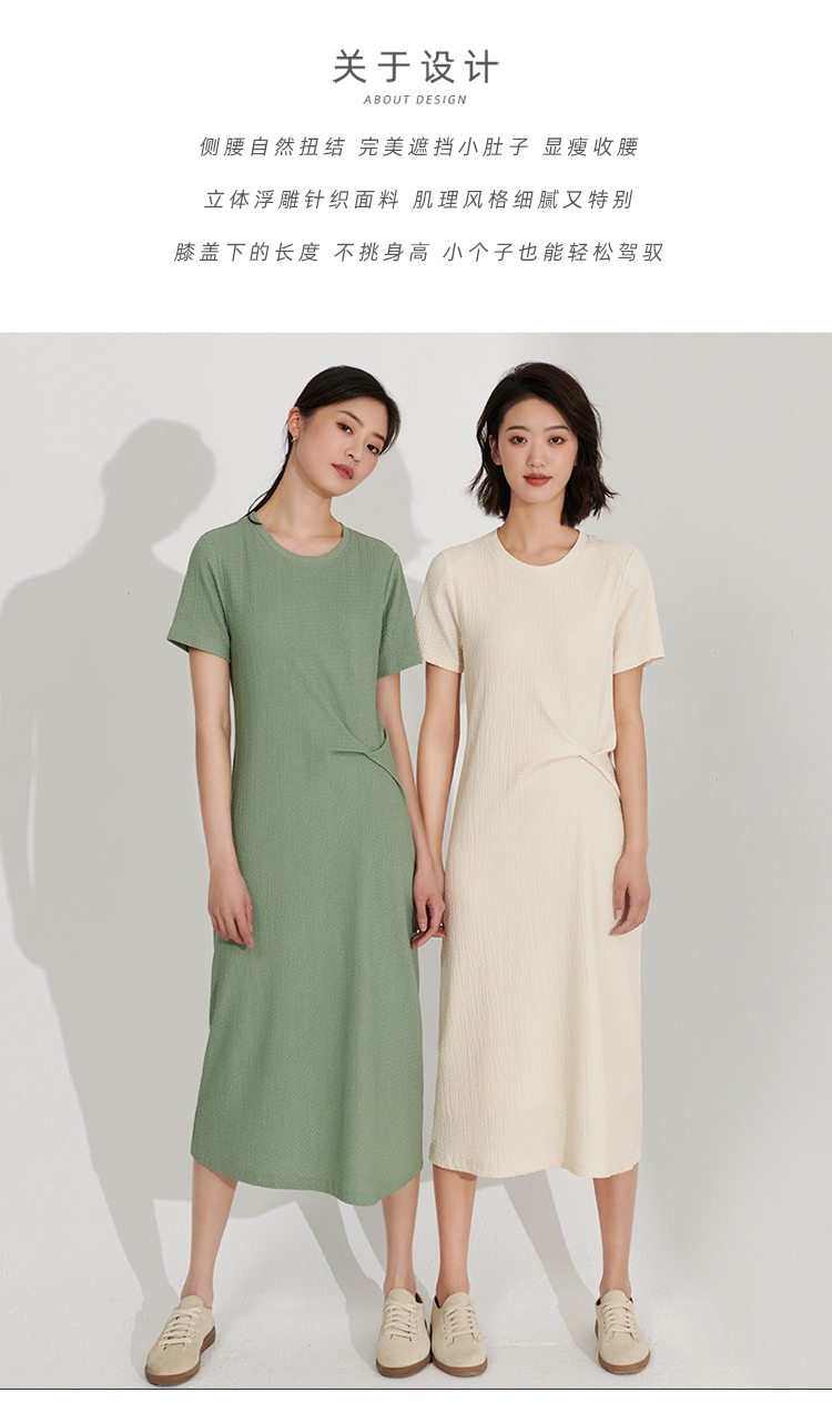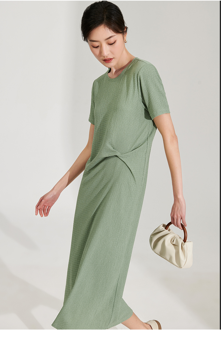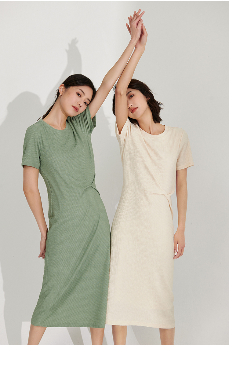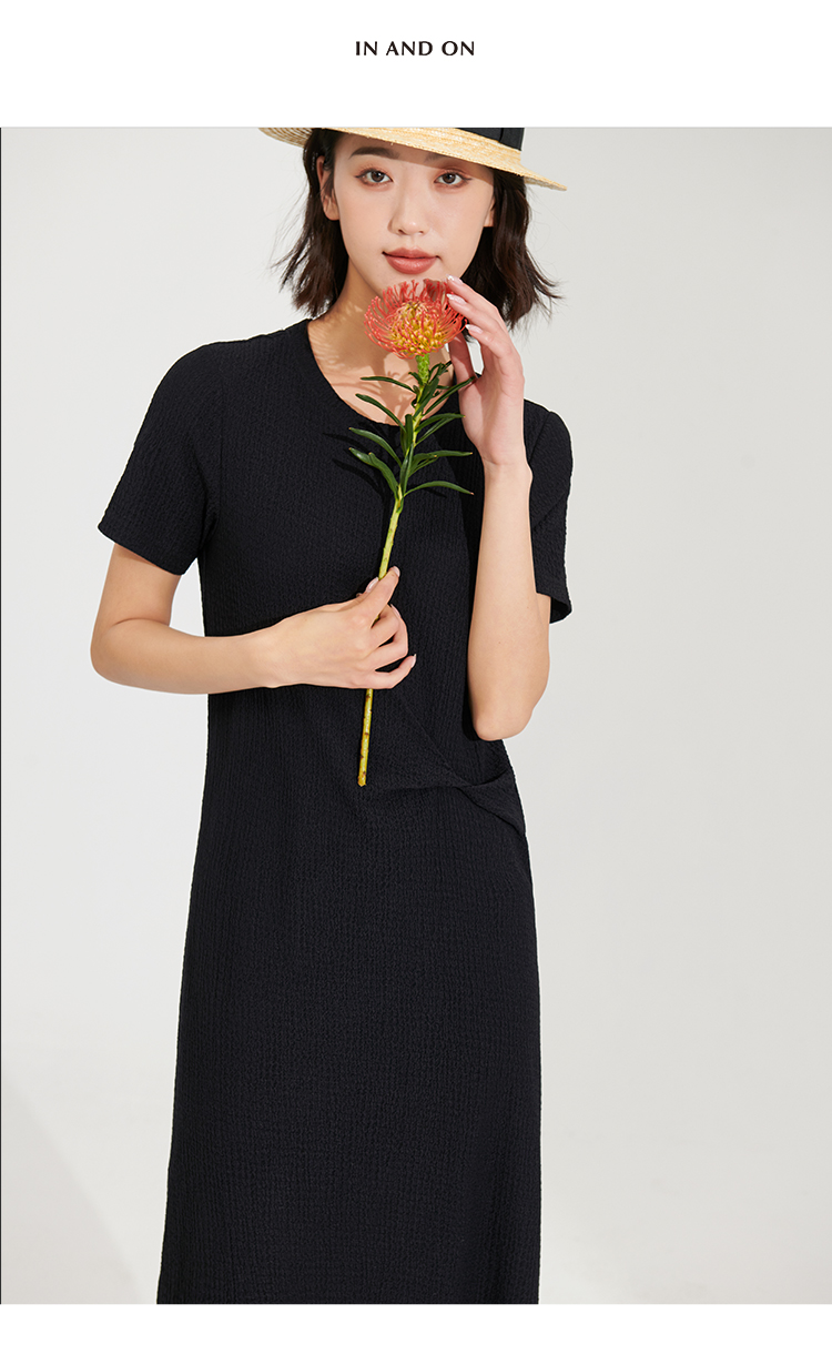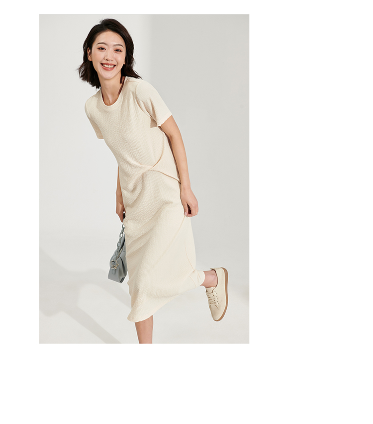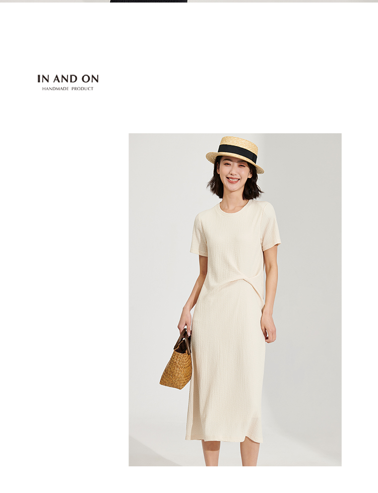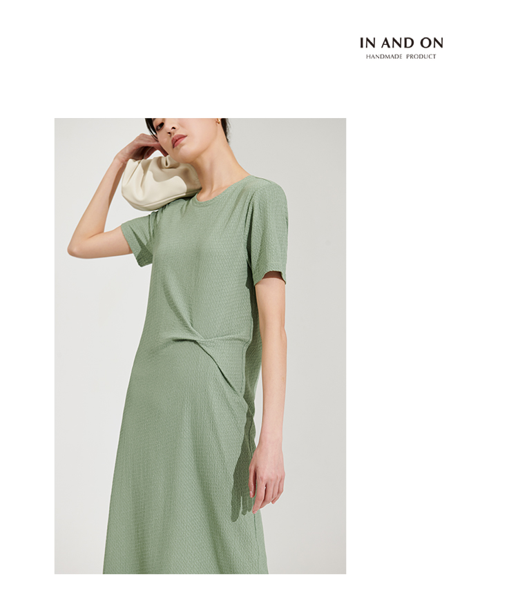 IN AND ON设计感水波纹扭结连衣裙女长款短袖圆领纯色简约长裙