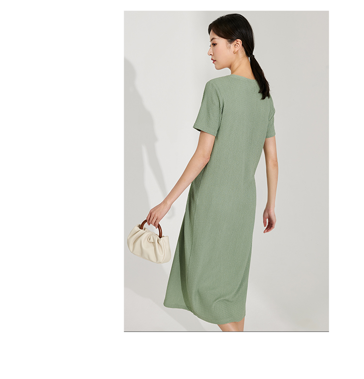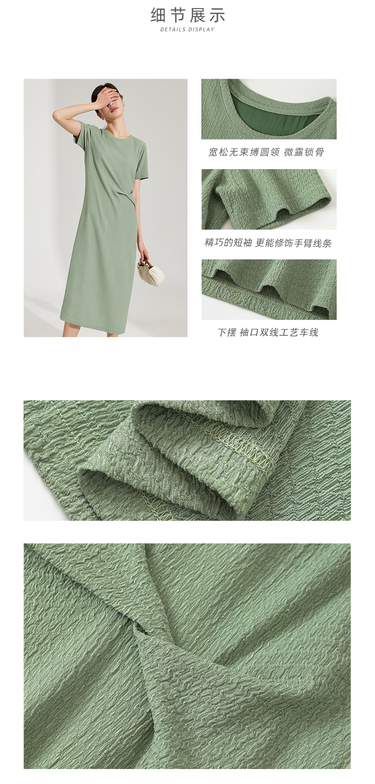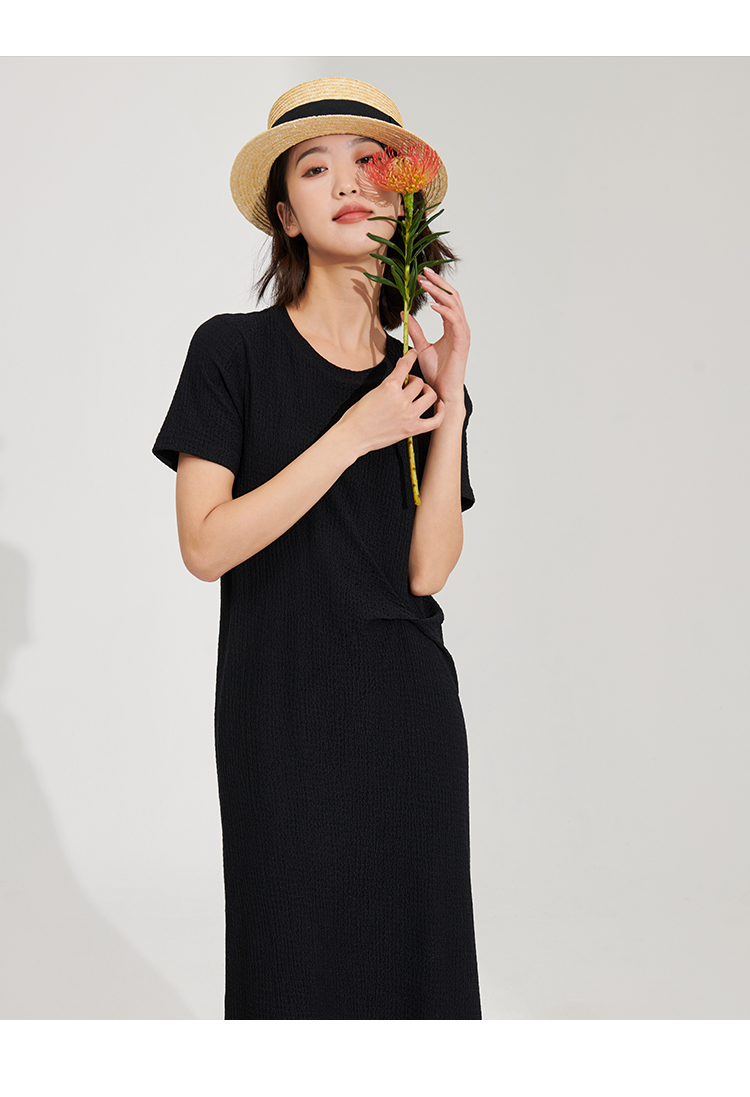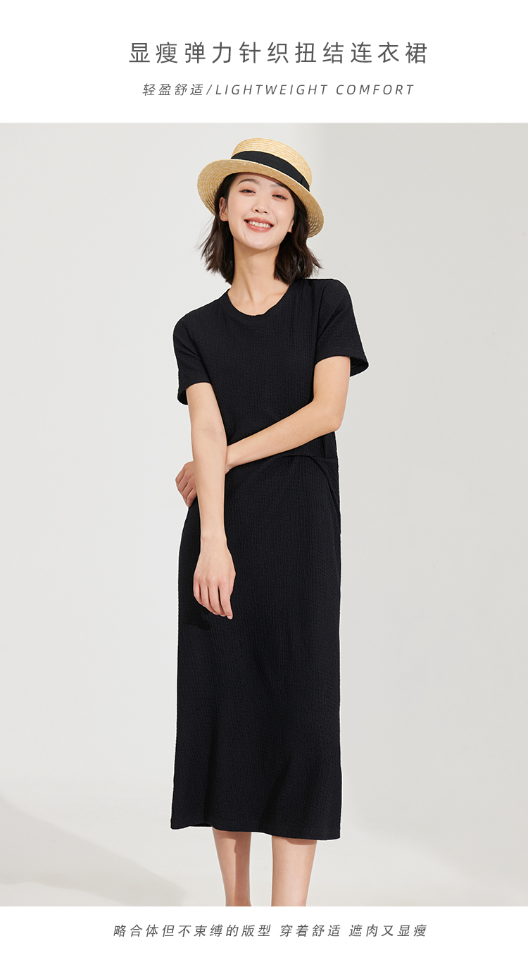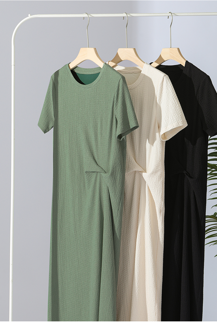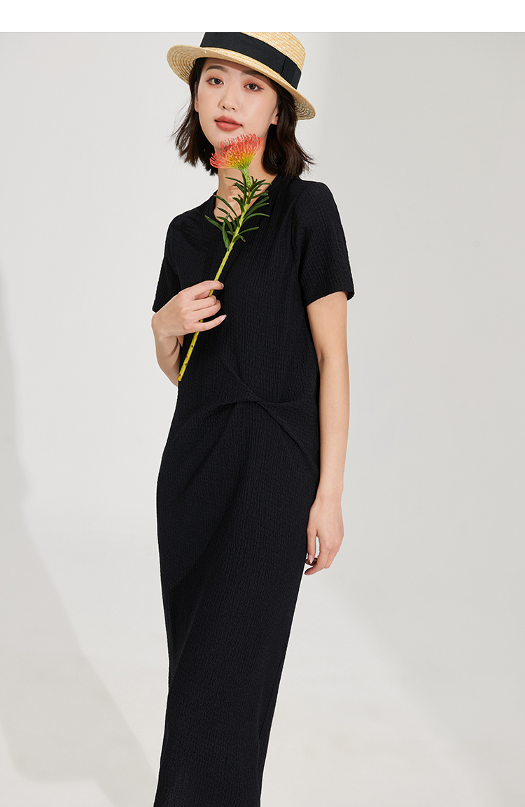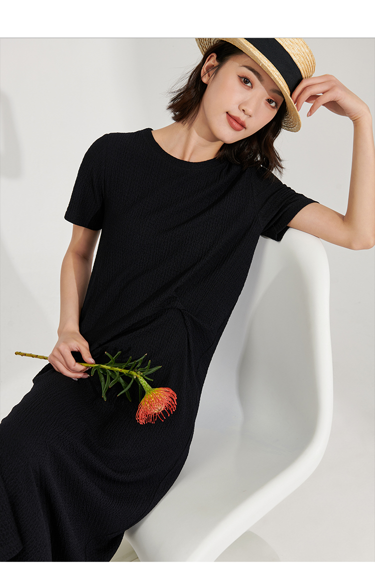 IN AND ON设计感水波纹扭结连衣裙女长款短袖圆领纯色简约长裙