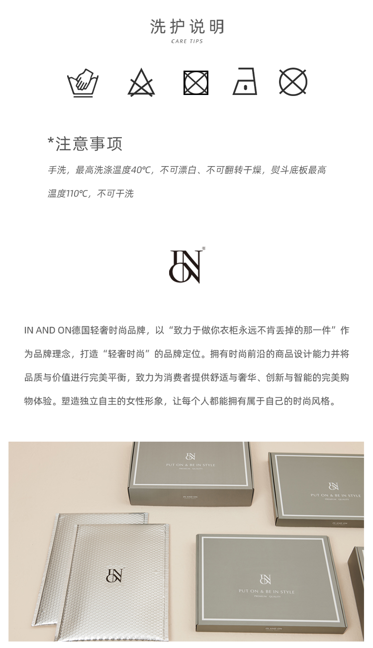 IN AND ON—轻奢时尚品牌,以“致力于做你衣柜永远不肯丢掉的那一件”作为品牌理念,打造“轻奢时尚”的品牌定位。拥有时尚前沿的商品设计能力并将品质与价值进行完美平衡,致力为消费者提供舒适与奢华、创新与智能的完美购物体验。塑造独立自主的女性形象,让每个人都能拥有属于自己的时尚风格。