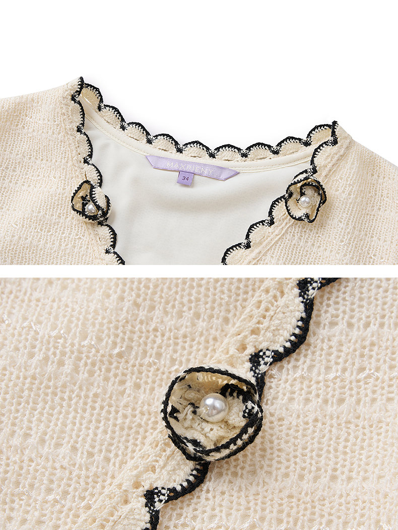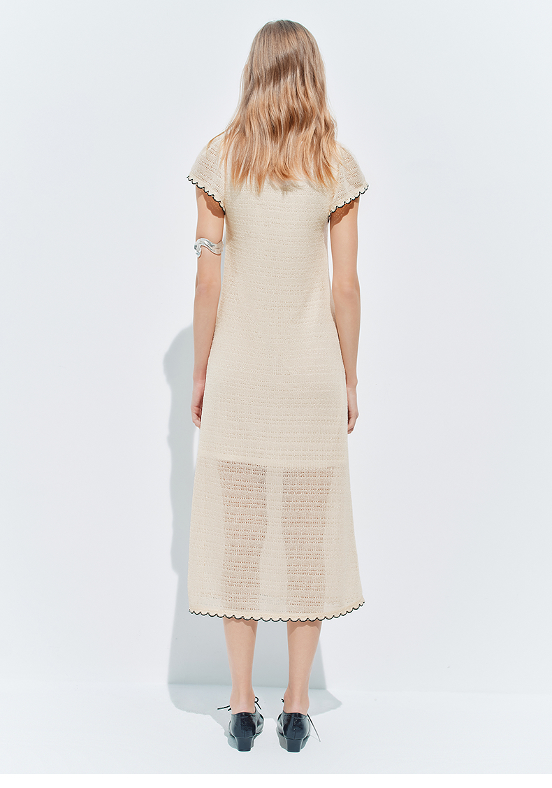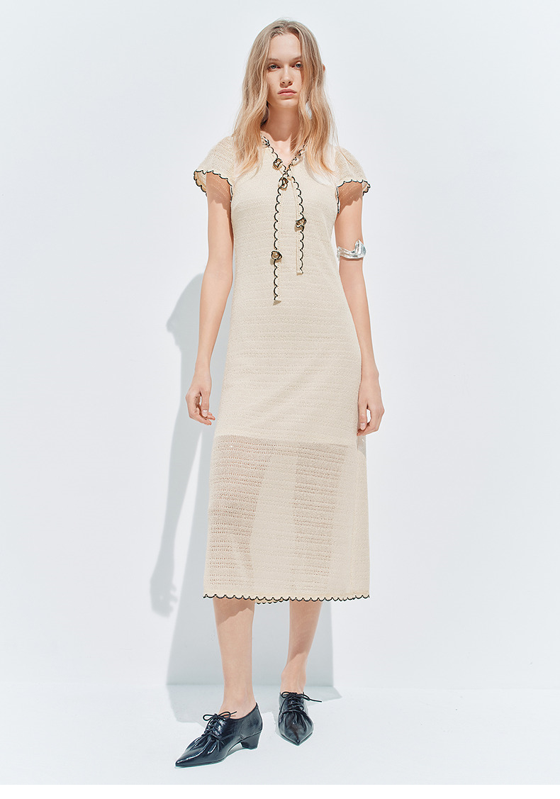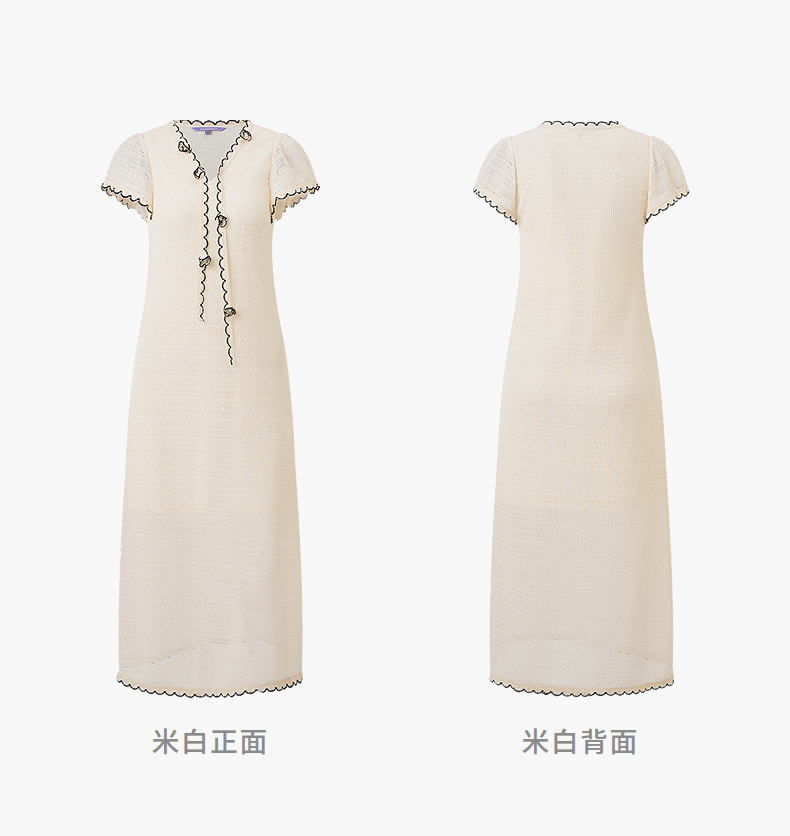 【SGPR】米白色手钩花连衣裙2026夏季新款中长款短袖V领撞色裙子(货号:MU80DR027)