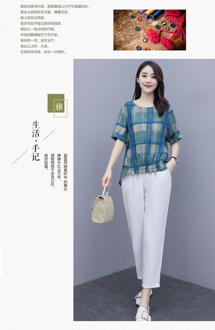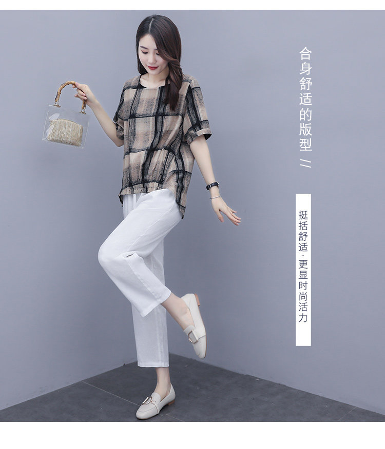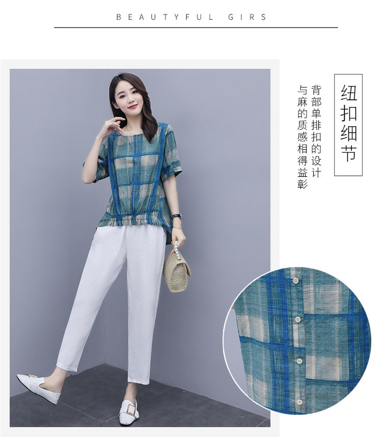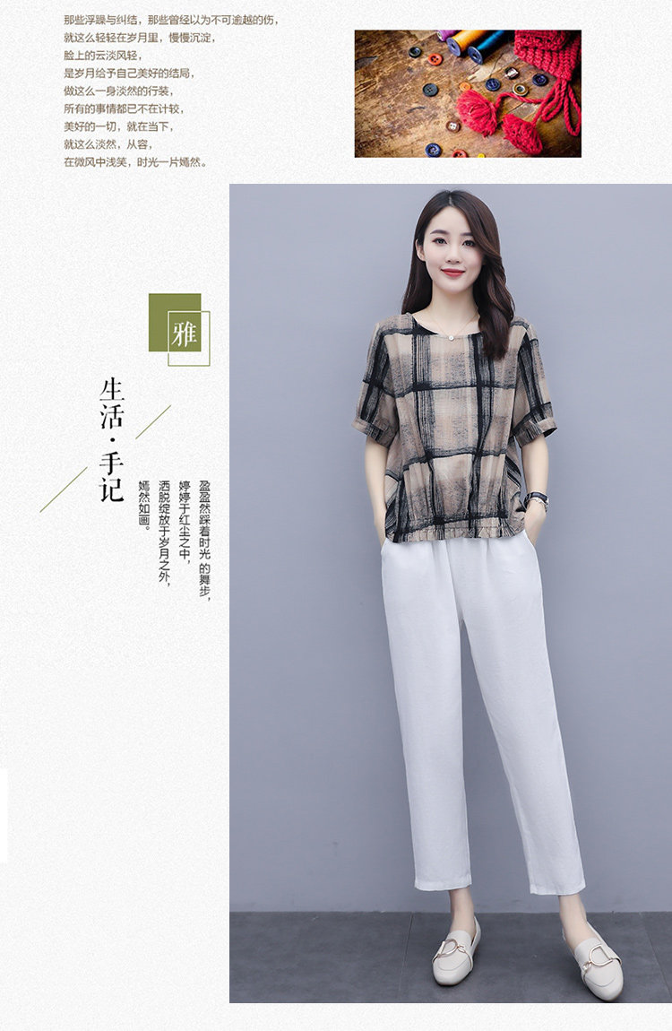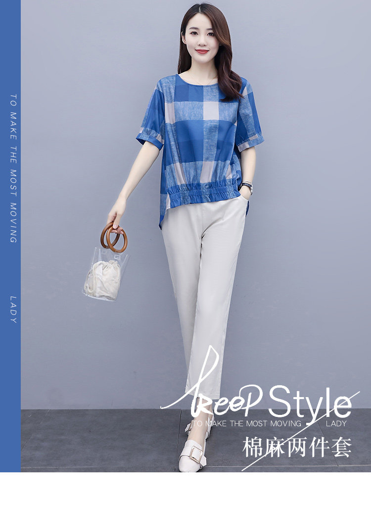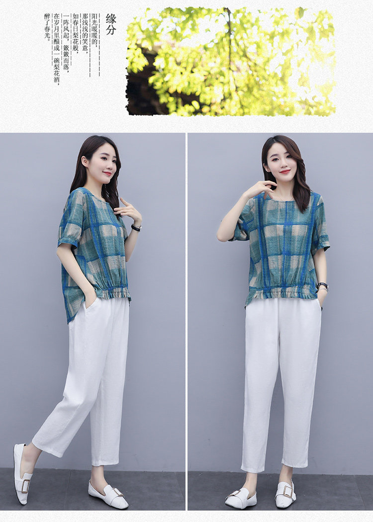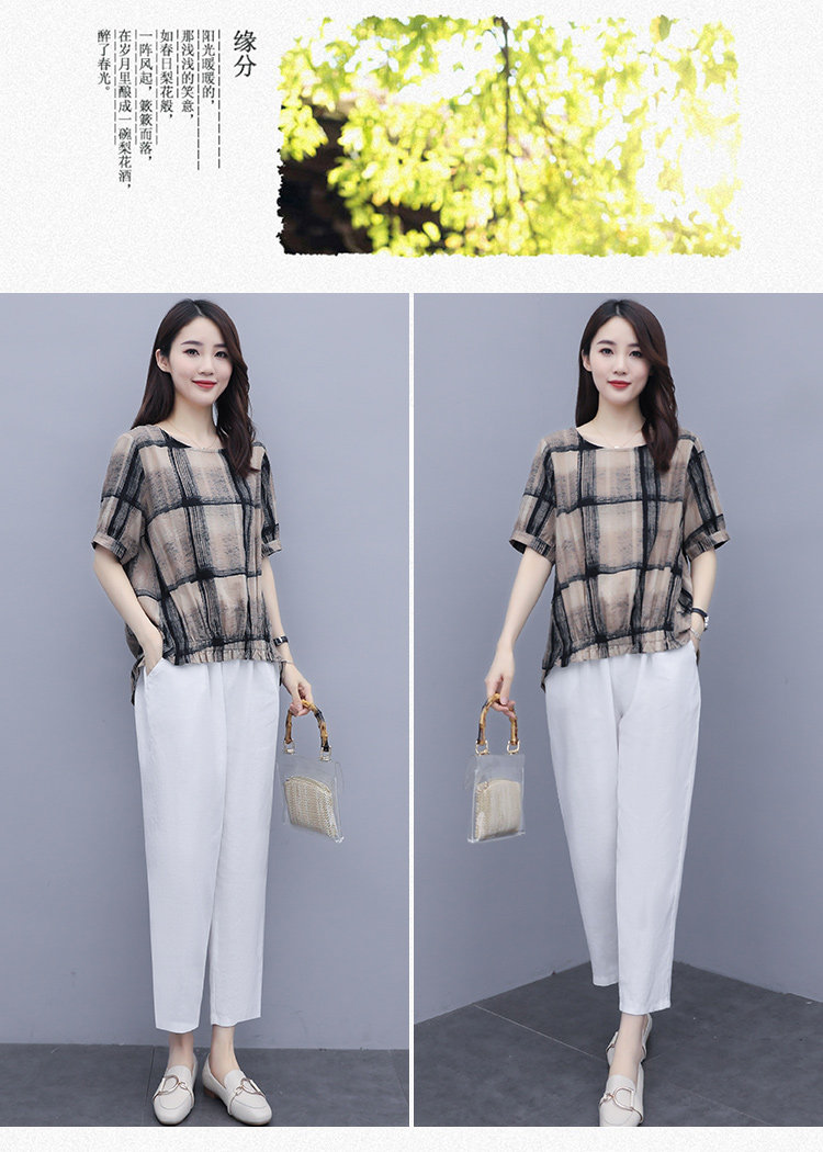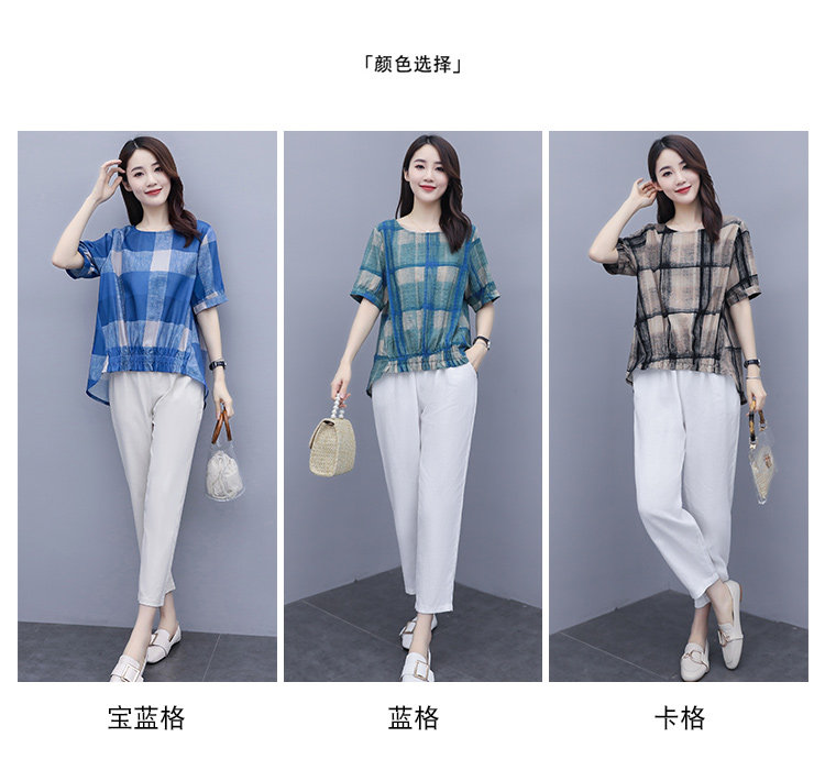 WZNH-WJ20359新品抽褶格纹棉麻休闲时尚两件套装