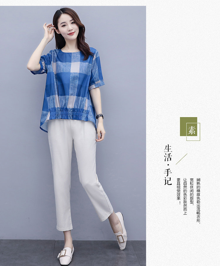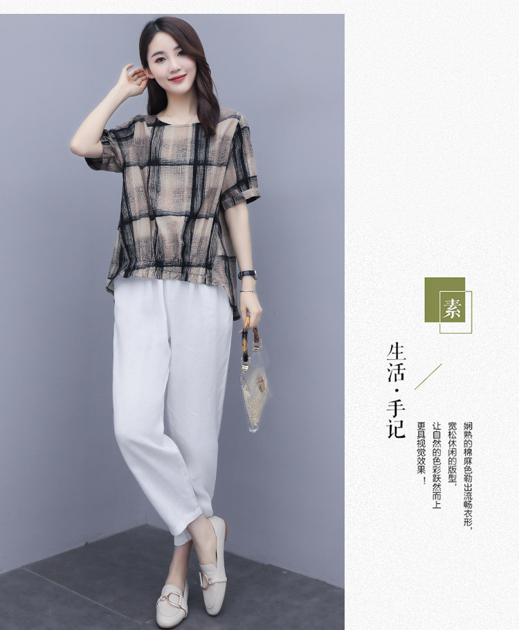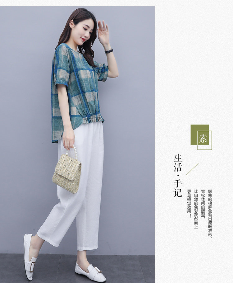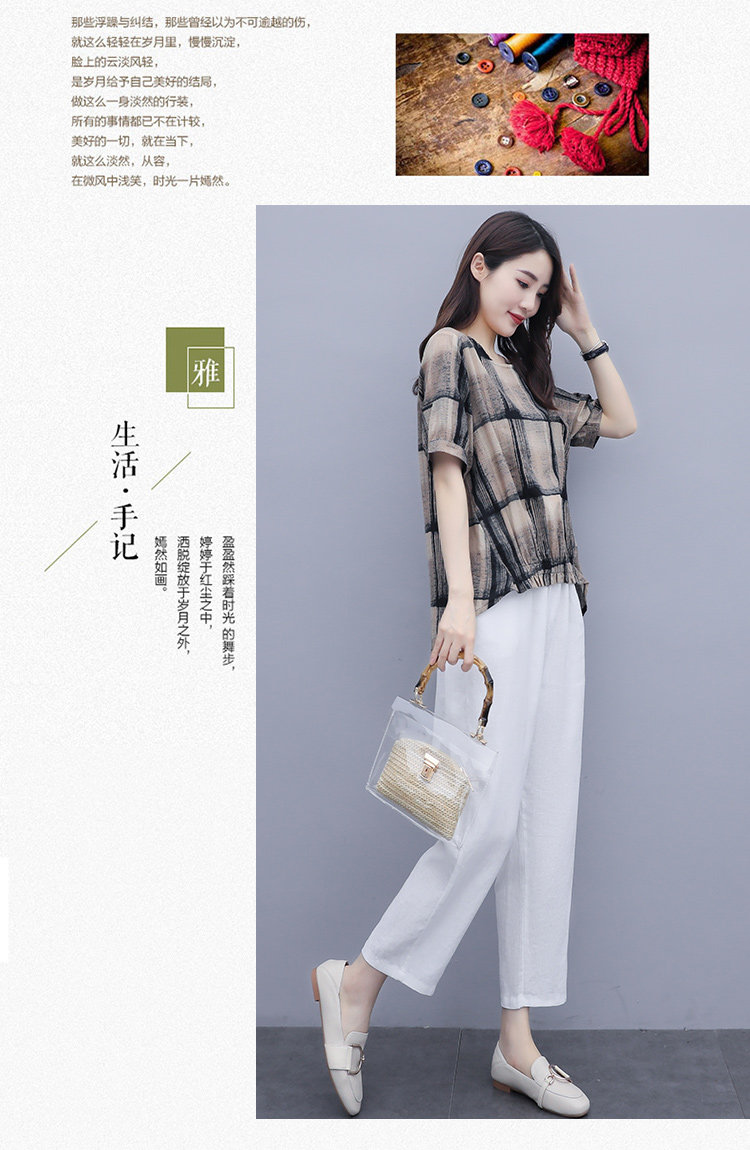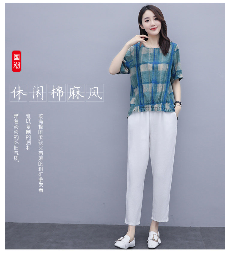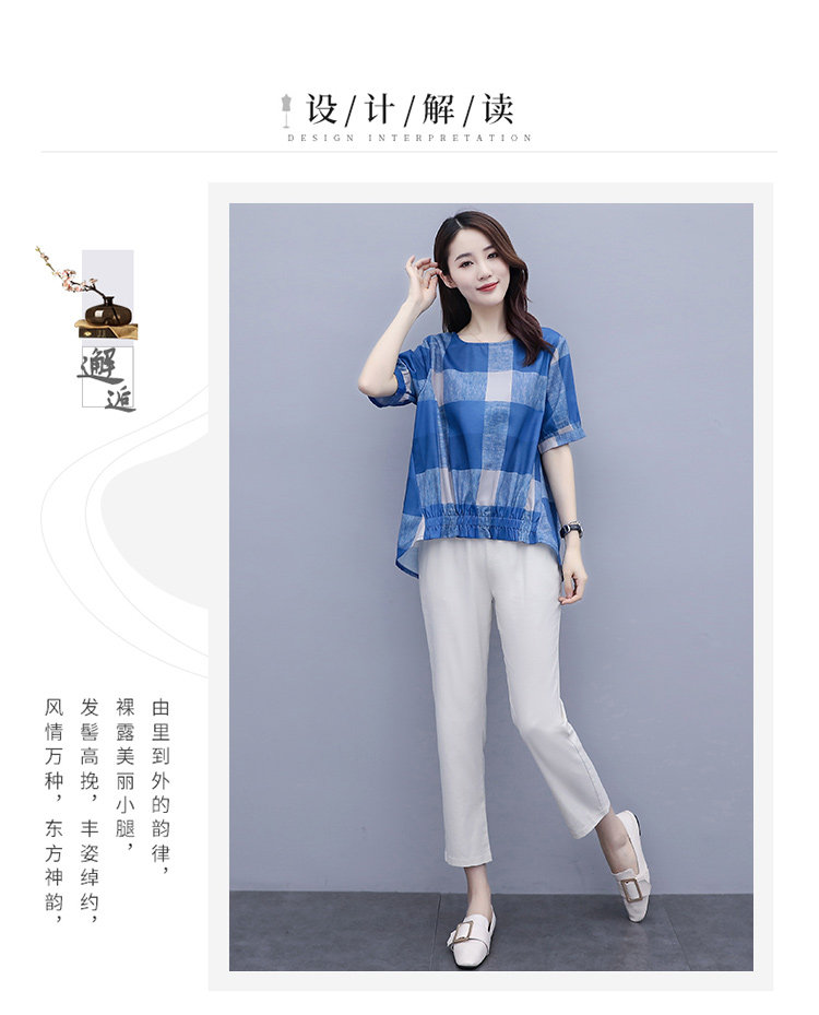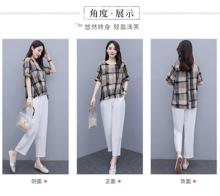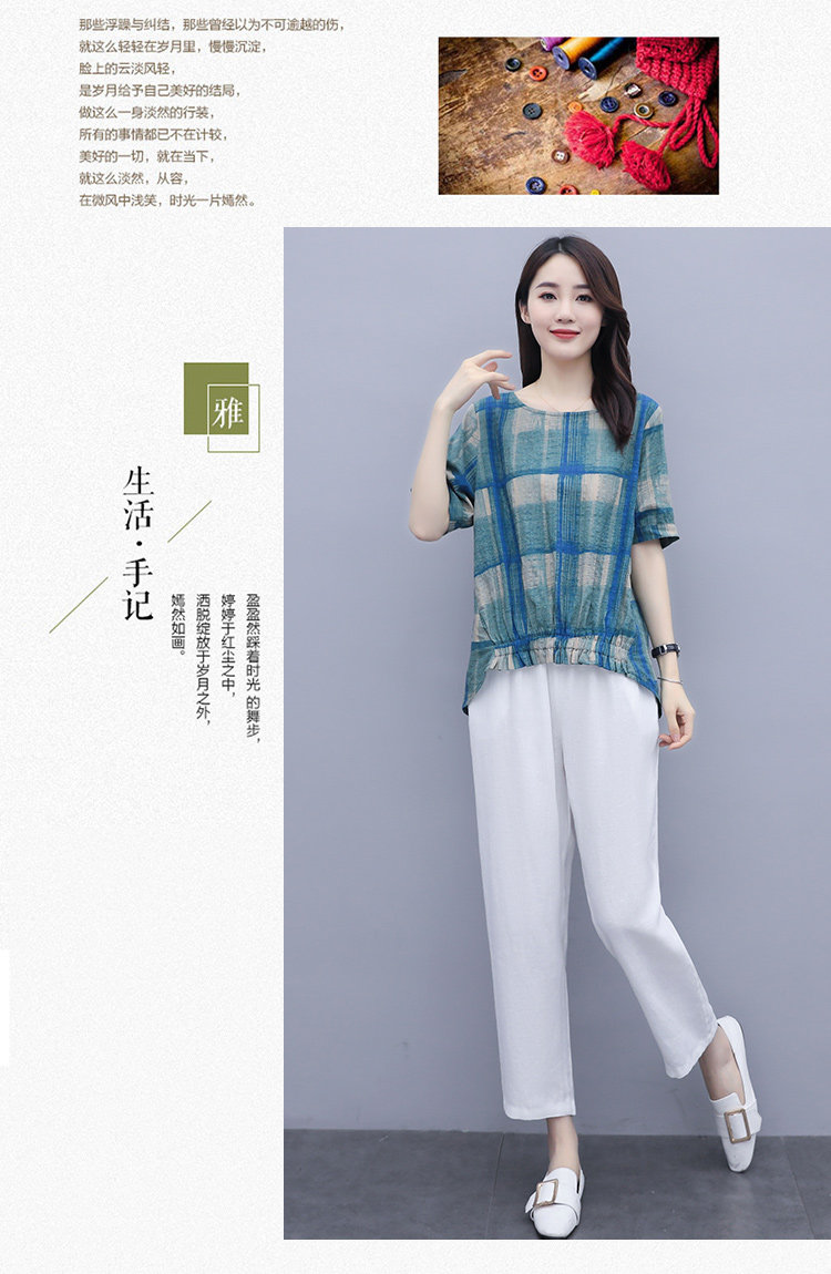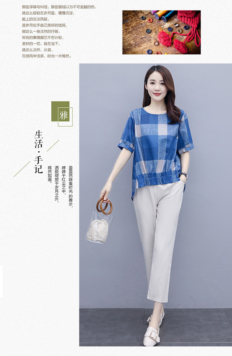 WZNH-WJ20359新品抽褶格纹棉麻休闲时尚两件套装