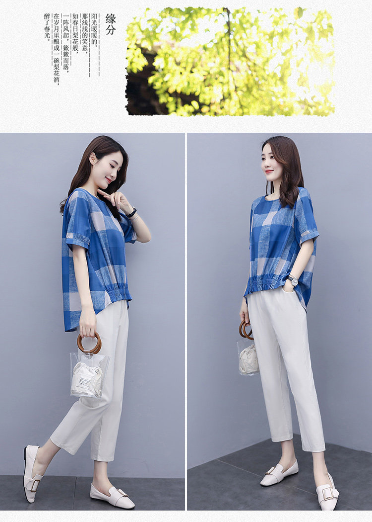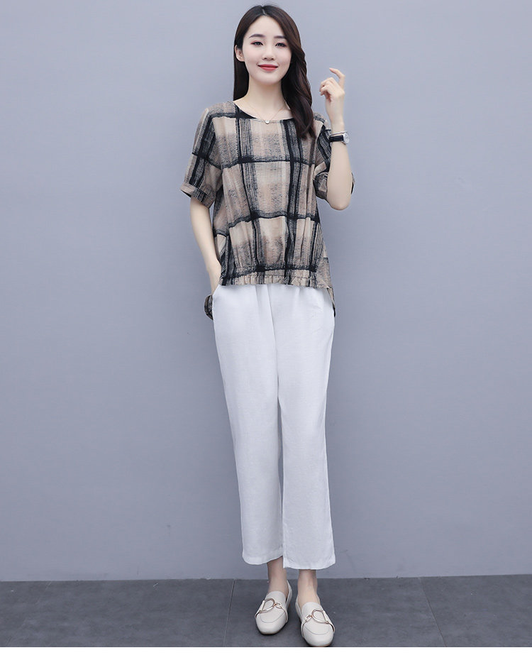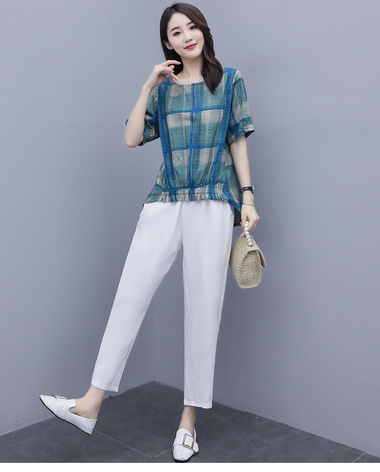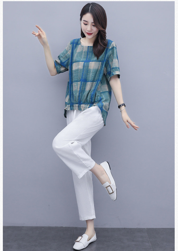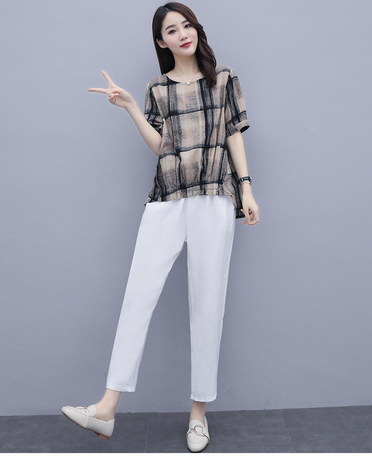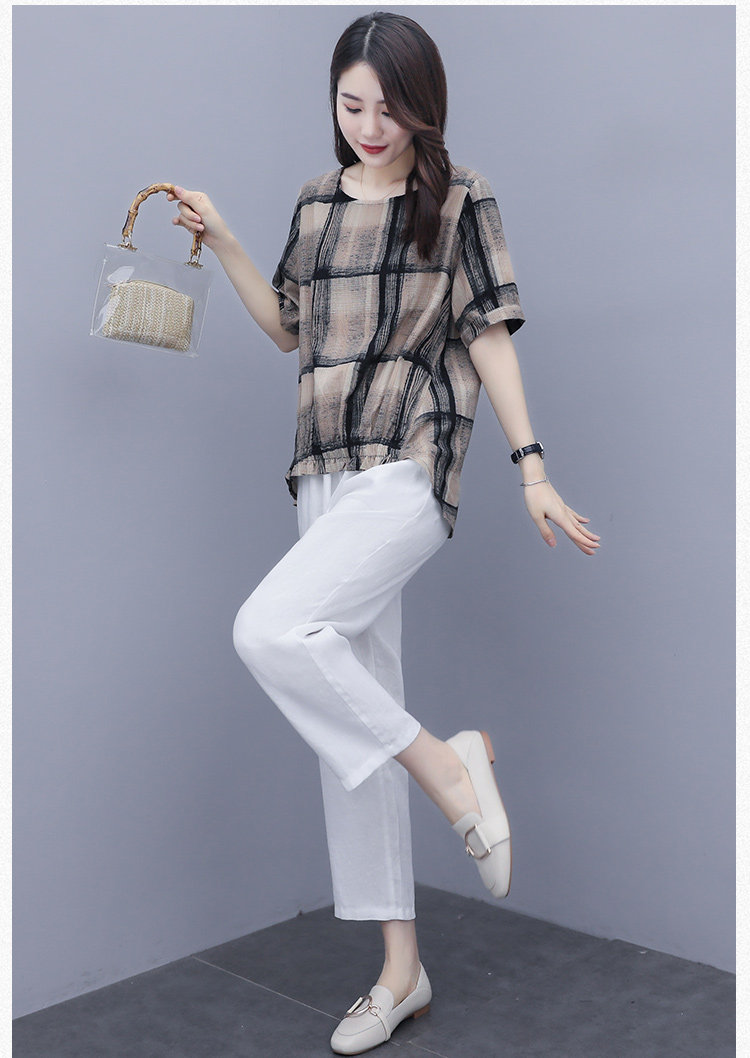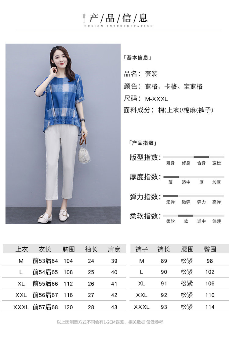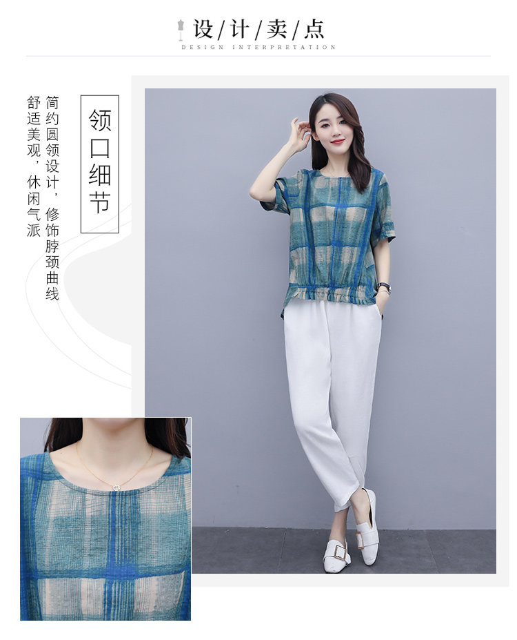 WZNH-WJ20359新品抽褶格纹棉麻休闲时尚两件套装