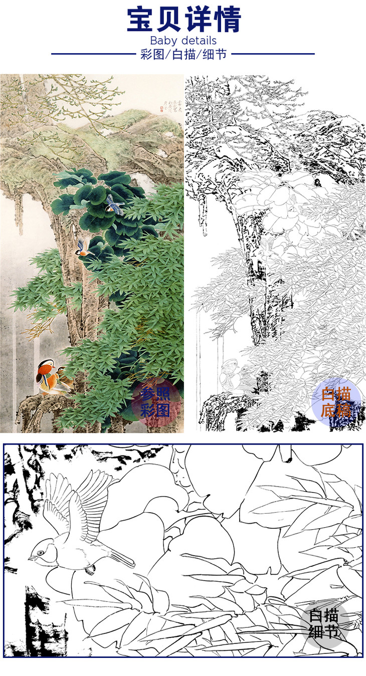 竖幅工笔花鸟白描底稿-鸳鸯-周彦生《粤海春早》-多种白描尺寸可选-QN02